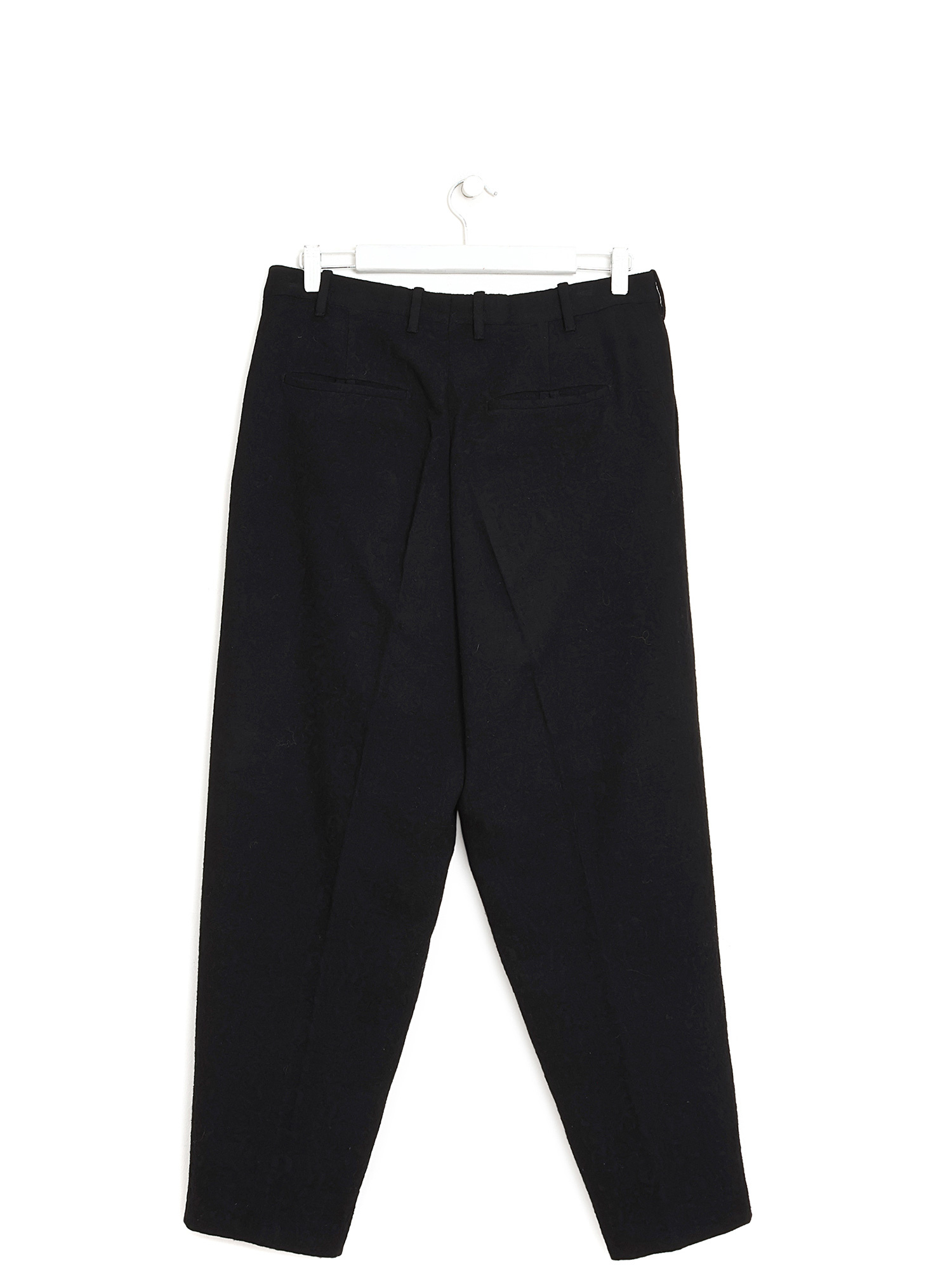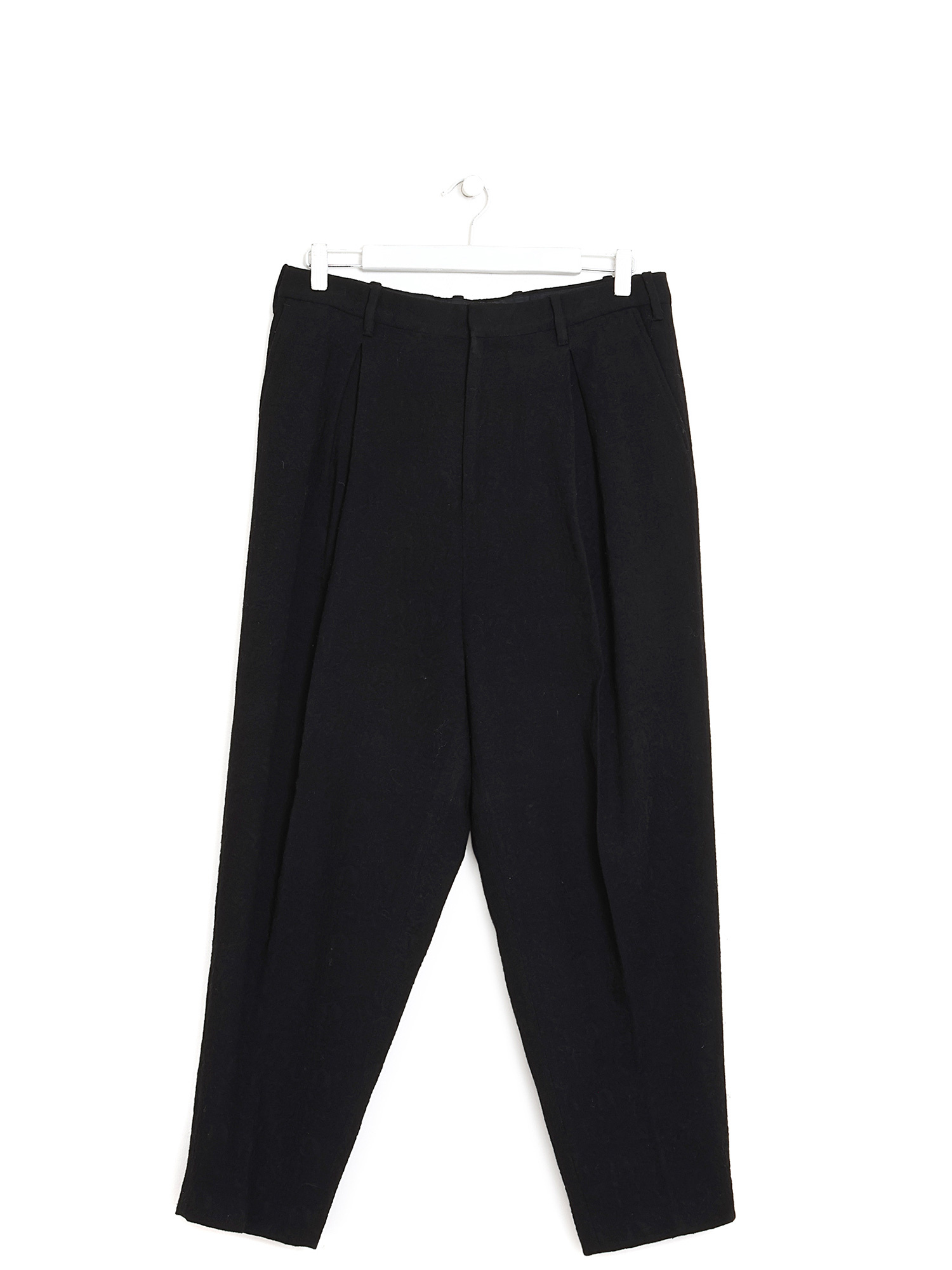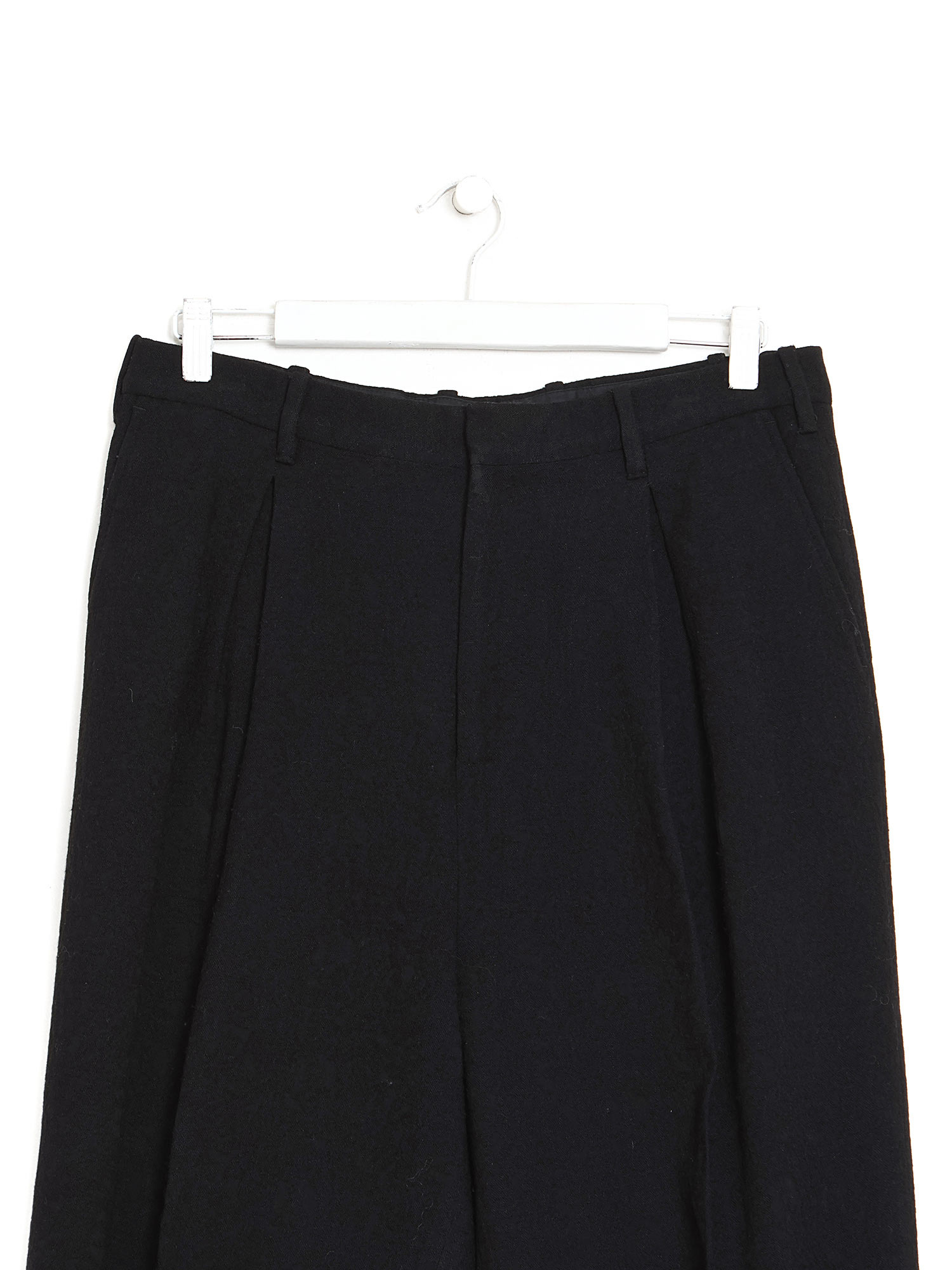 Classic black wool trousers with pleats on the legs.