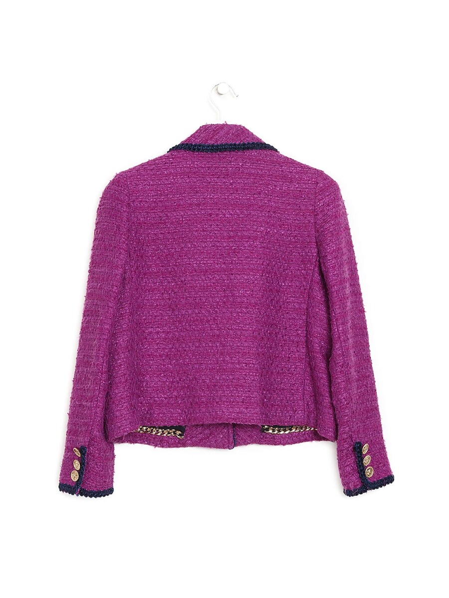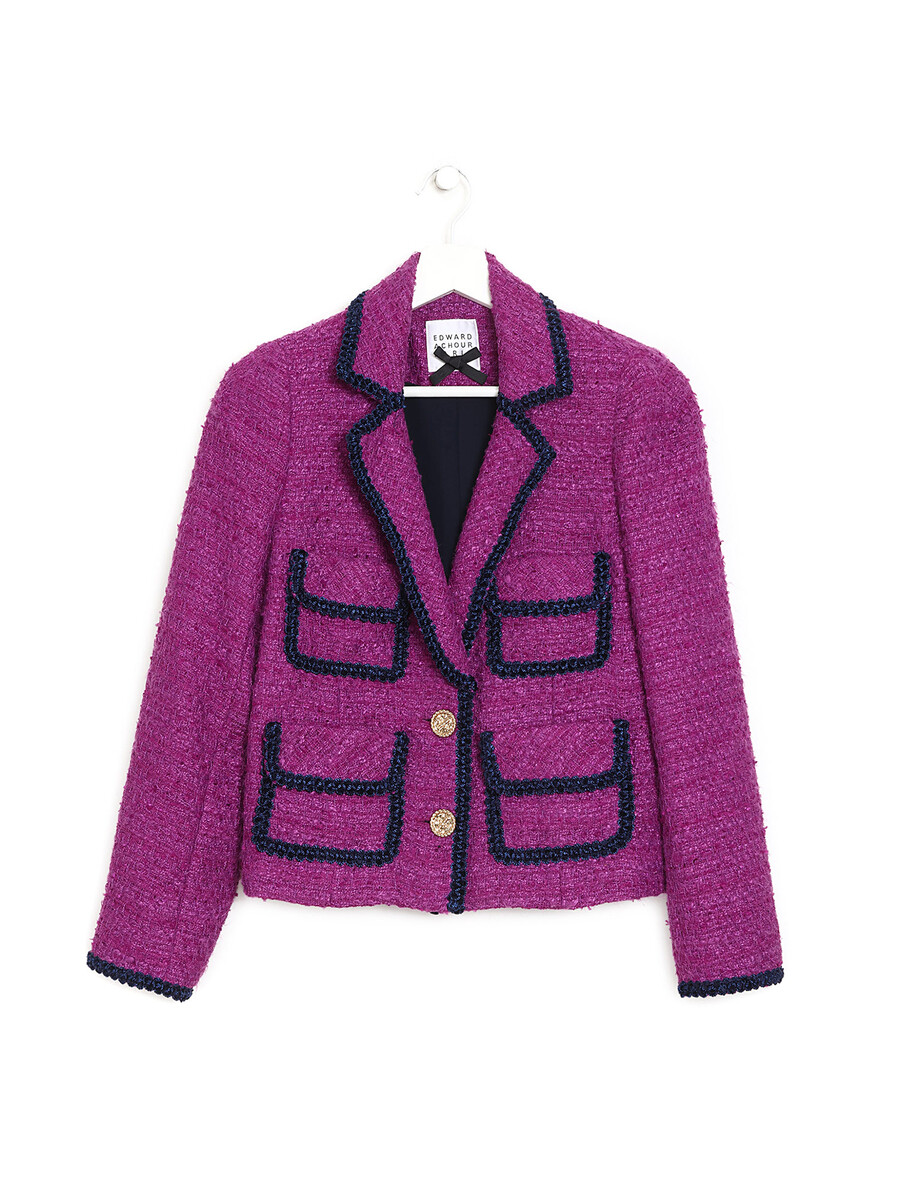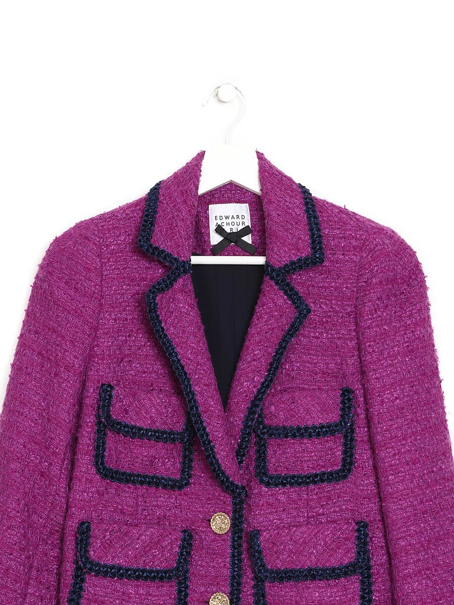 Purple tweed wool jacket featuring four front patch pockets. Contrast piping. Button closures at front. Relaxed fit. Subtle fraying at edges.