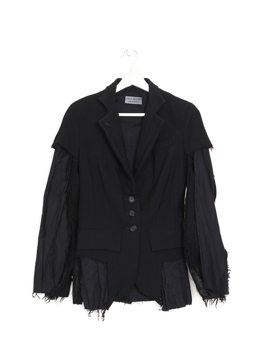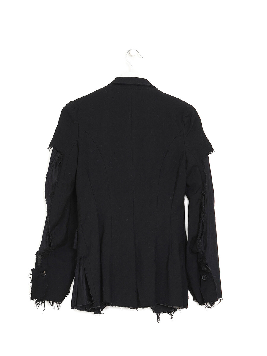 Black wool blazer featuring deconstructed sleeves. Notched lapel collar. Minimalist style with tailored details.