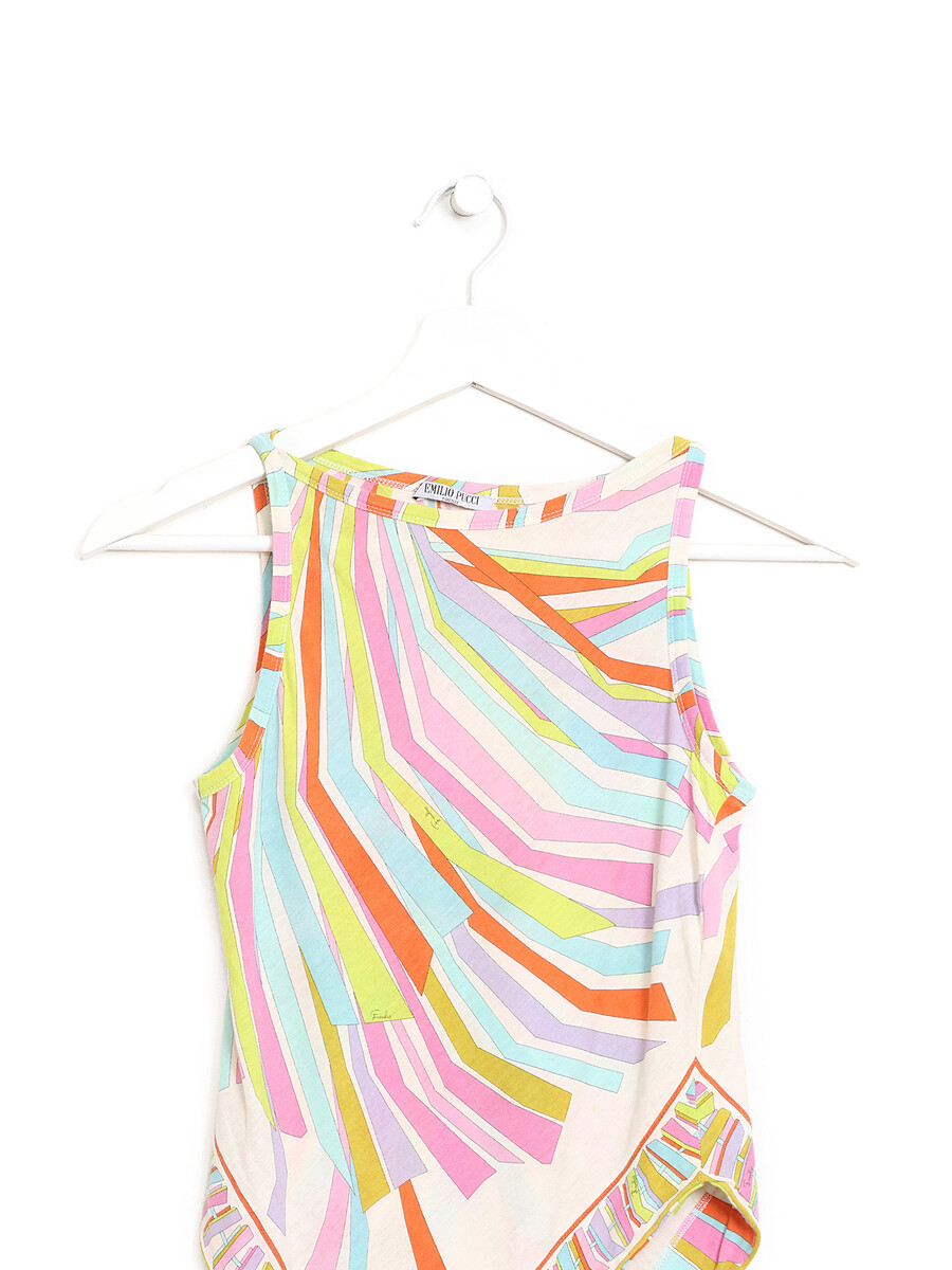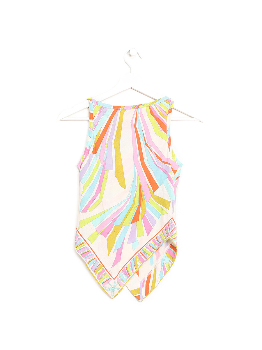 Sleeveless top with a vibrant graphic print in multicolor tones. Round neck. Lightweight and breathable fabric.