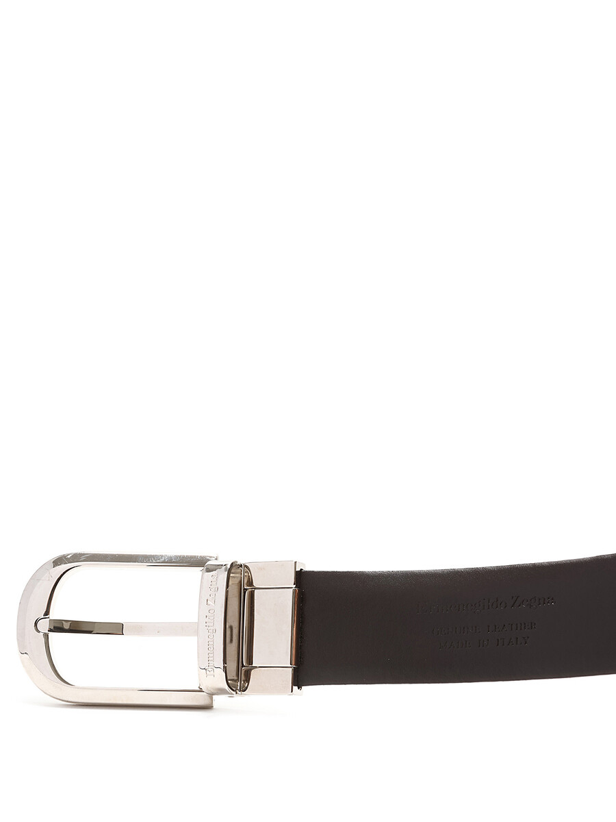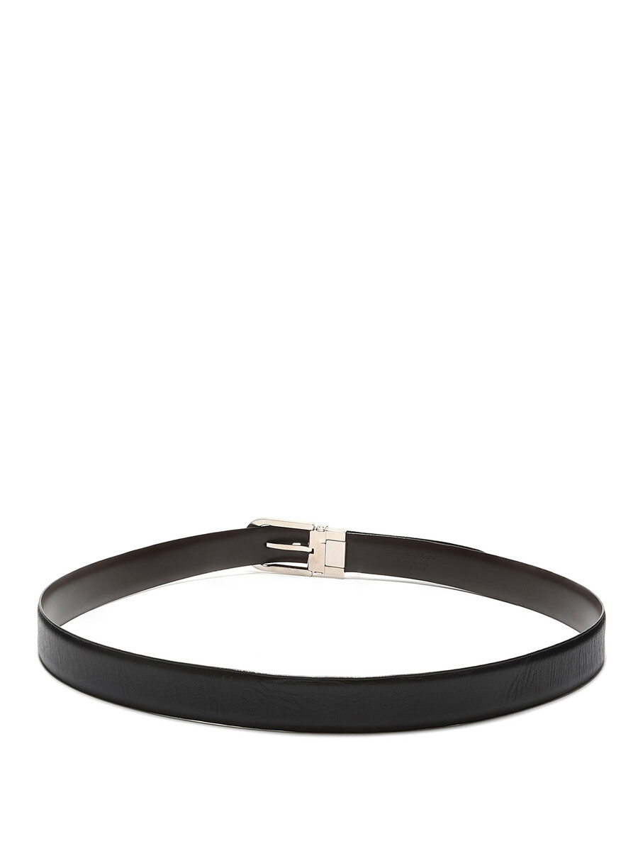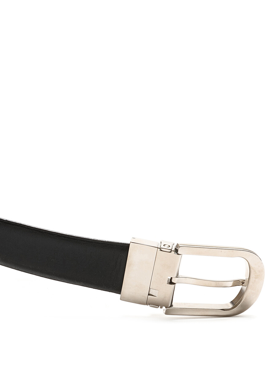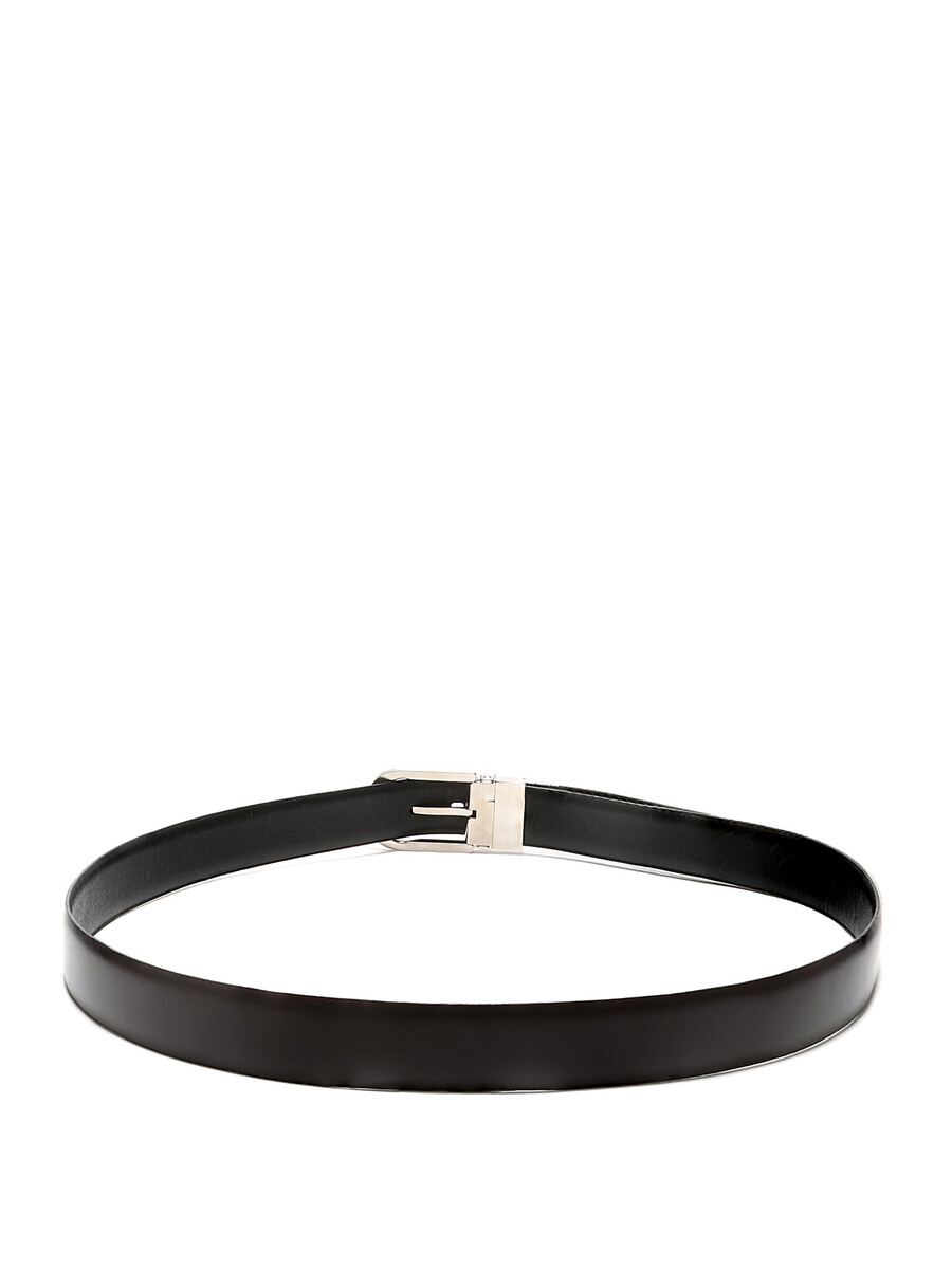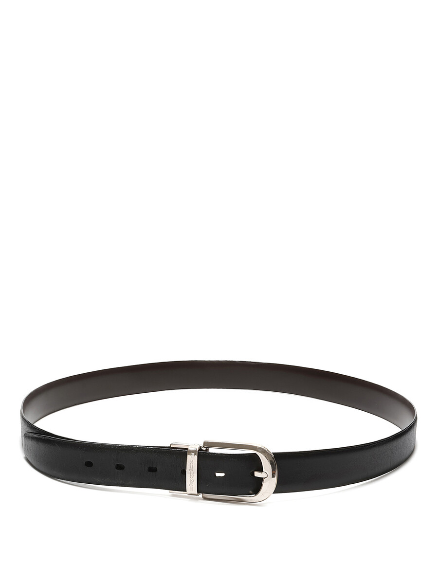 Classic leather belt in black featuring an oval silver-tone metal buckle. Silver-tone hardware.