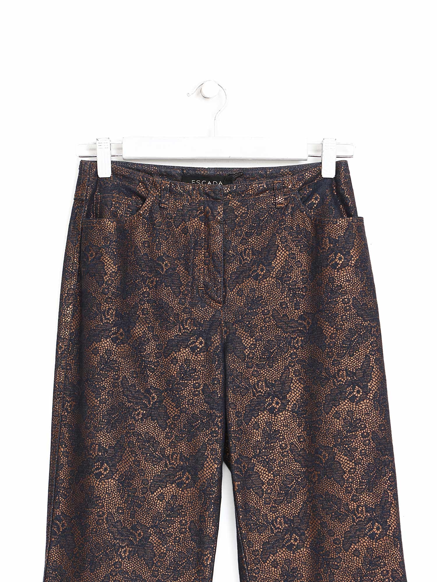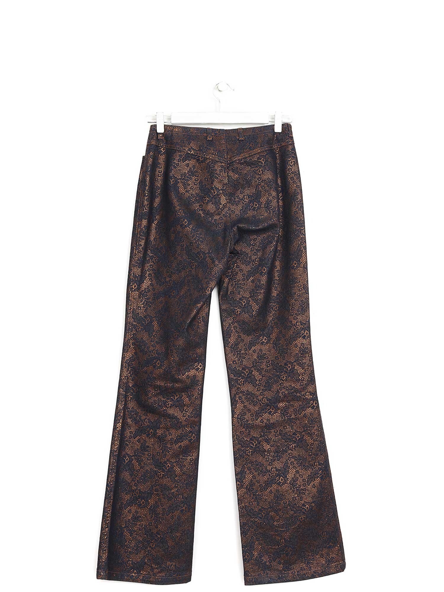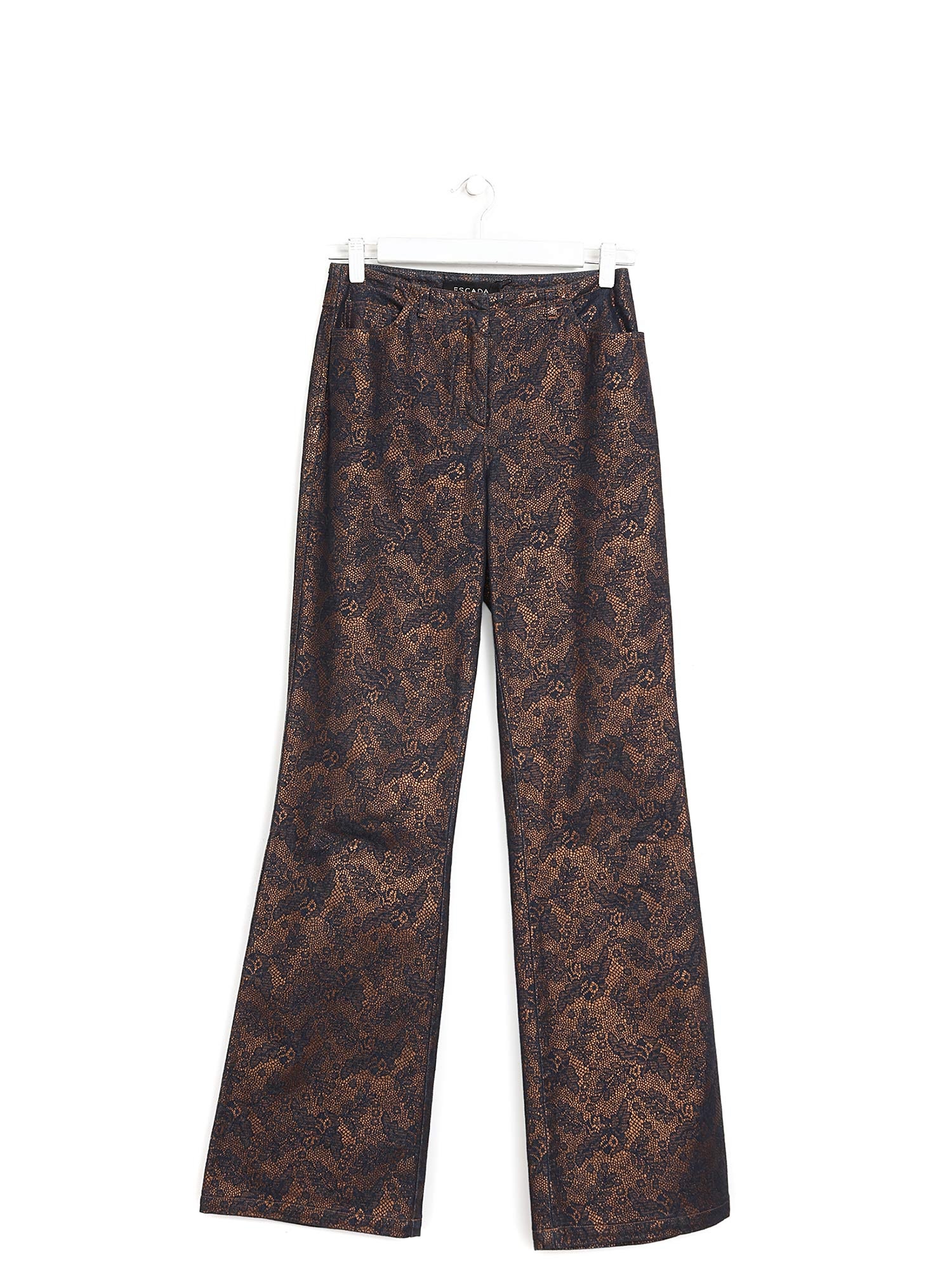 Fitted jeans with abstract pattern in gold and black. Features a five-pocket style and zipper closure.