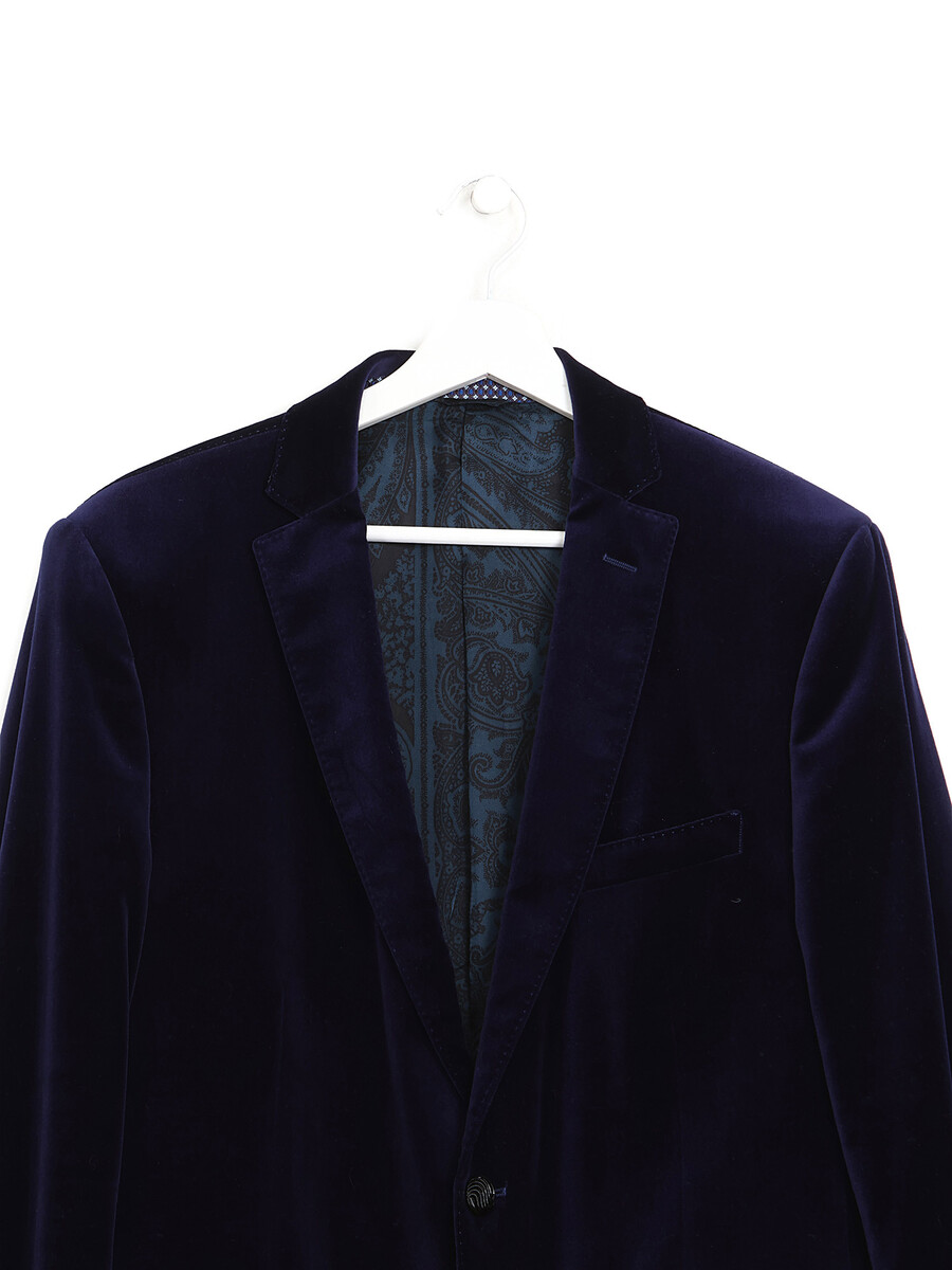 Navy velour long sleeve blazer with button front closure. Features a classic shirt collar and patch pockets. Lined for added comfort.