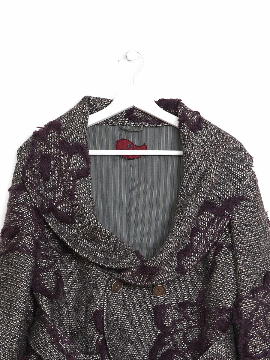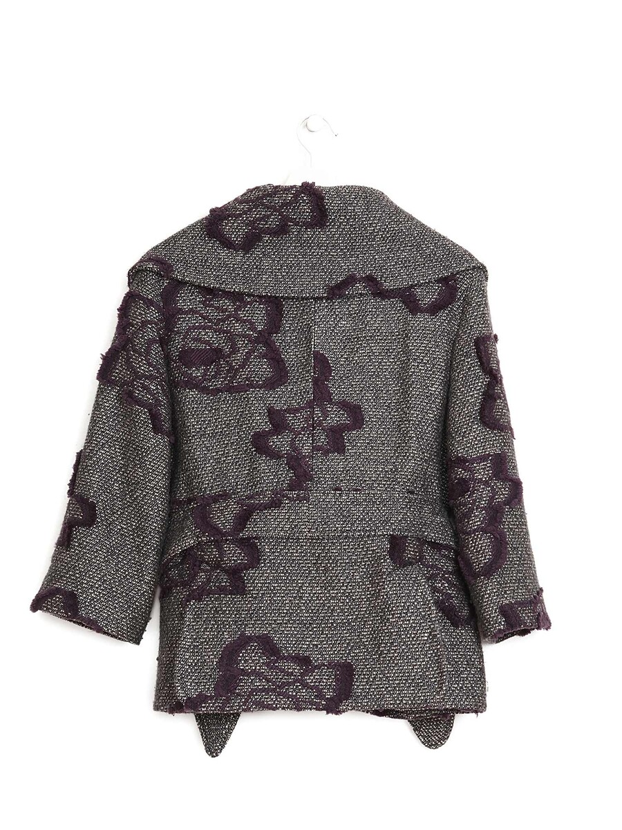 Wool jacket with floral embroidery throughout. Belted waist for a fitted silhouette.