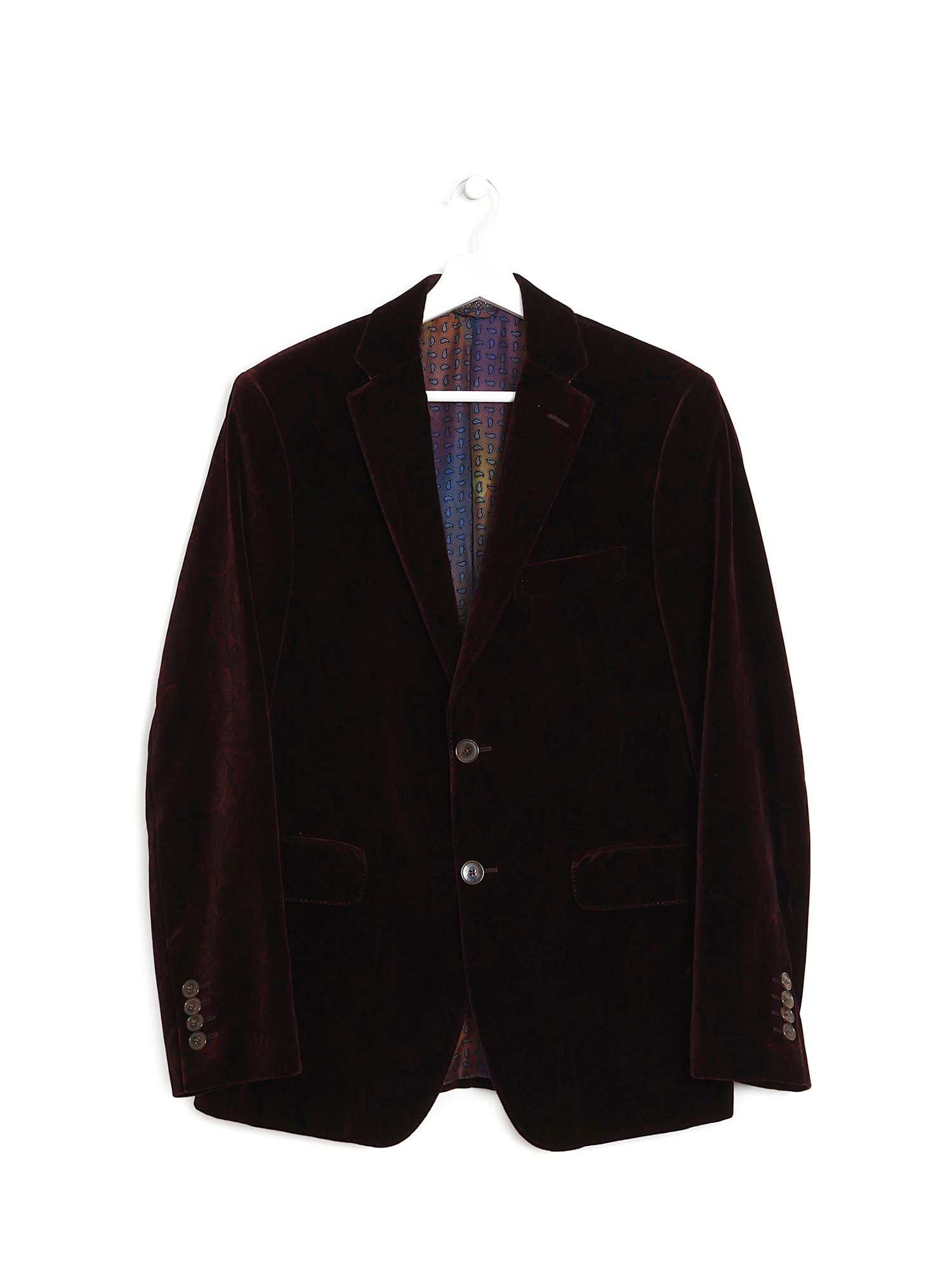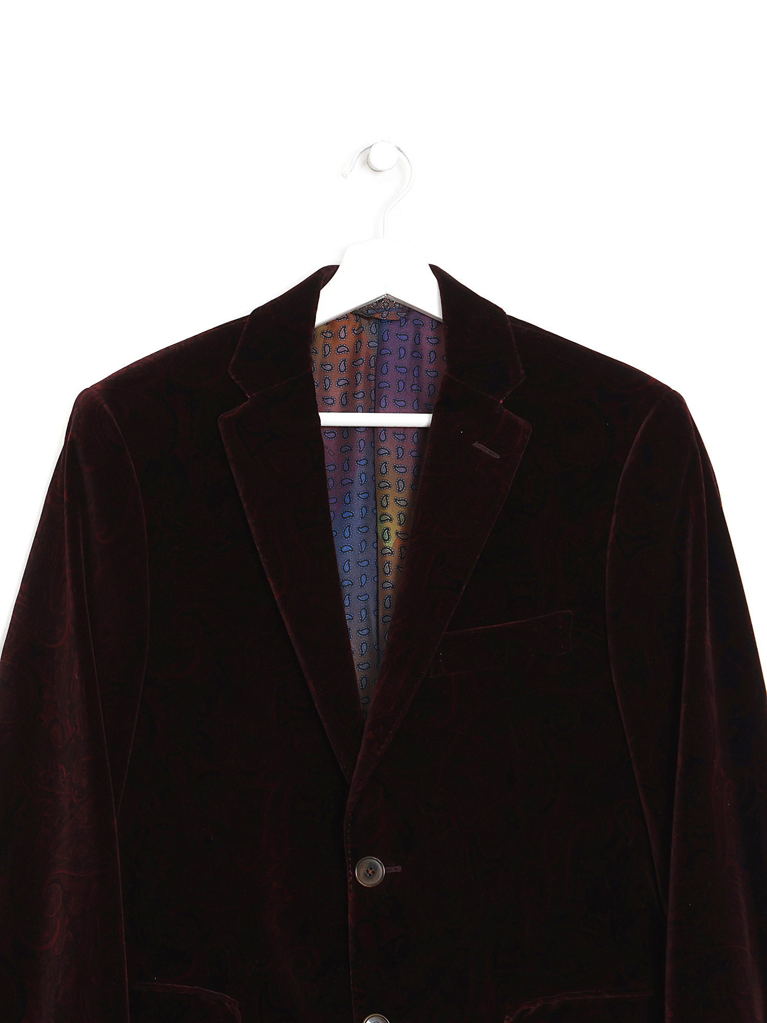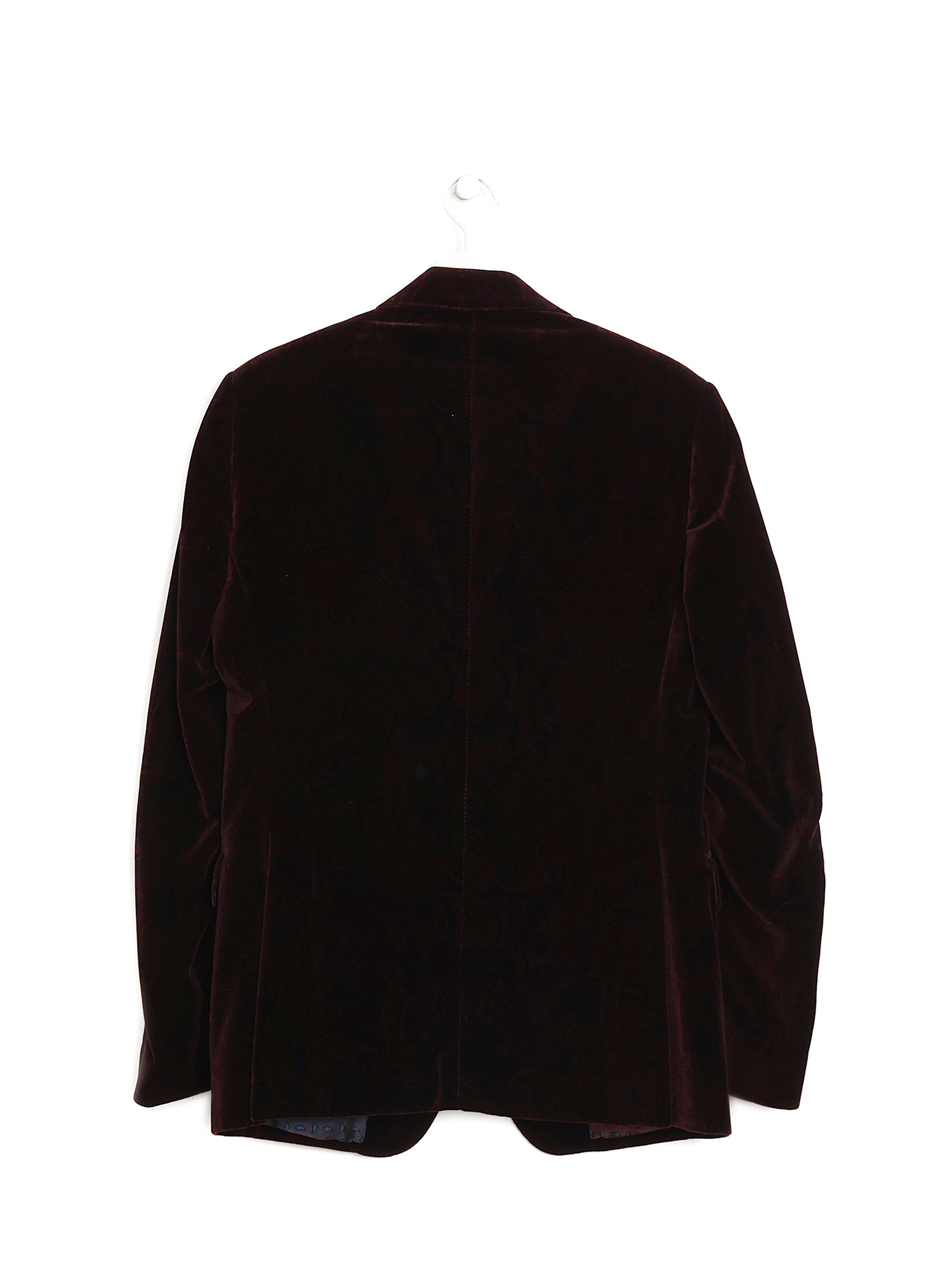 Velvet blazer in burgundy with a monochrome paisley pattern. Features patch pockets with flaps and a notch lapel collar.