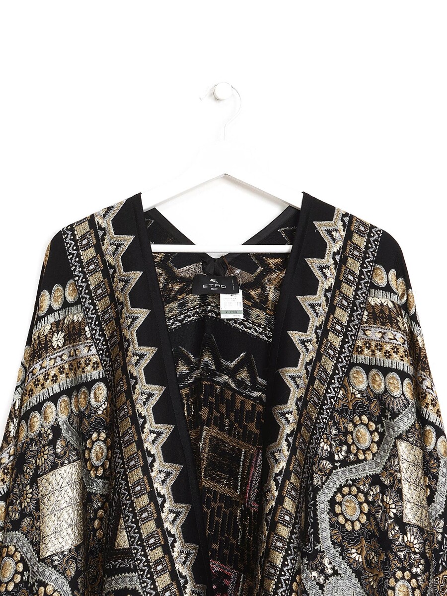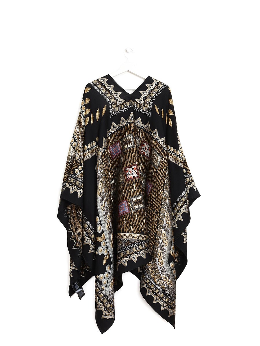 Multicolor paisley pattern poncho with an elegant drape. Edge fringes and a loose, flowing silhouette.