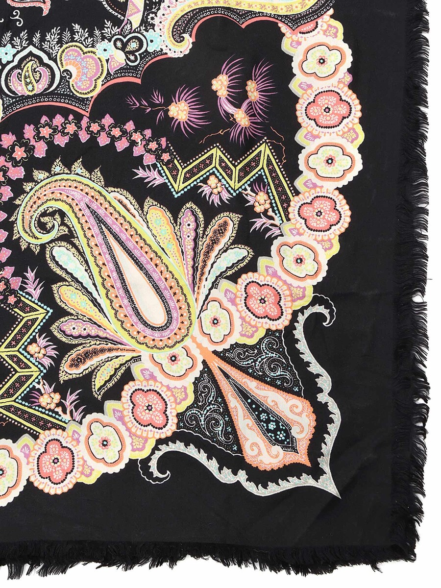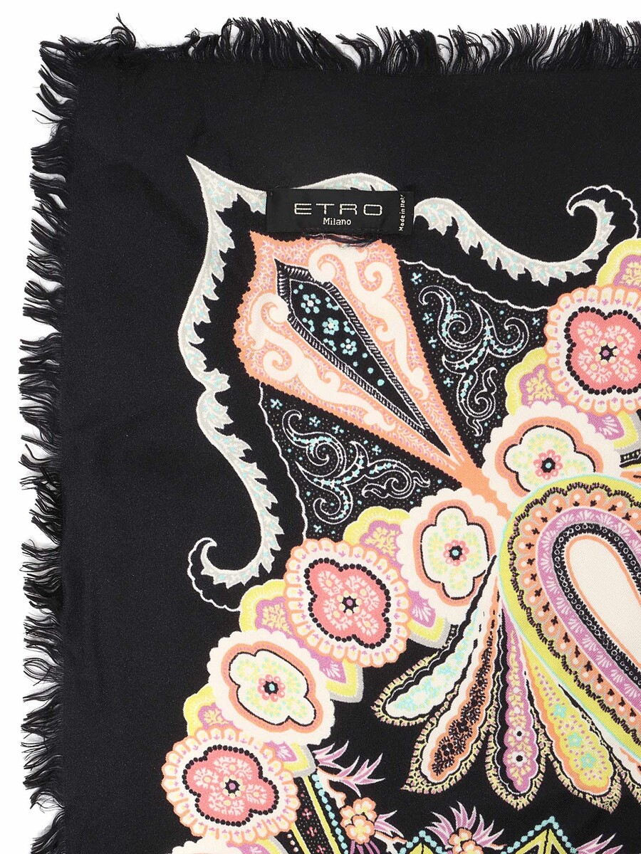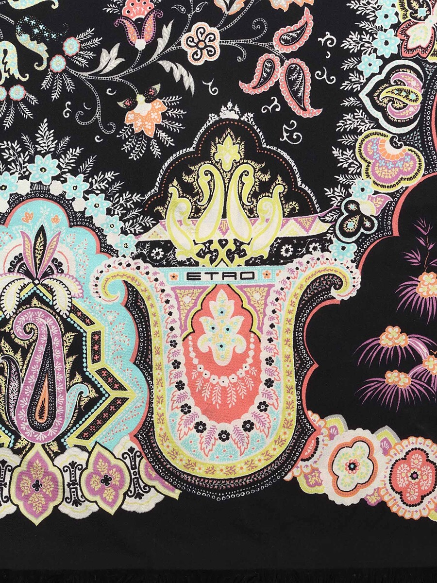 Silk scarf featuring a vibrant multicolored paisley pattern. Square shape. Edges finished with a neat hand-rolled hem.