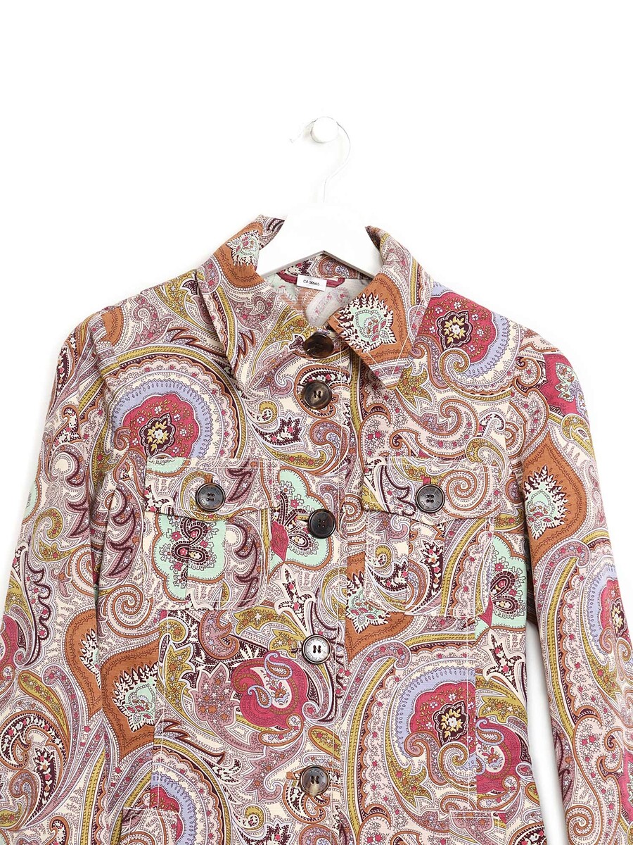 Multicolored paisley patterned coat. Classic collar with buttonhole closure. Chest pockets.