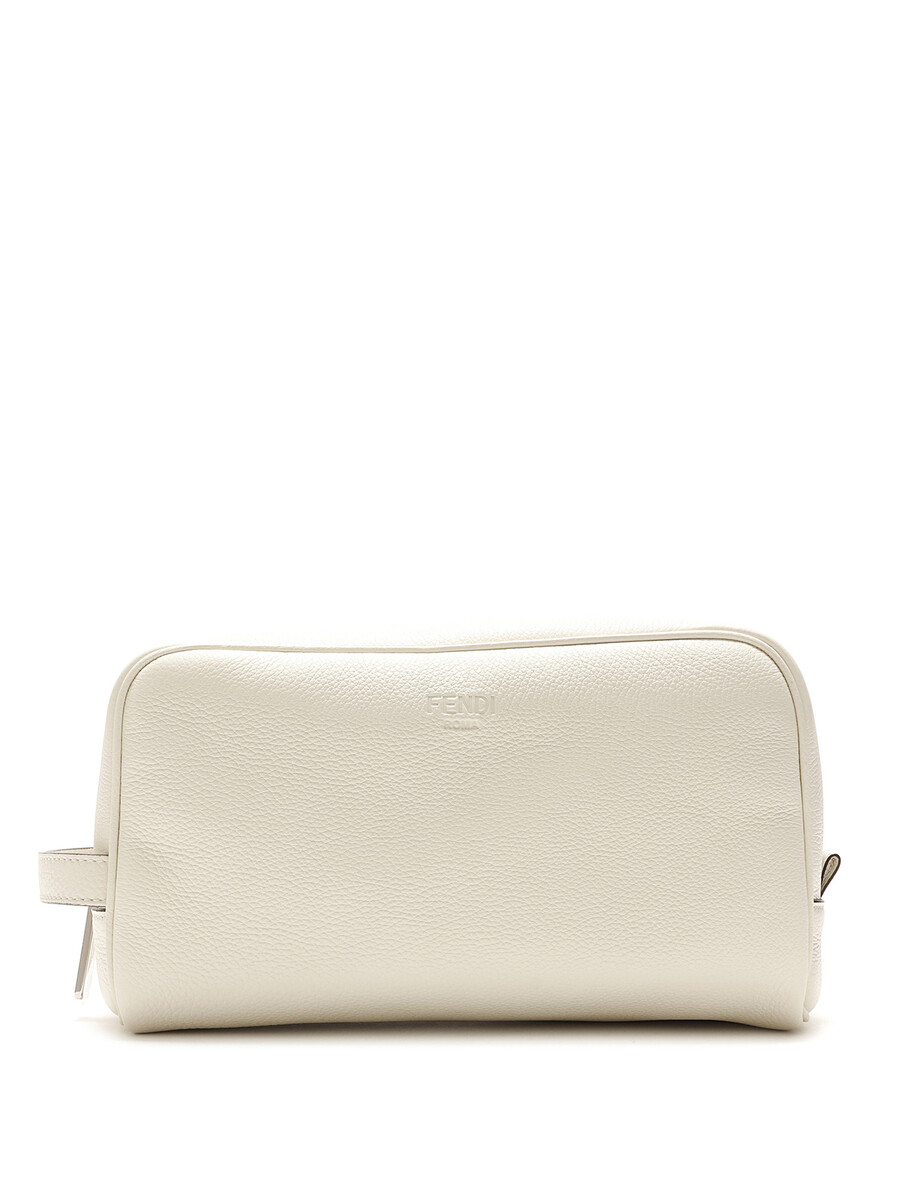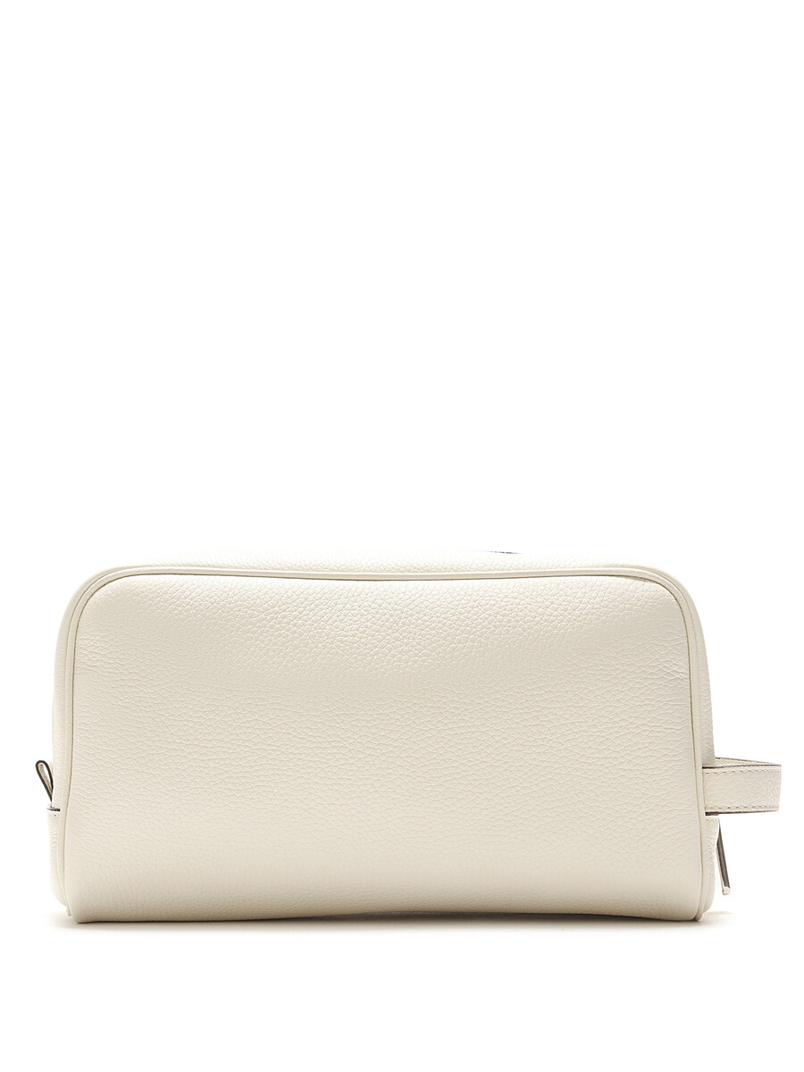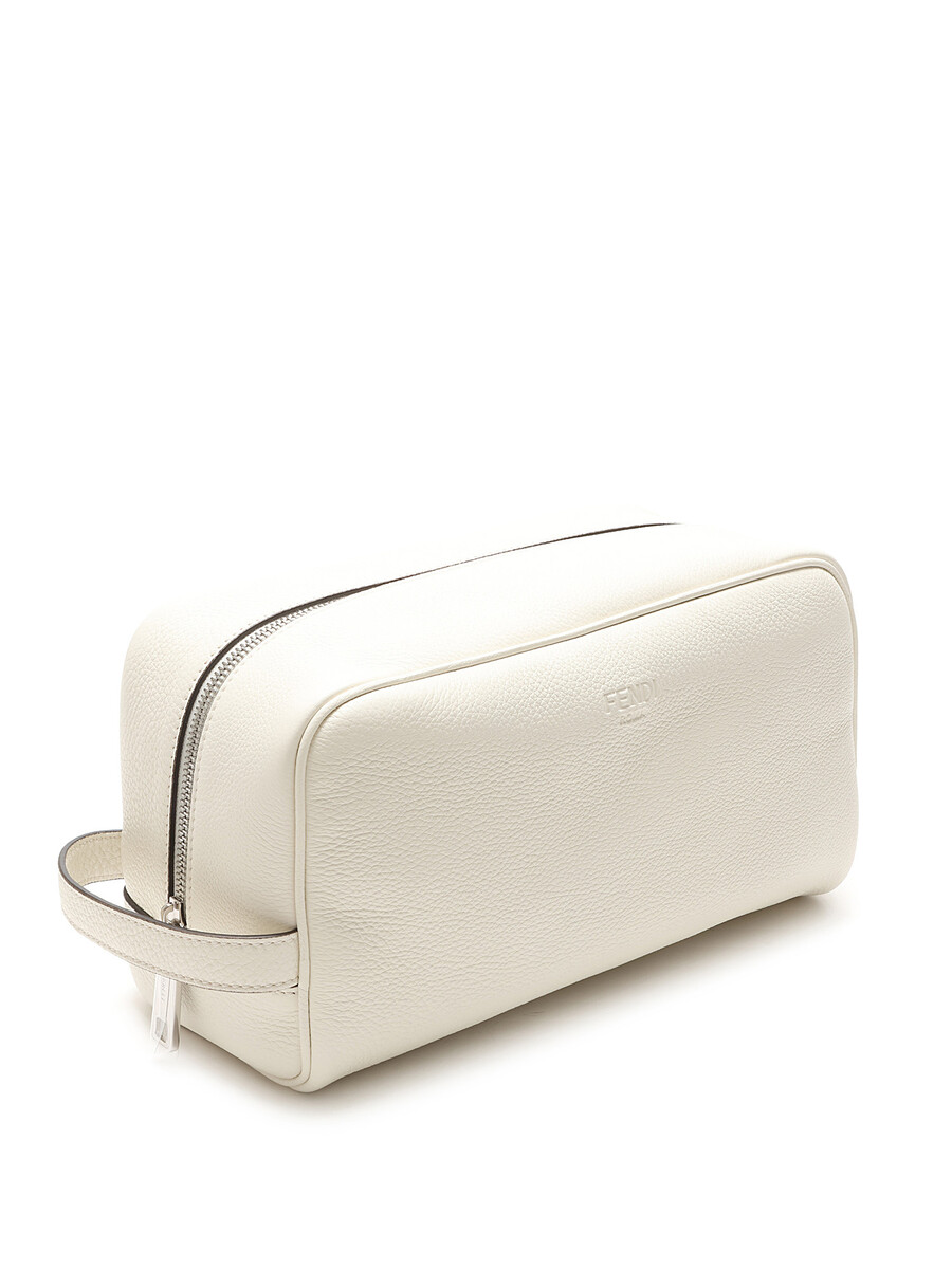 White grained leather makeup bag with silver-tone hardware. Features a top zip closure and a single handle. With dust bag.