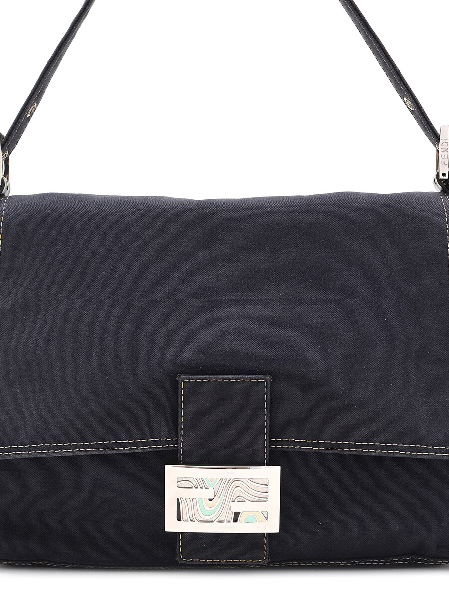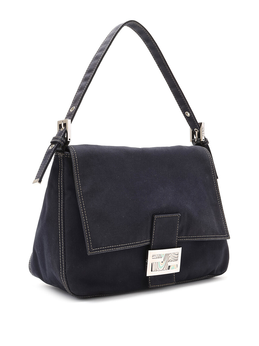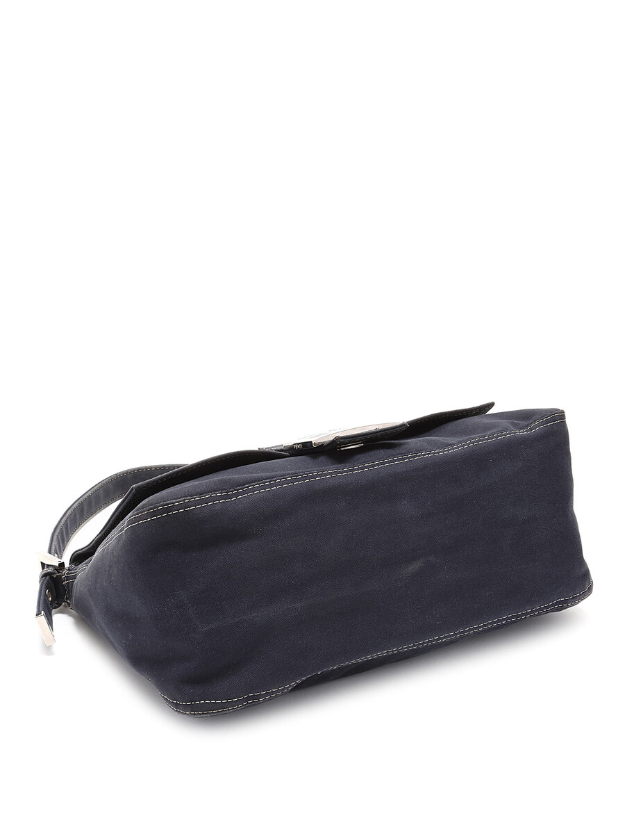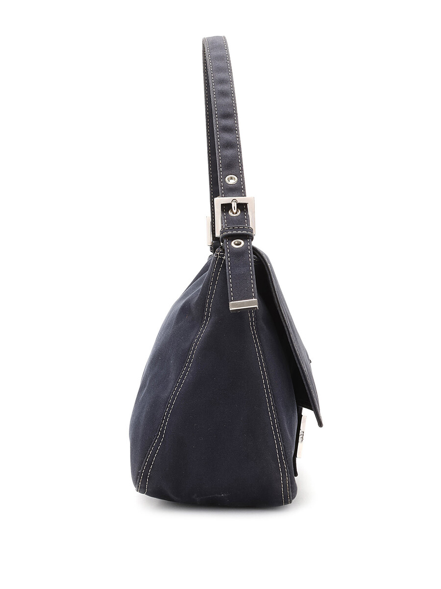 Denim Mamma Baguette bag with silver-tone buckle closure. Adjustable leather shoulder strap. Silver hardware.