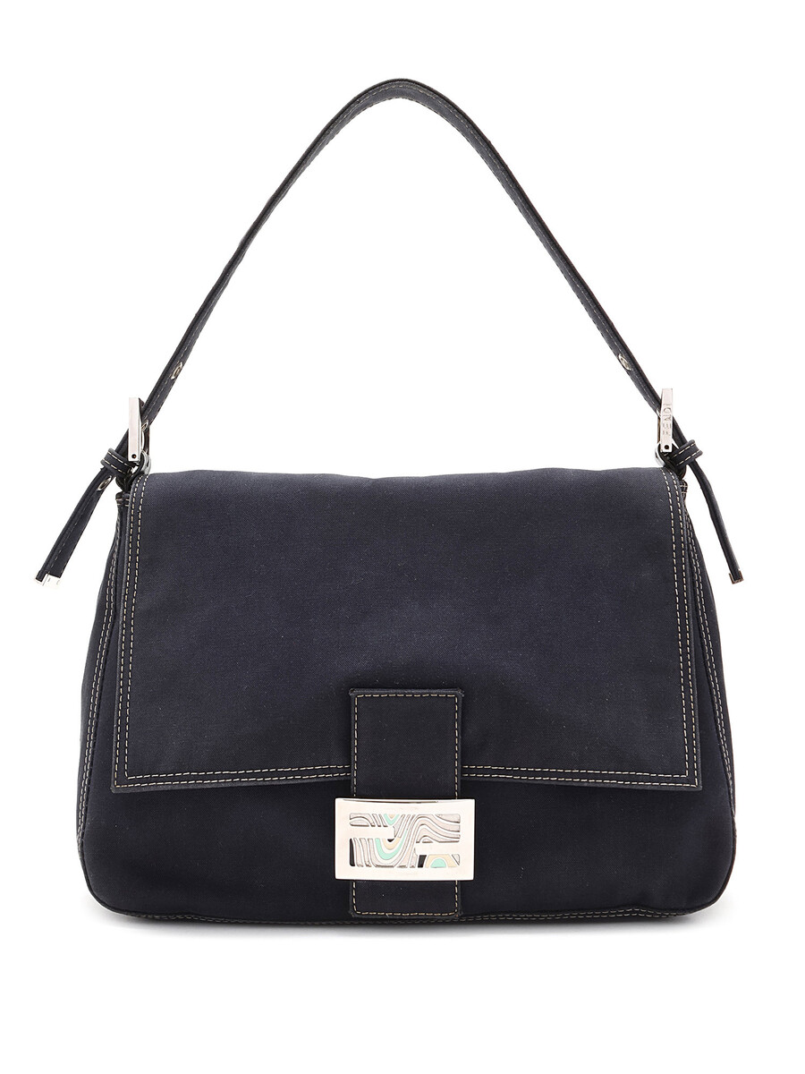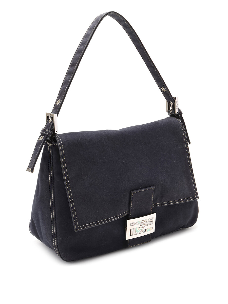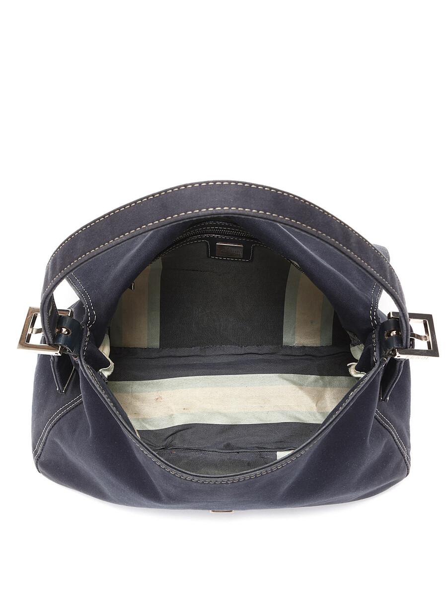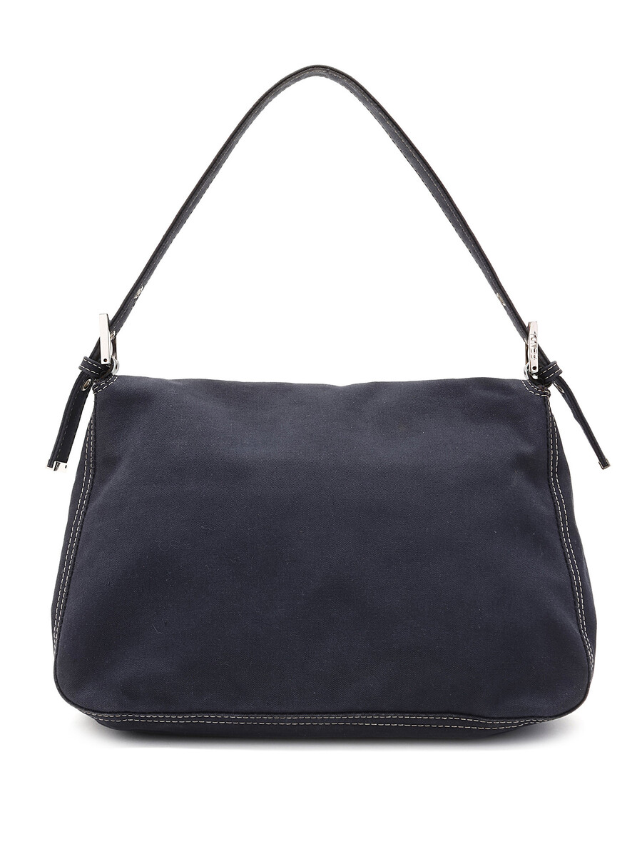 Denim Mamma Baguette bag with silver-tone buckle closure. Adjustable leather shoulder strap. Silver hardware.