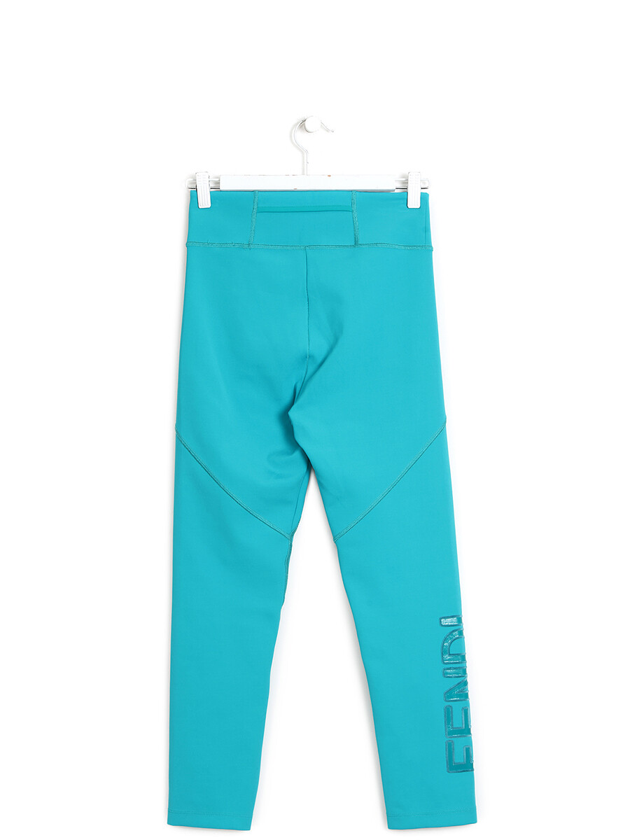 Aqua blue leggings featuring tonal stitching and velour detailing. Fendi Roma logo at back pocket.