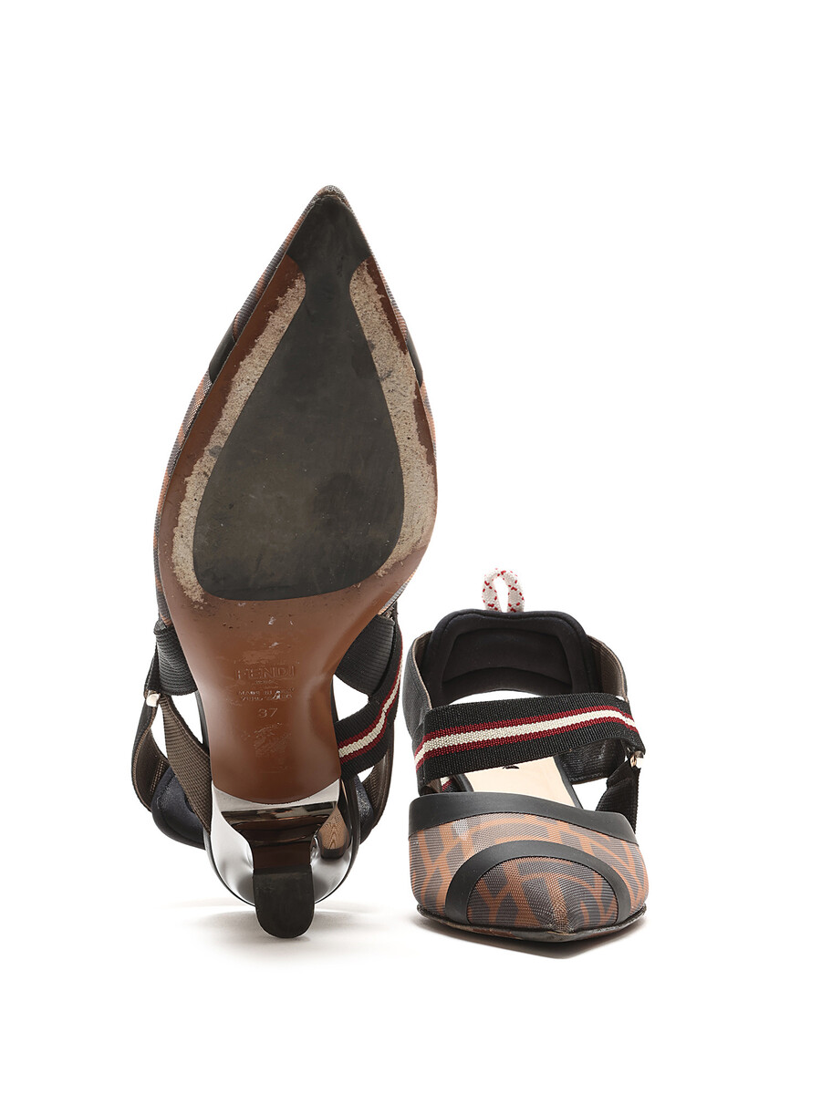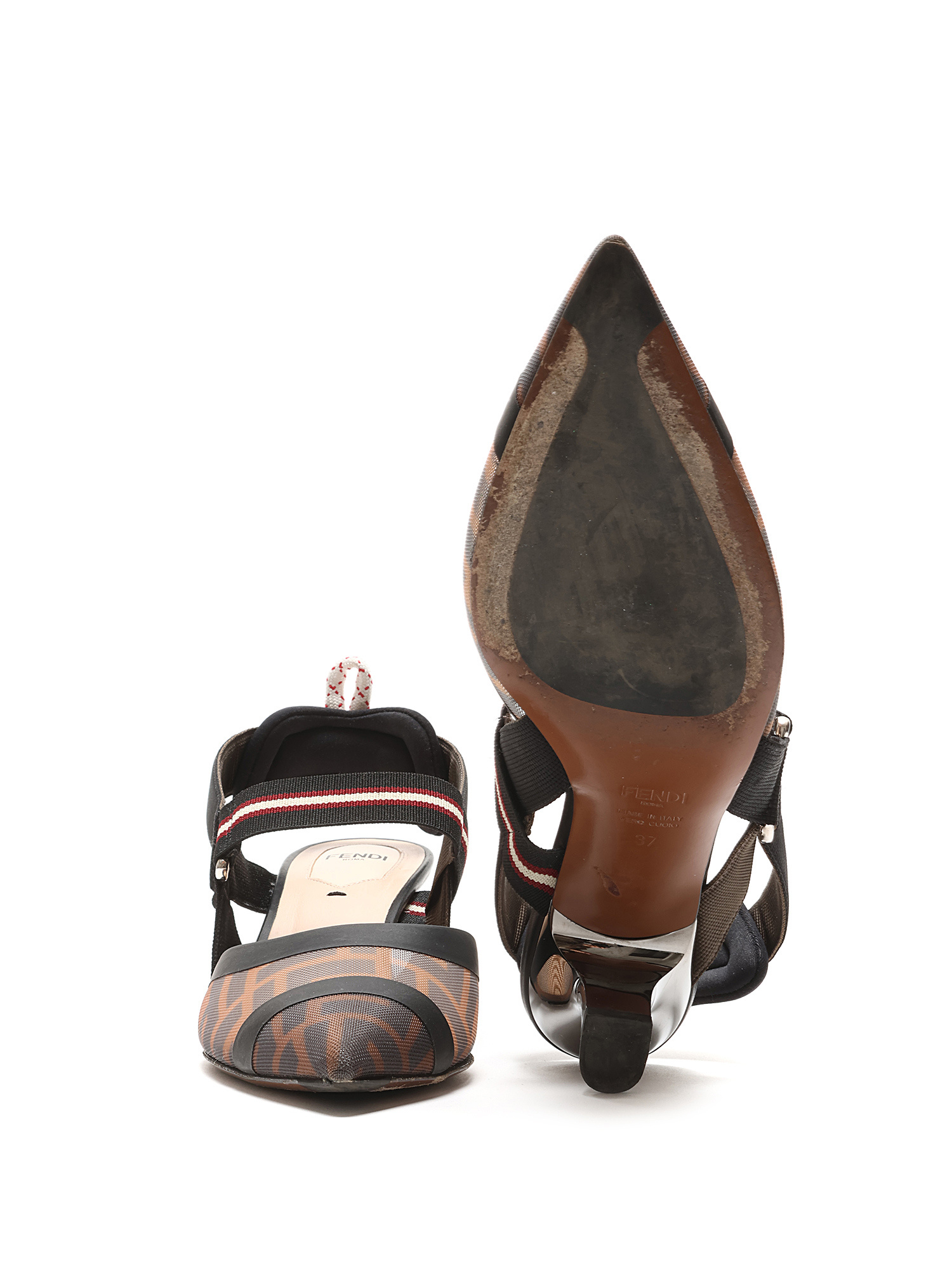 Two-tone leather and fabric slingback heels featuring striped detailing in brown, black, and burgundy. Pointed toe with elasticized strap closure.