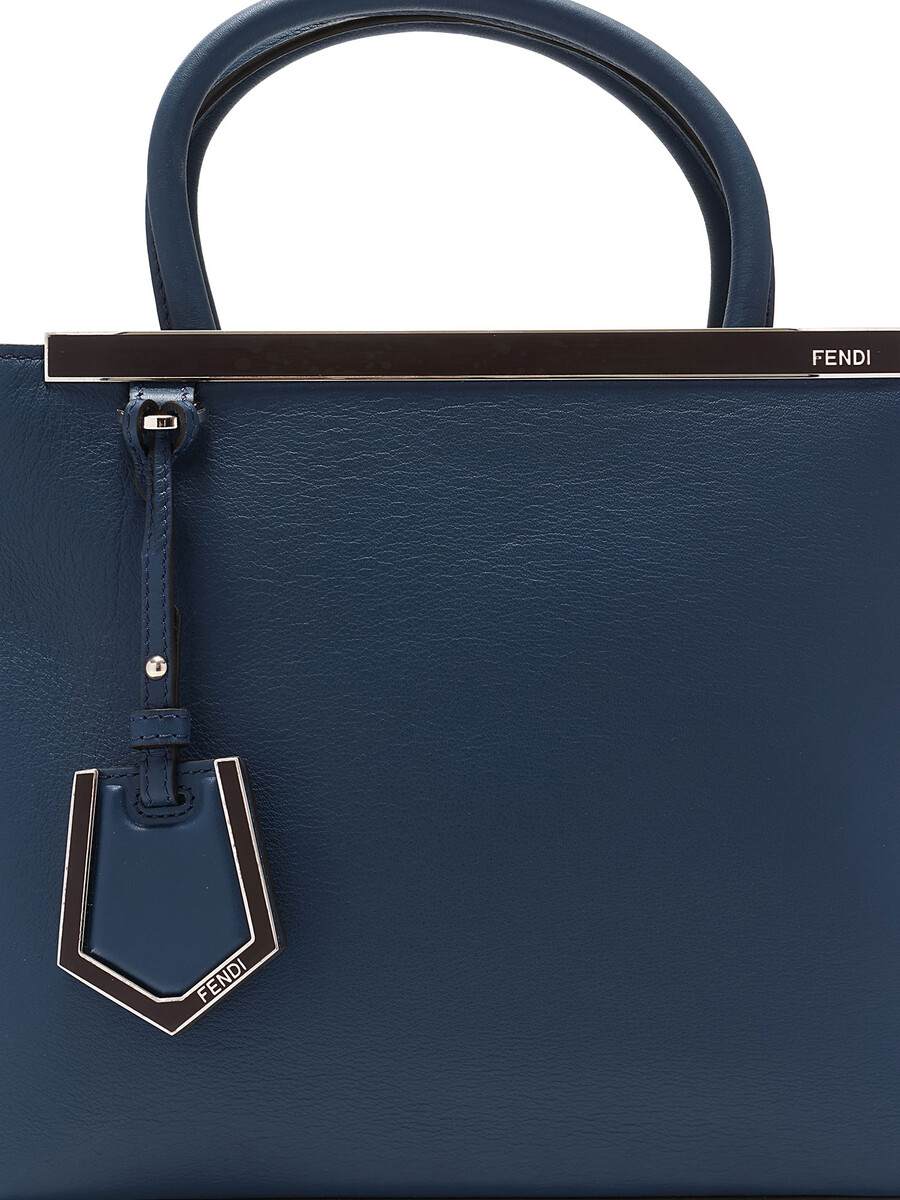 Elegant leather tote bag in navy blue featuring tonal stitching. Double top handles. Silver-tone hardware. Comes with a dust bag.
