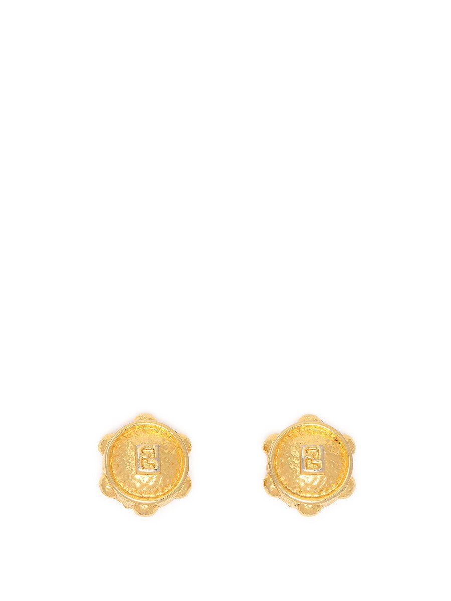 Gold-tone clip-on earrings featuring embossed logo motif. Clip closure.