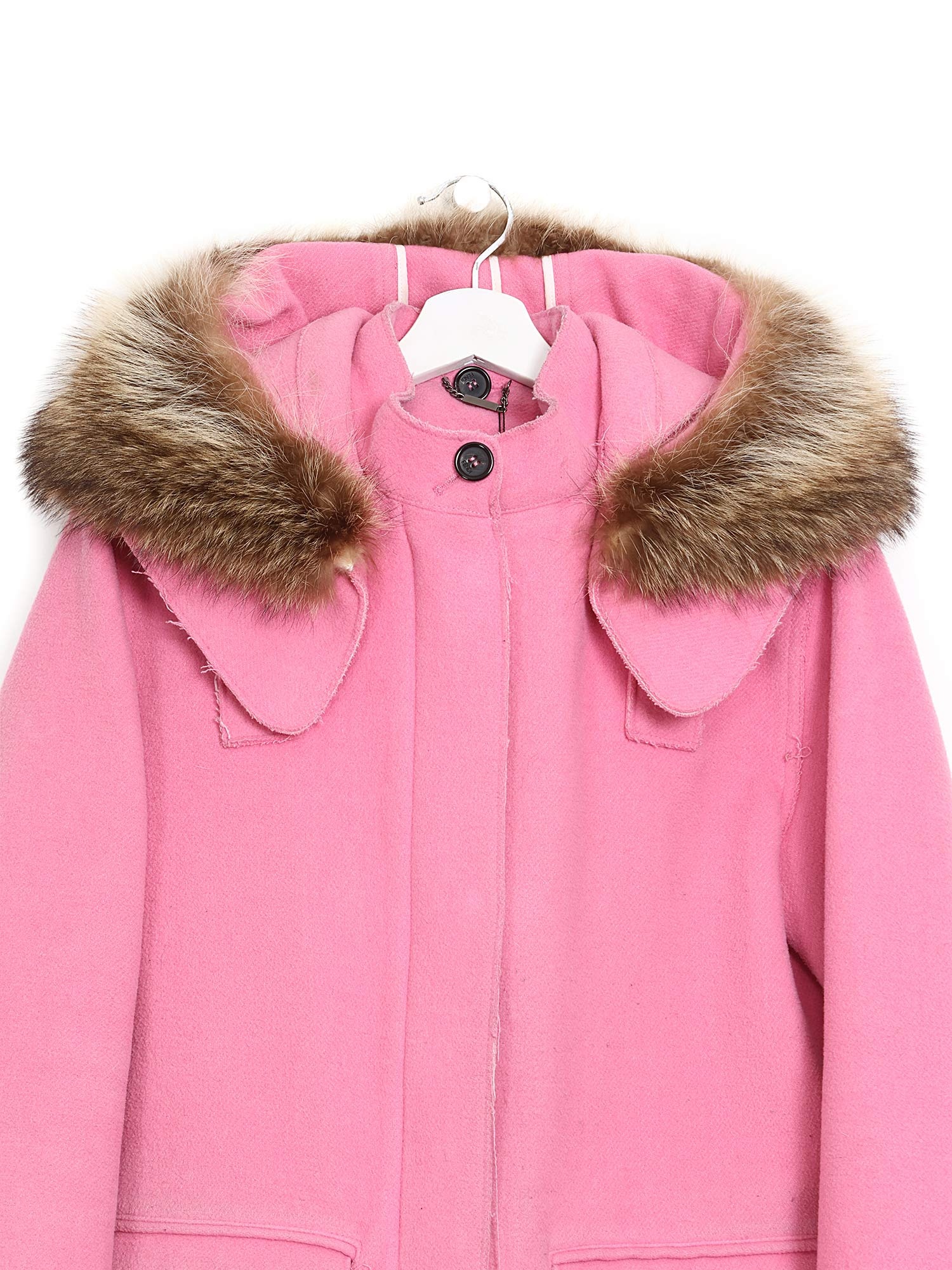 Wool parka coat in pink featuring a luxurious marmot fur hood. Zip closure at front.