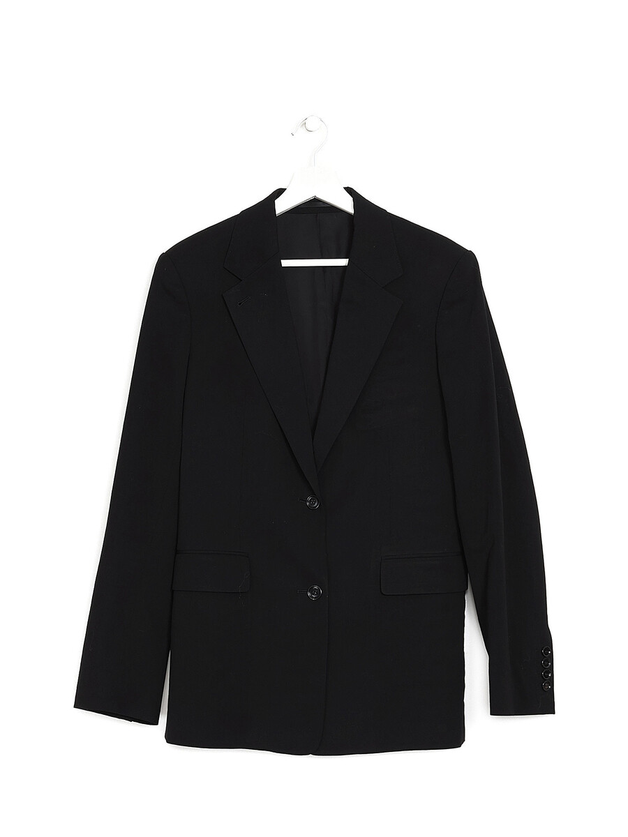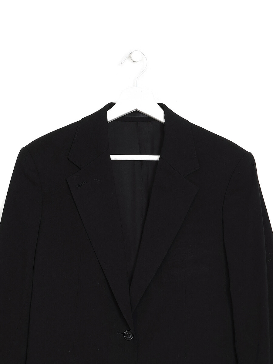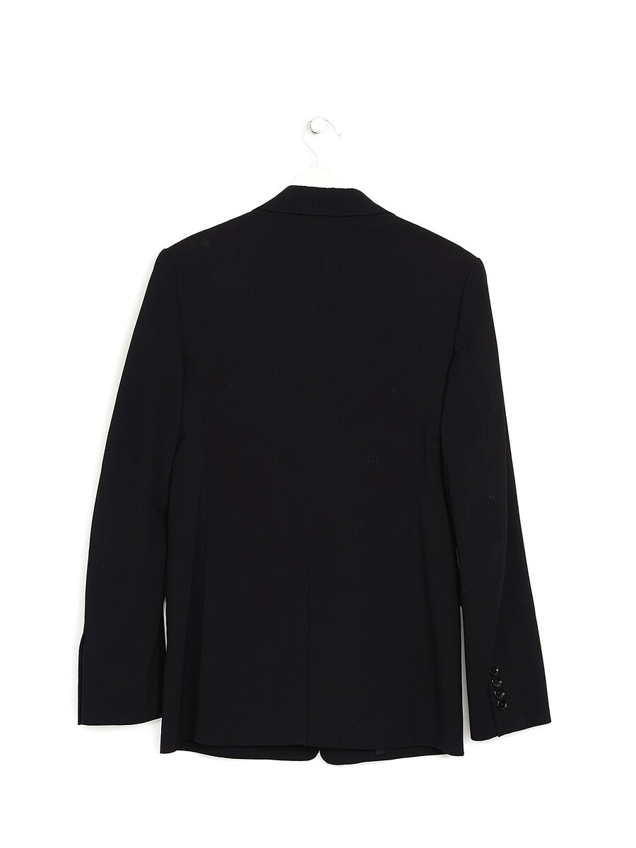 Black wool blazer with notch lapel collar. Button closure at front. Features welted pockets.