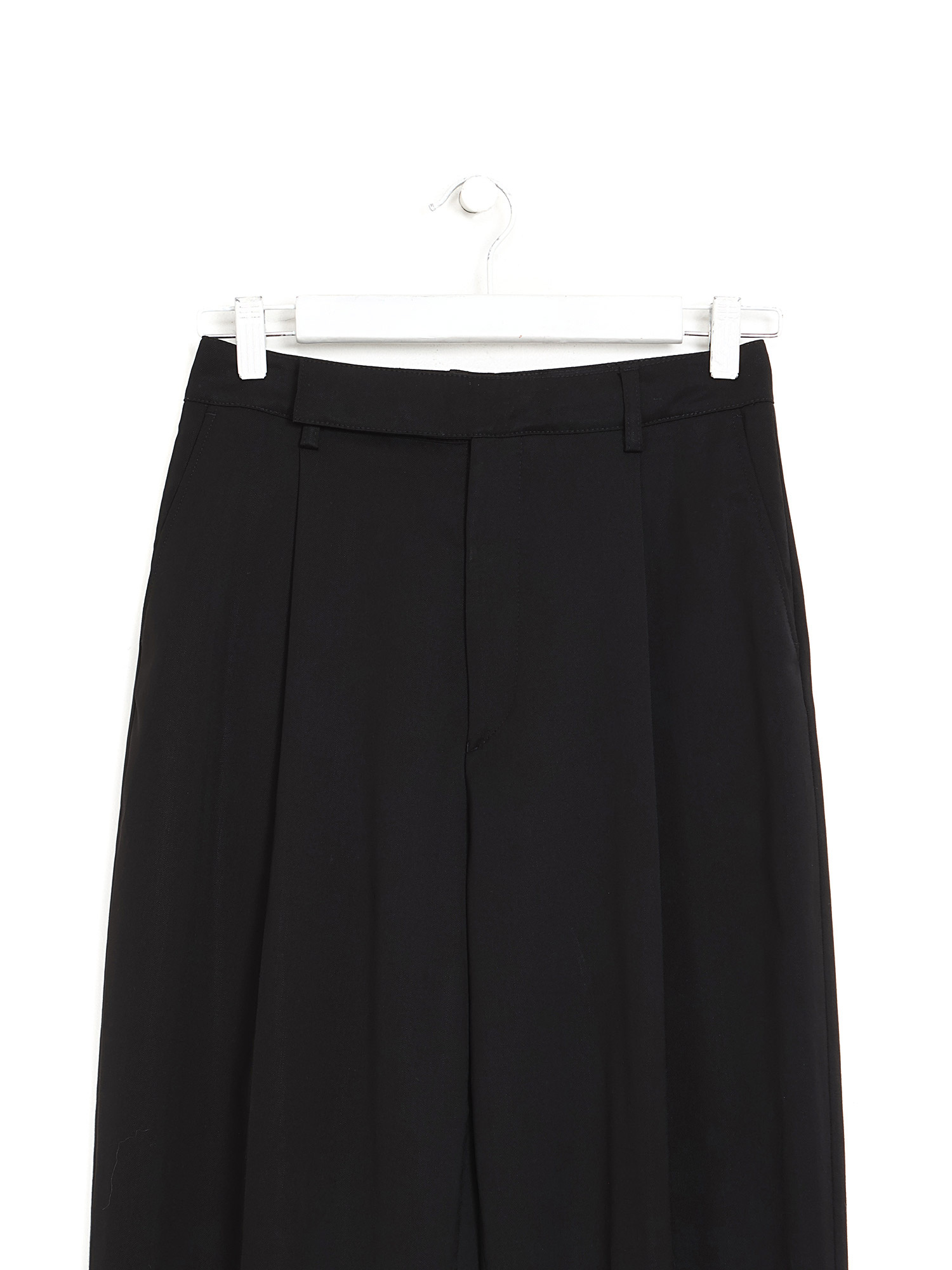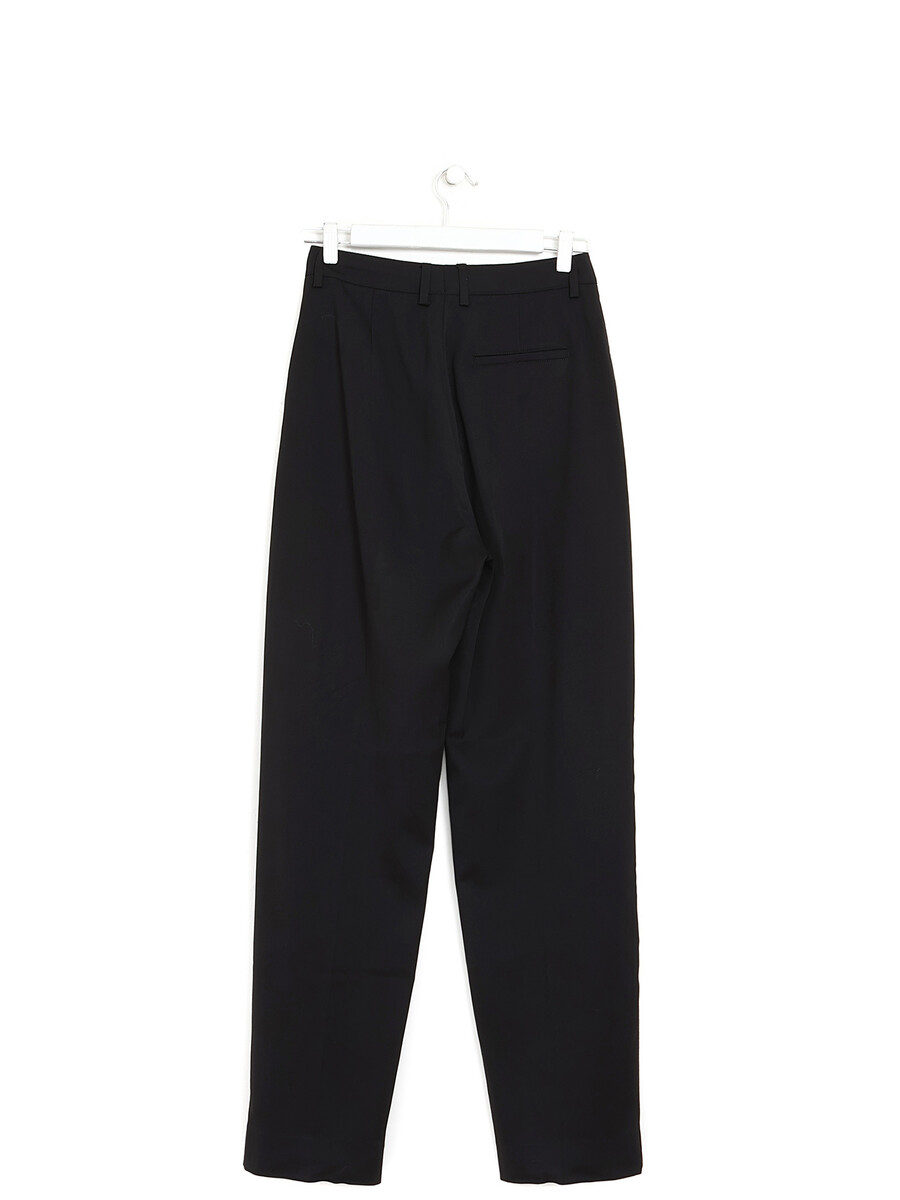 Straight-leg black trousers at ankle length. Front button and zipper closure. Mid-rise waist with side pockets.
