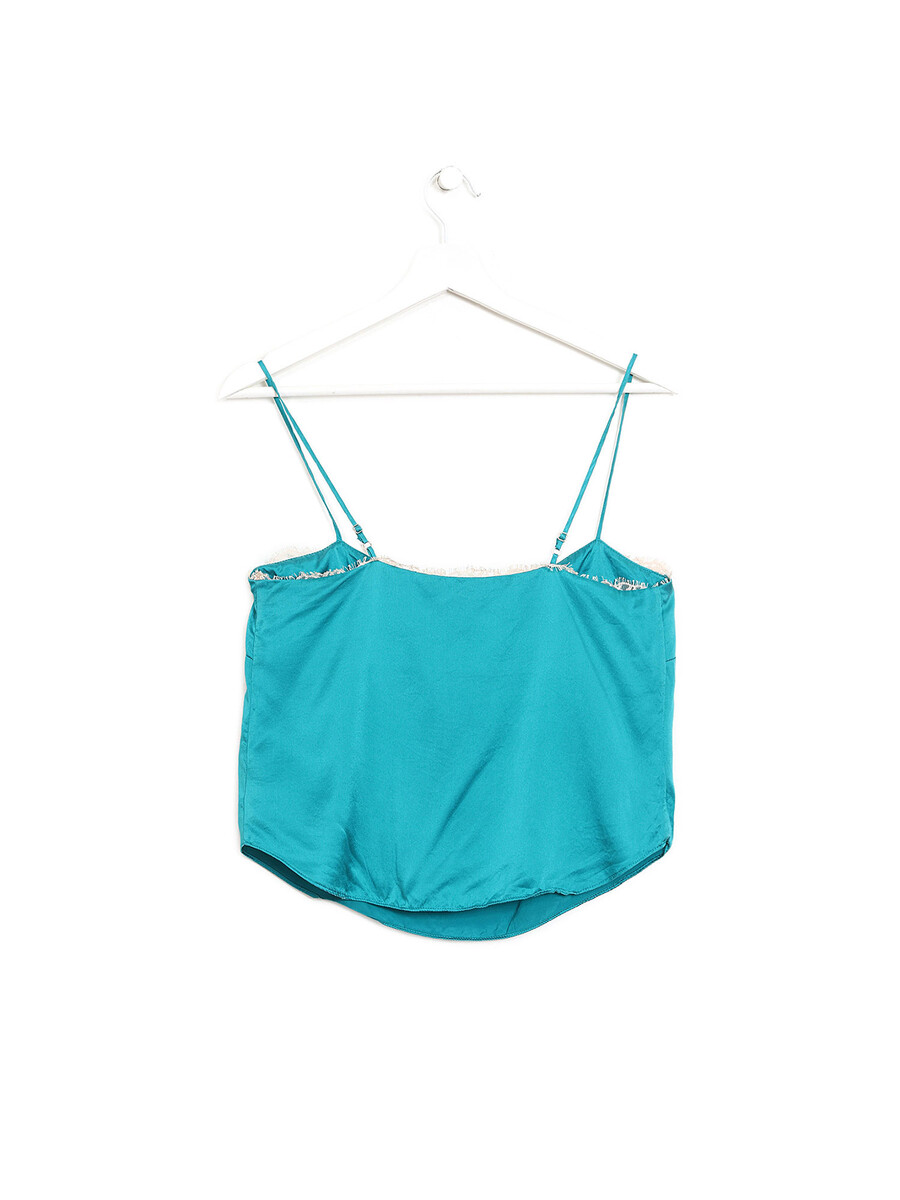 Turquoise sleeveless silk camisole with frayed hem detailing. Straight neckline.