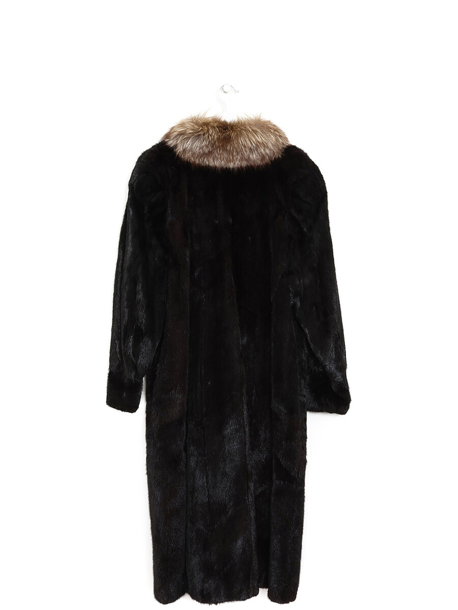 Vintage mid-length fur coat in shades of dark brown and beige. Hook closure. Signs of wear, with matted fur and a broken hook.