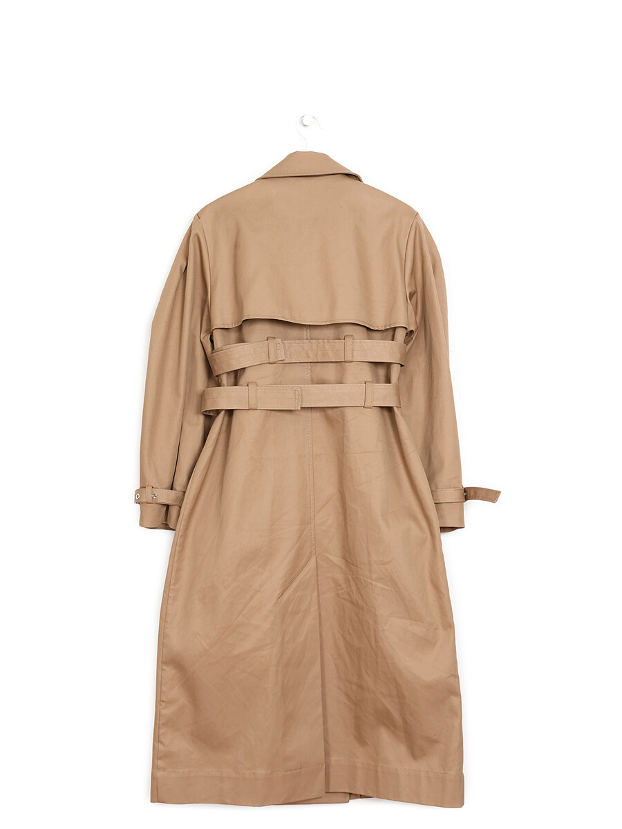 Double-breasted beige trench coat in organic cotton. Adjustable button cuffs. Notched lapel collar. Two side pockets.