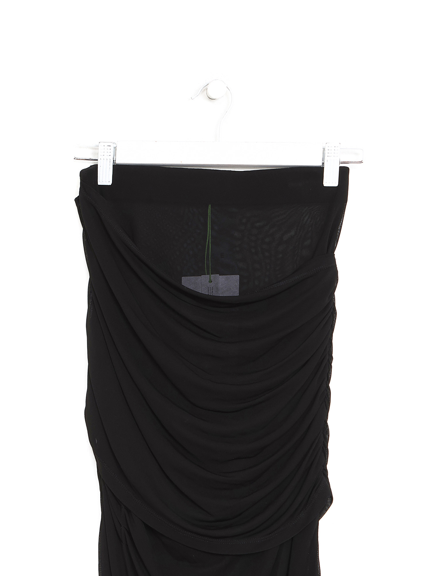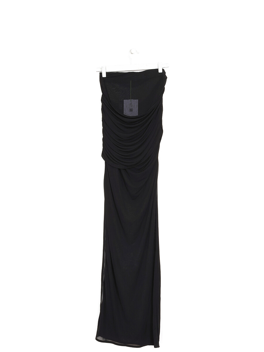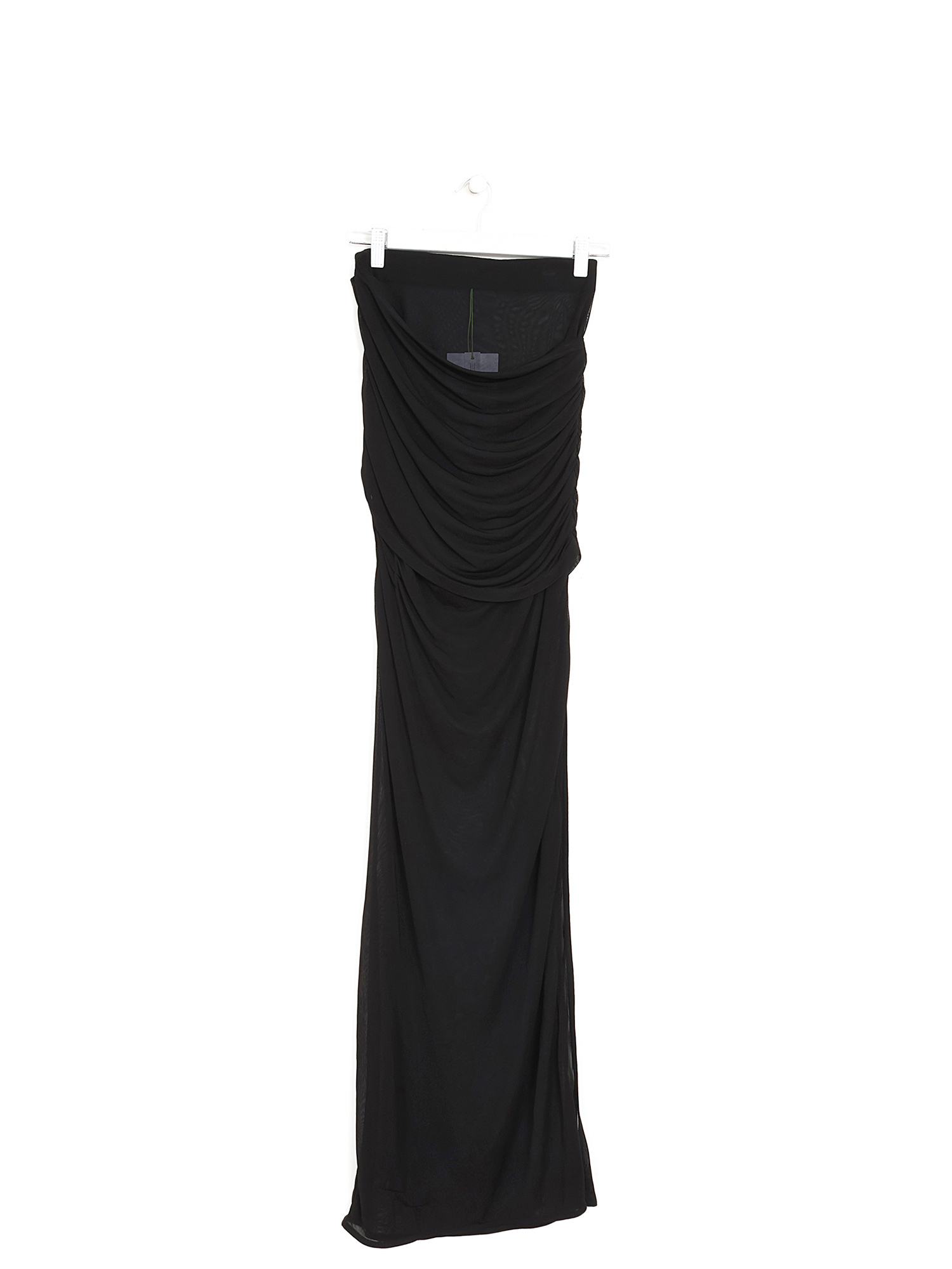 Semi-sheer black maxi skirt crafted from a viscose blend. Features a flowing silhouette with a subtle sheen.