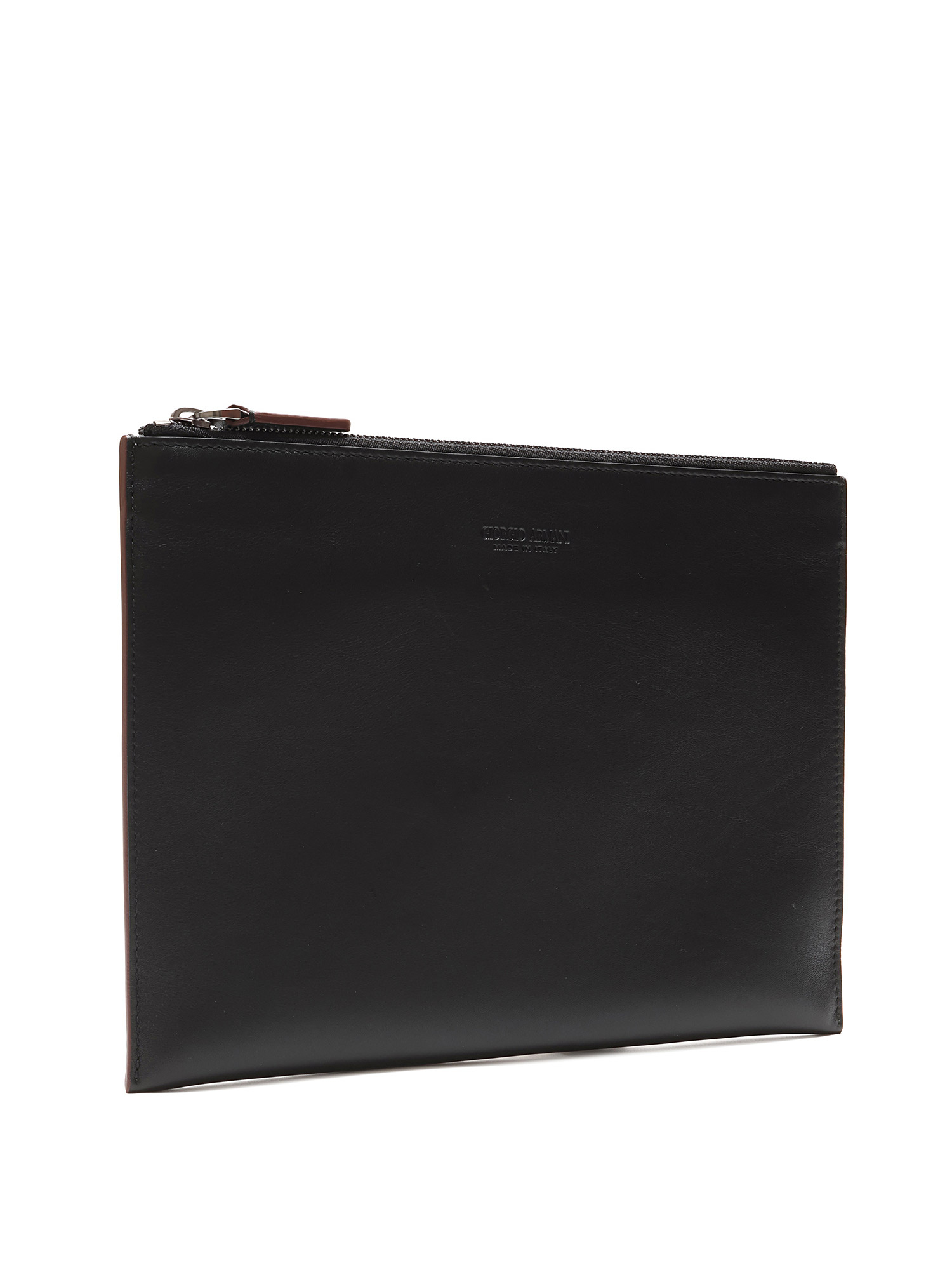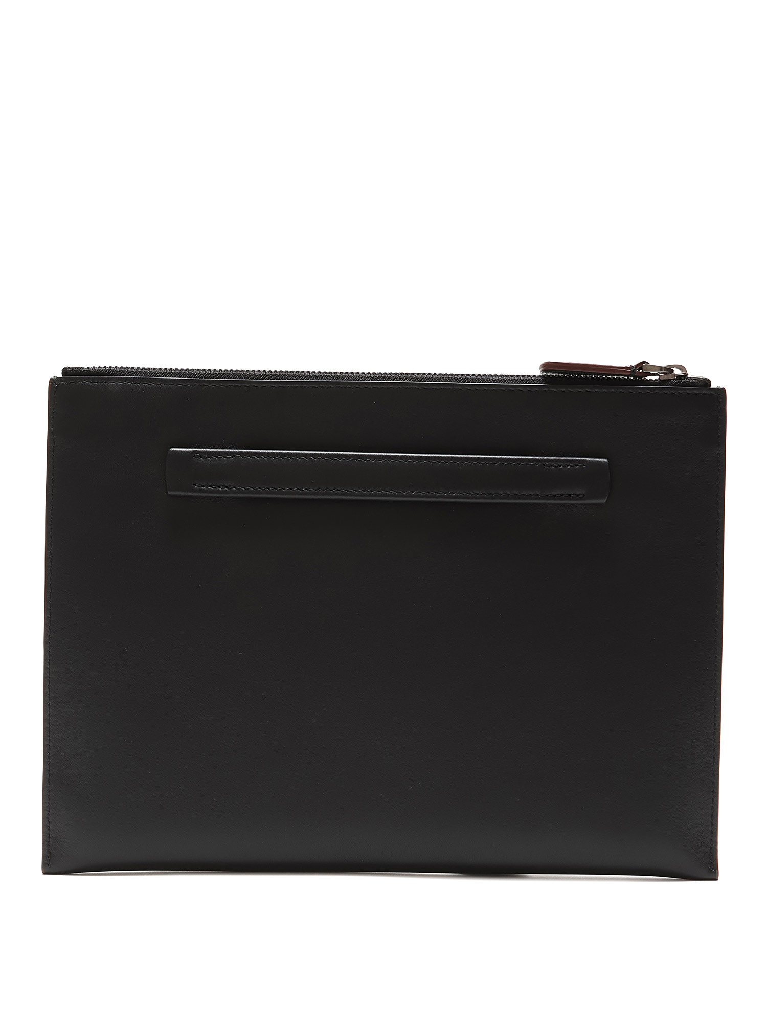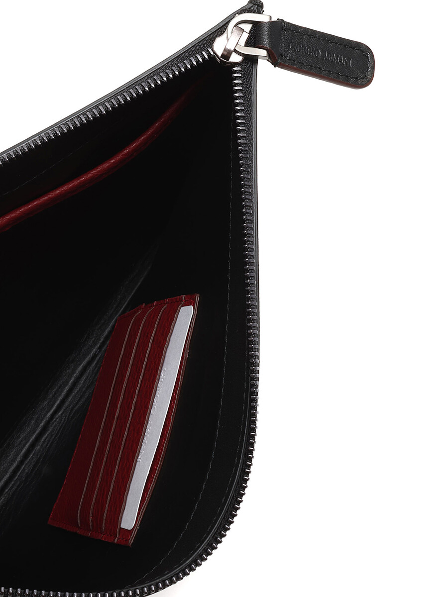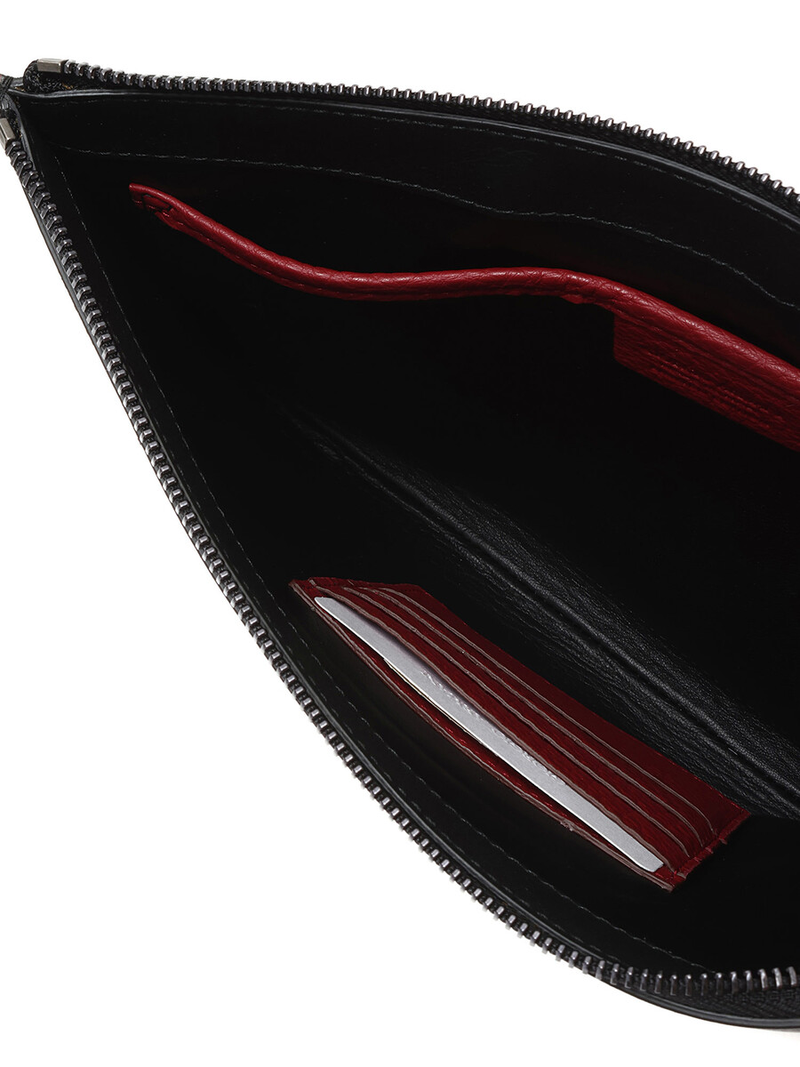 Grained leather black clutch with zipper closure.