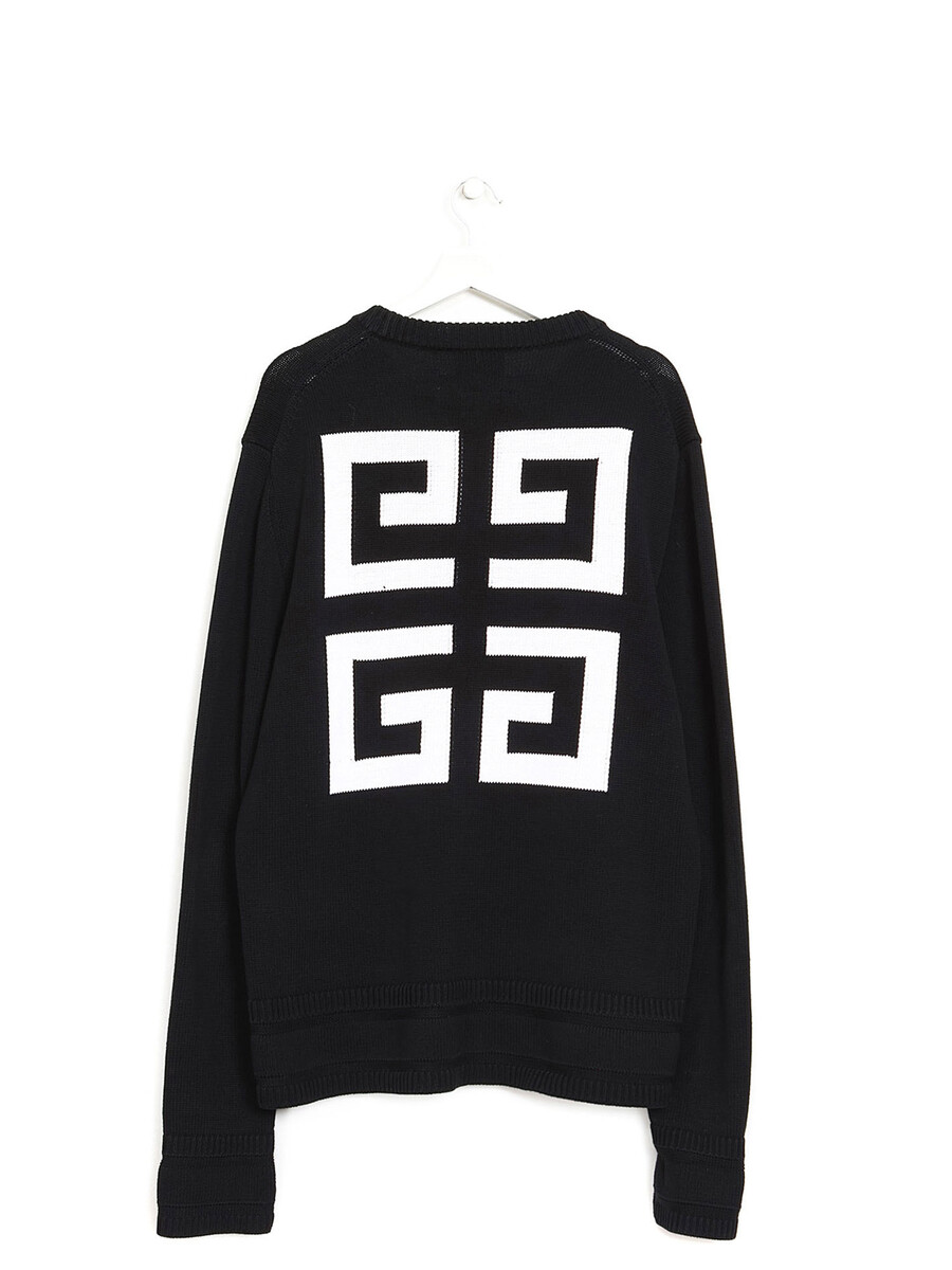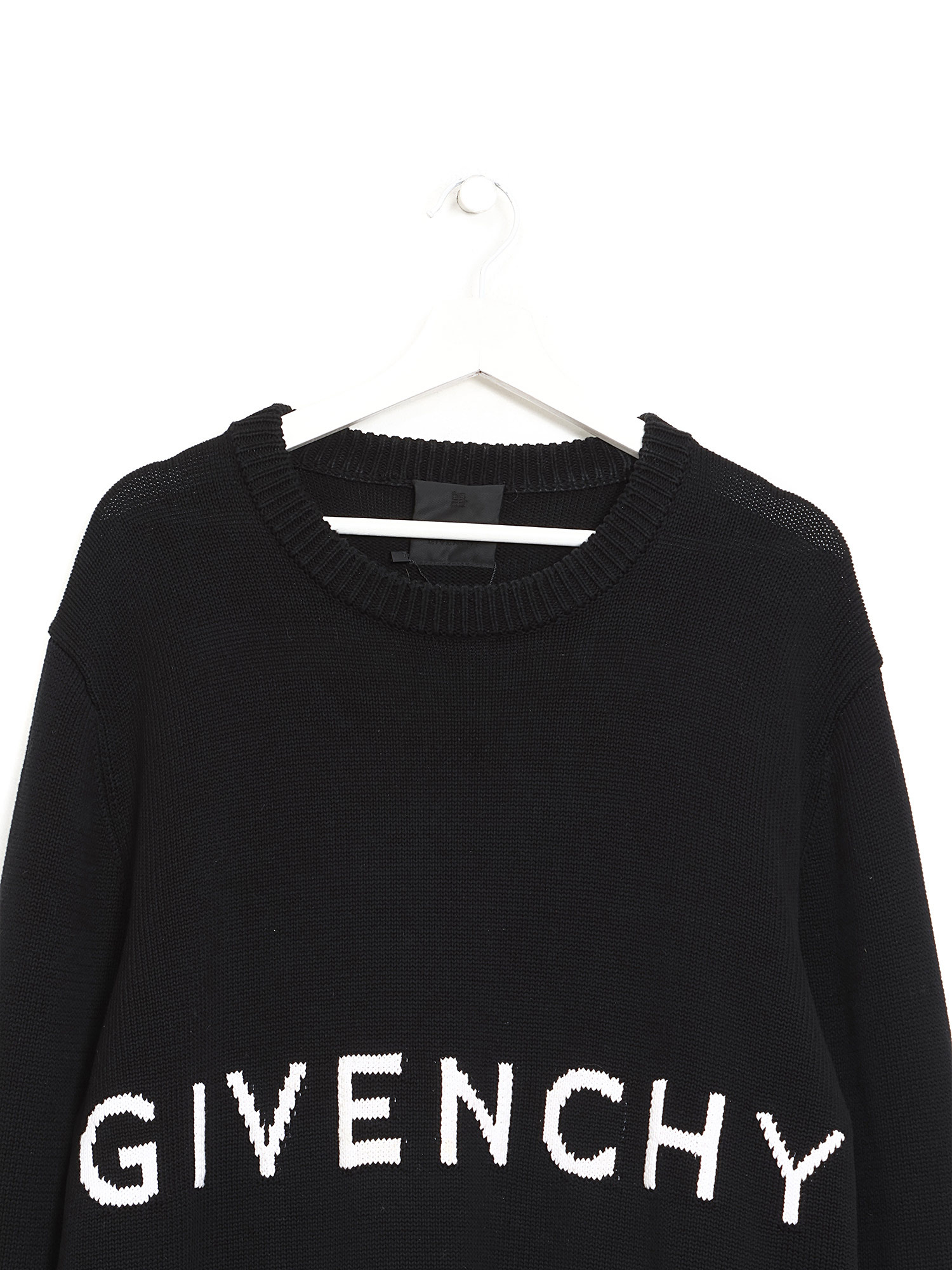 Black cotton knit sweater featuring a white logo pattern. Crew neck.