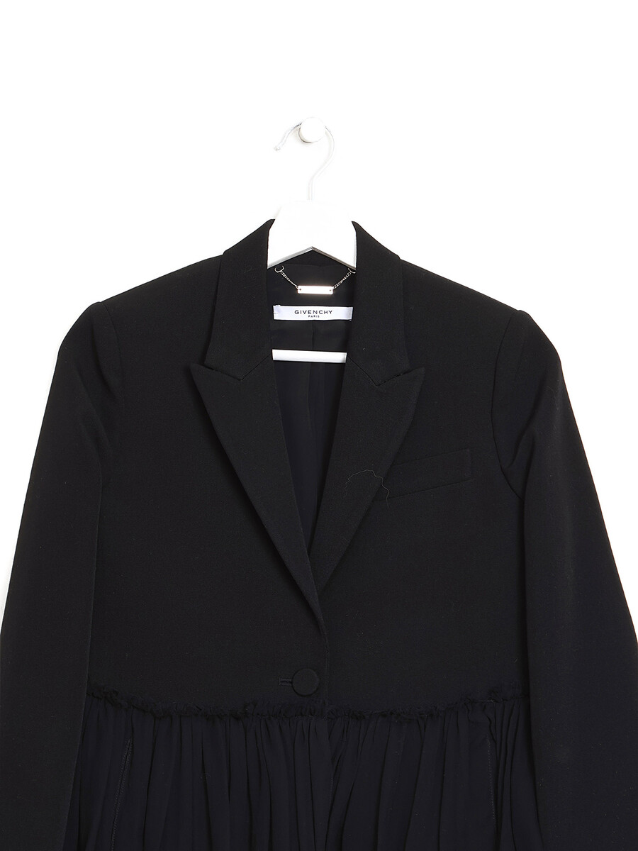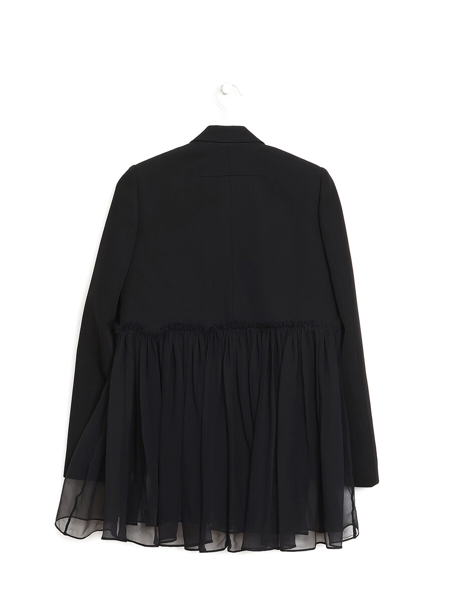 Sheer tulle hem blazer in black. Single-button closure. Notched lapel collar.