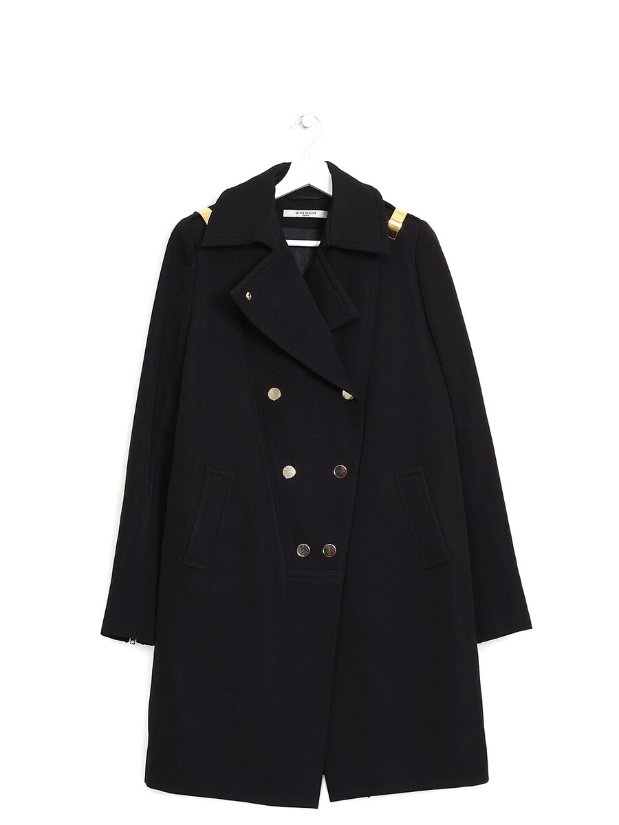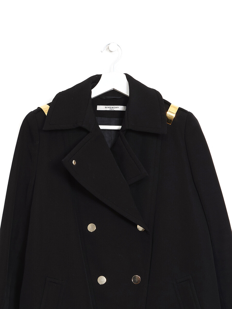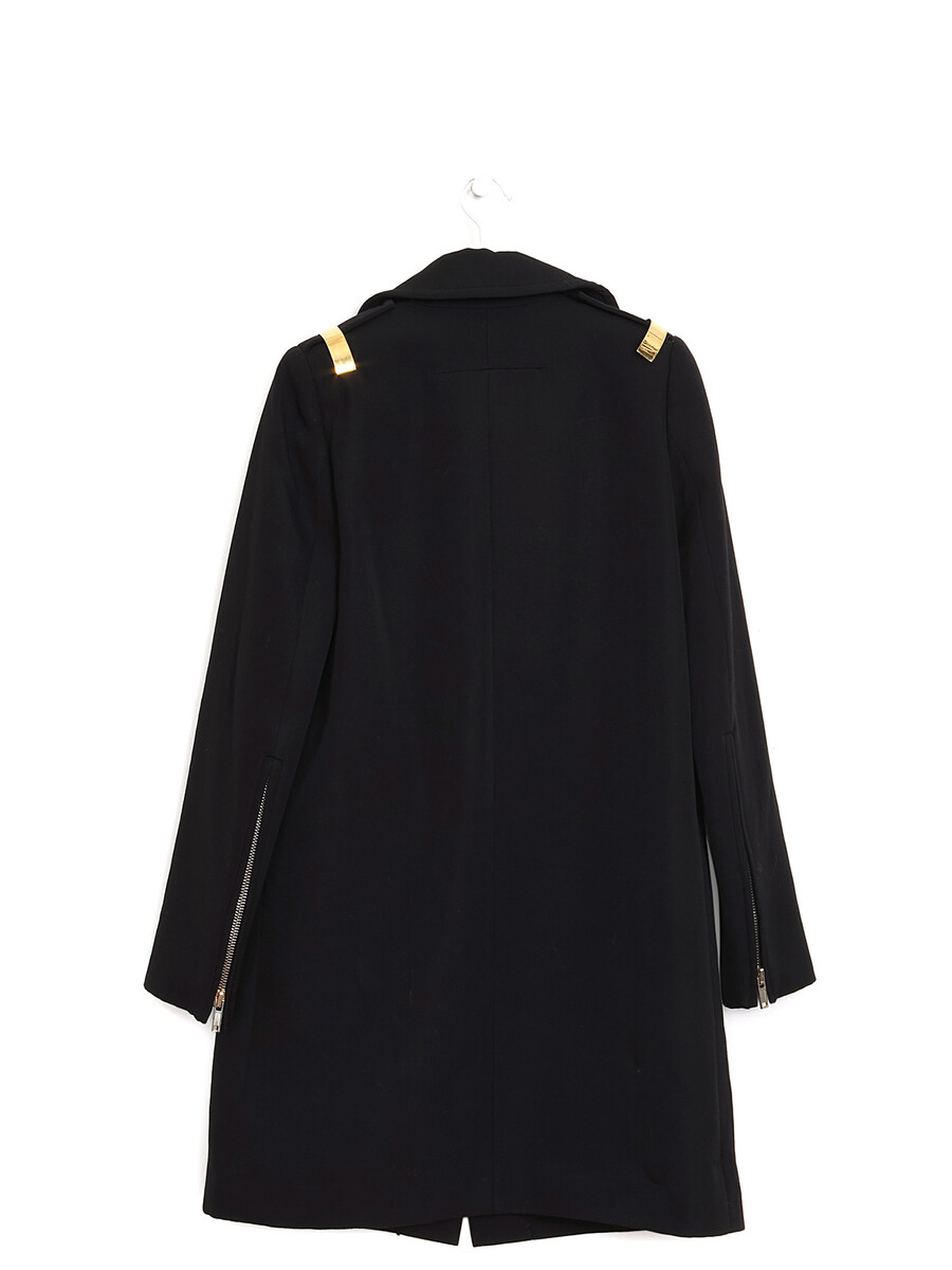 Navy long sleeve coat with double-breasted button front closure. Features a wide collar and side pockets.