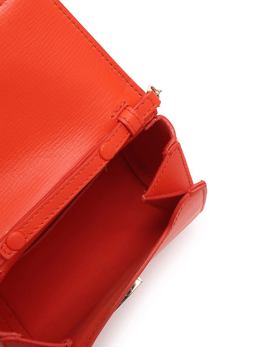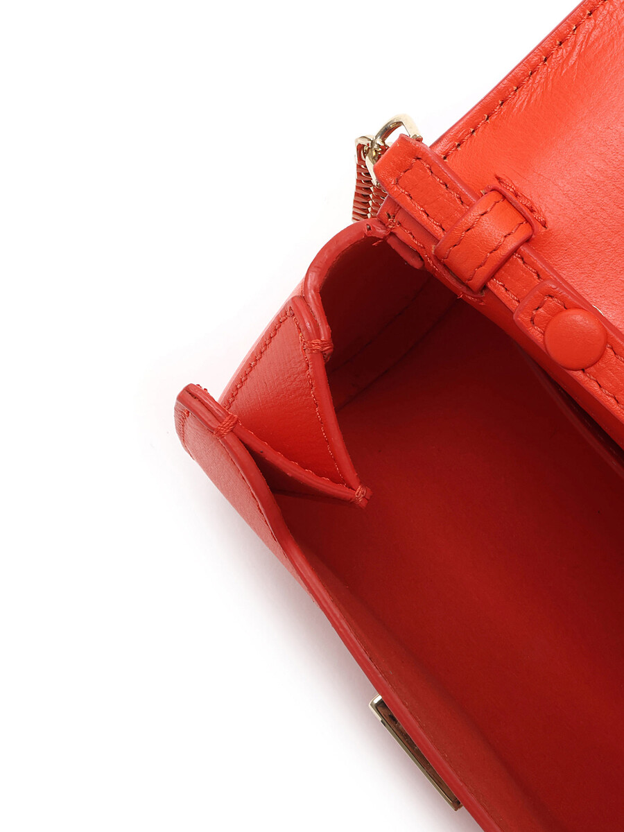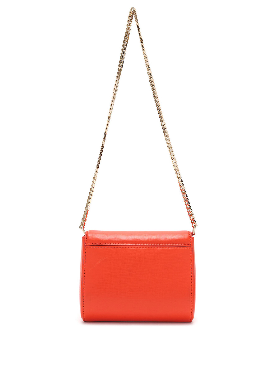 Mini chain bag with a flap and snap closure in vibrant orange. Gold-tone chain strap and hardware. Textured leather finish. Includes dust bag.