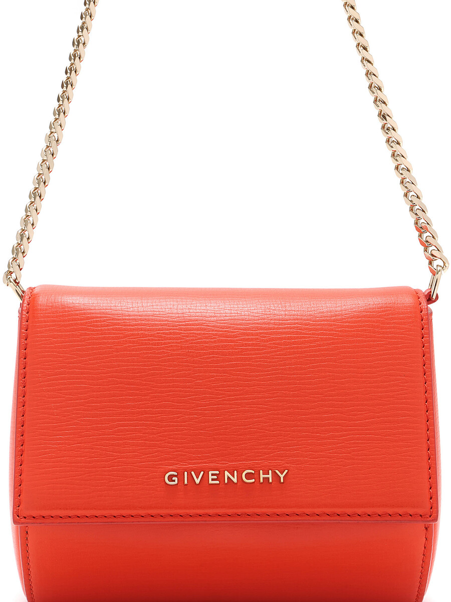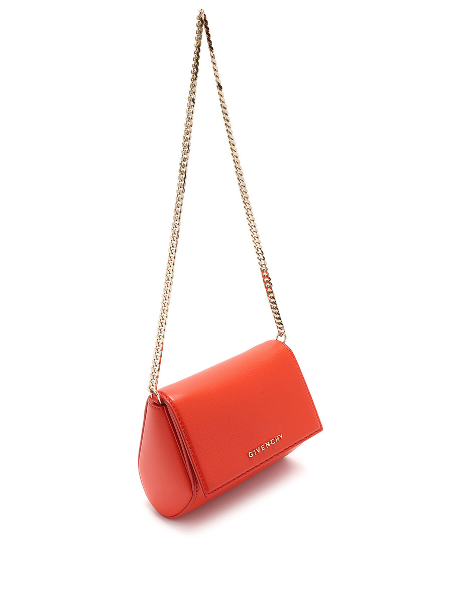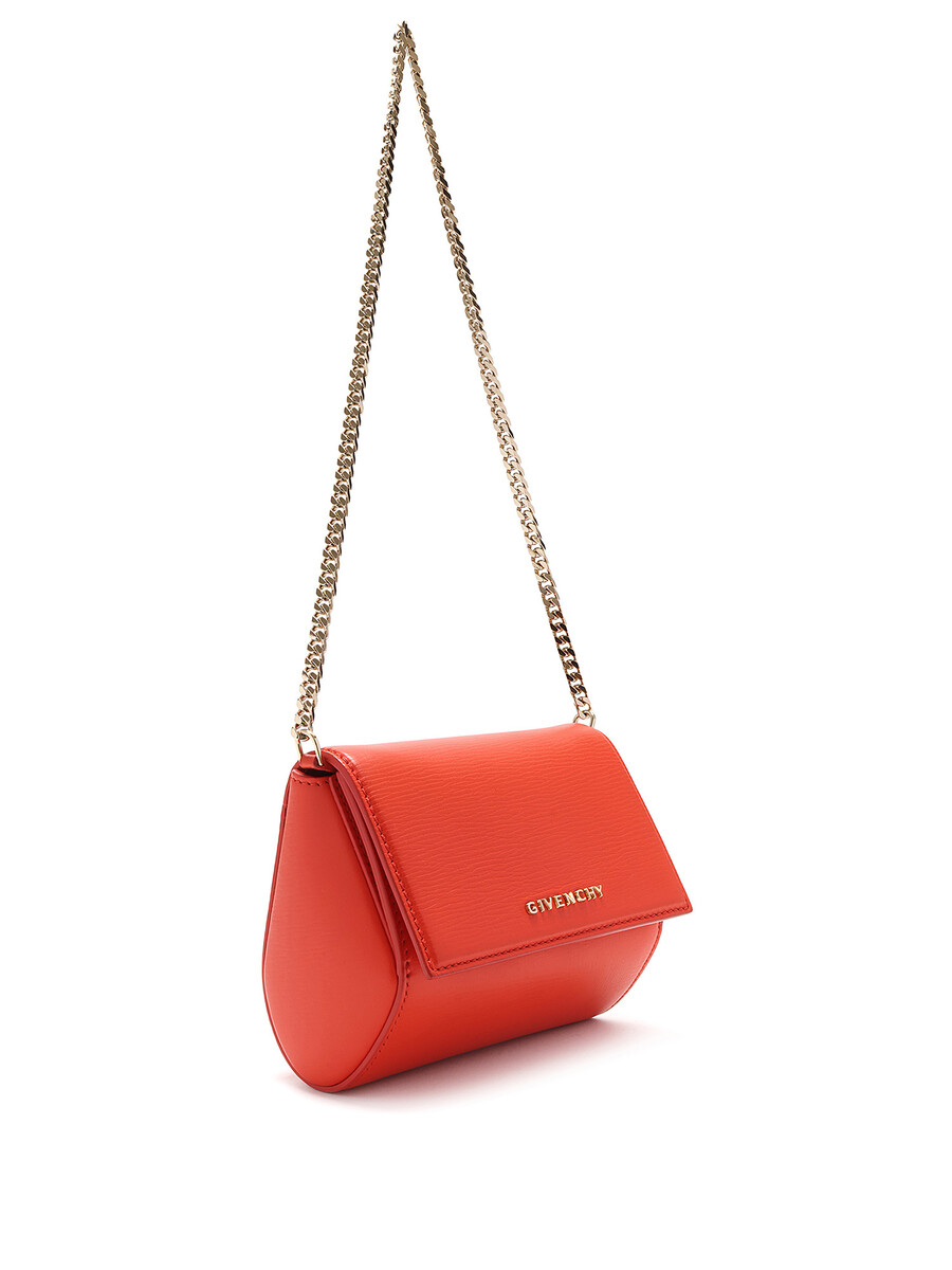 Mini chain bag with a flap and snap closure in vibrant orange. Gold-tone chain strap and hardware. Textured leather finish. Includes dust bag.