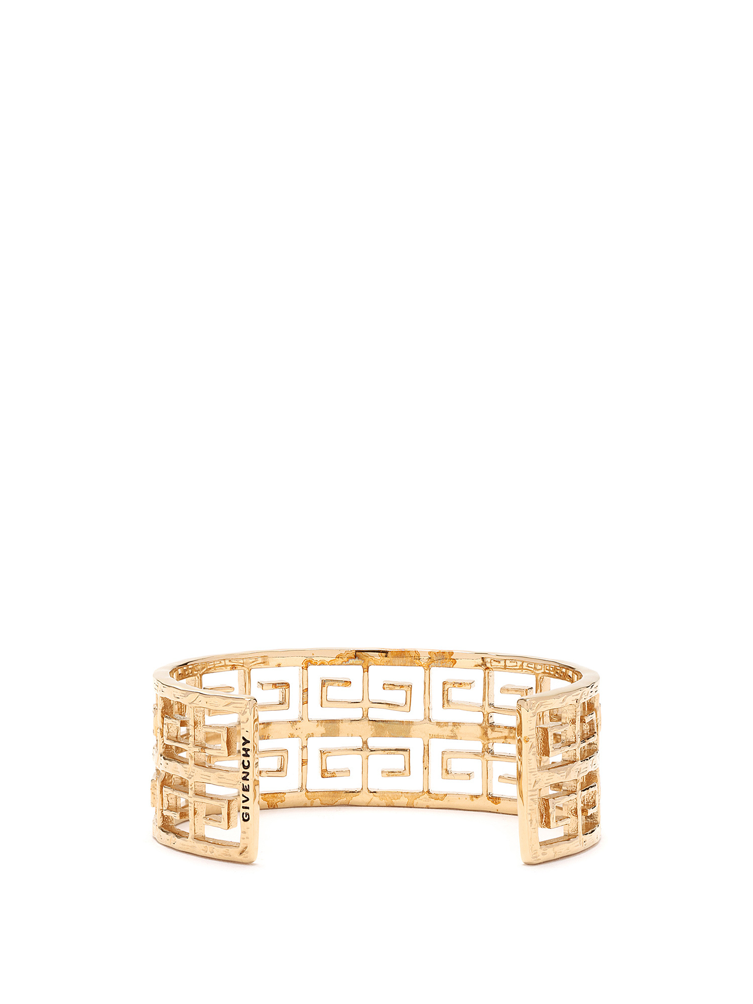 Gold-tone rigid bracelet adorned with Greek key motif. Comes with box and cleaning cloth.