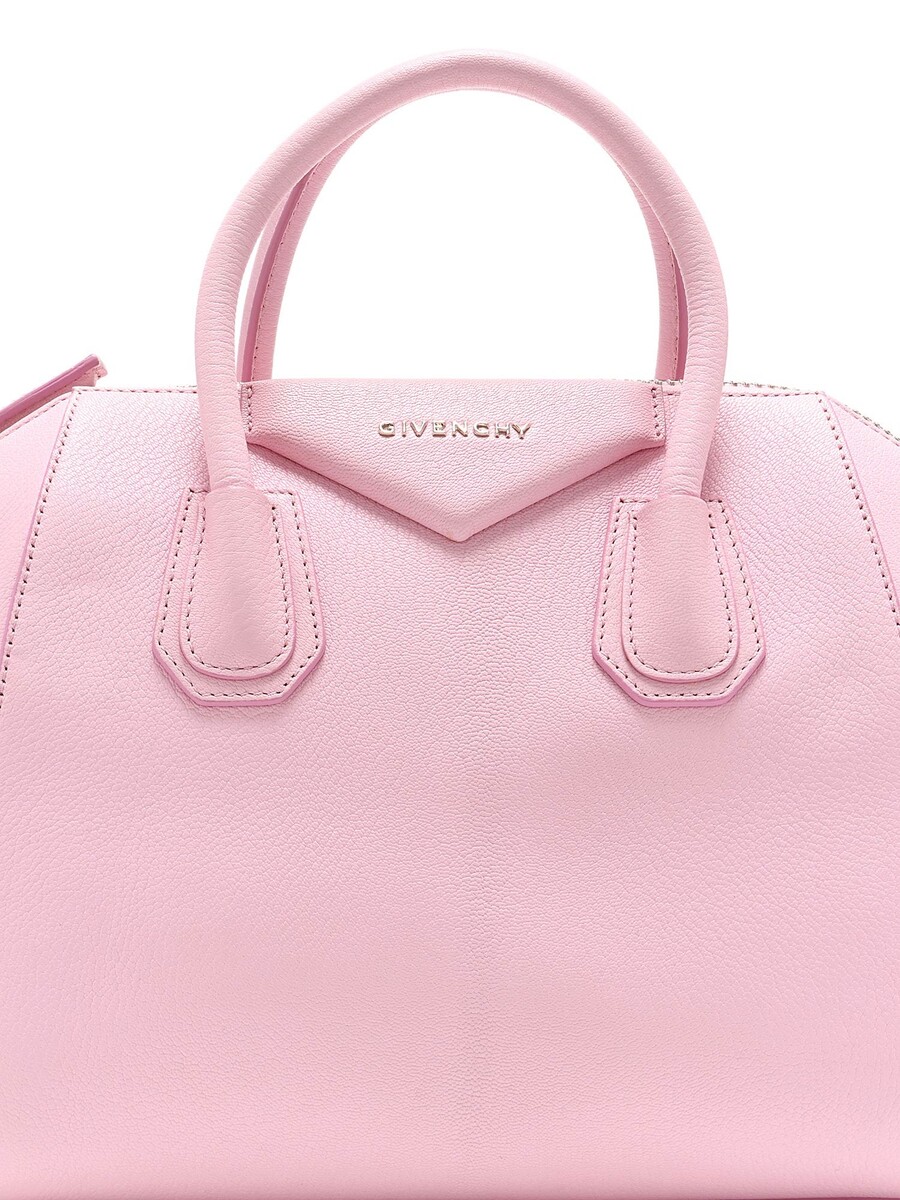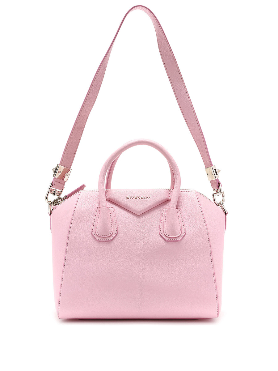 Leather satchel bag in a vibrant pink shade. Featuring the iconic Givenchy logo. Equipped with a zipper closure, sturdy top handles, and a detachable shoulder strap. Adorned with silver-tone hardware and complemented by leather trims. Comes with a duster.