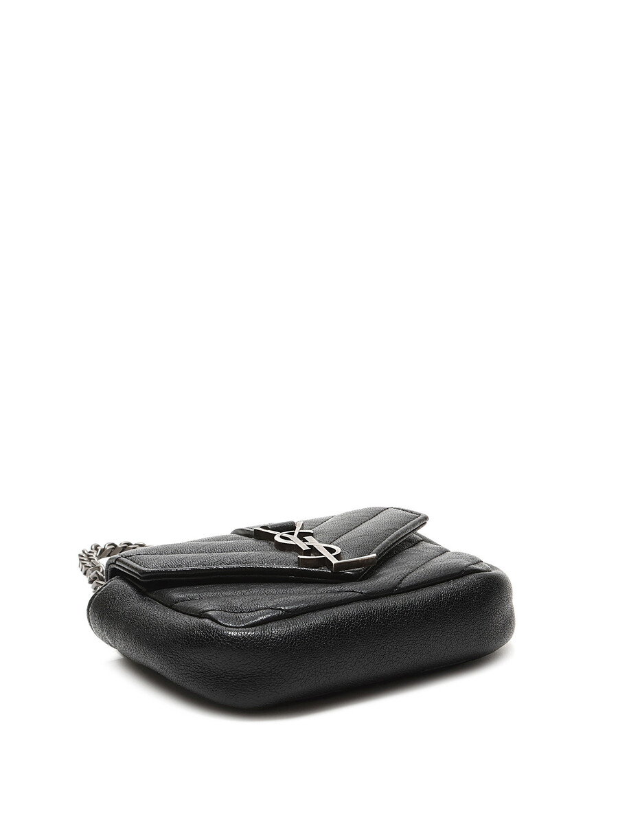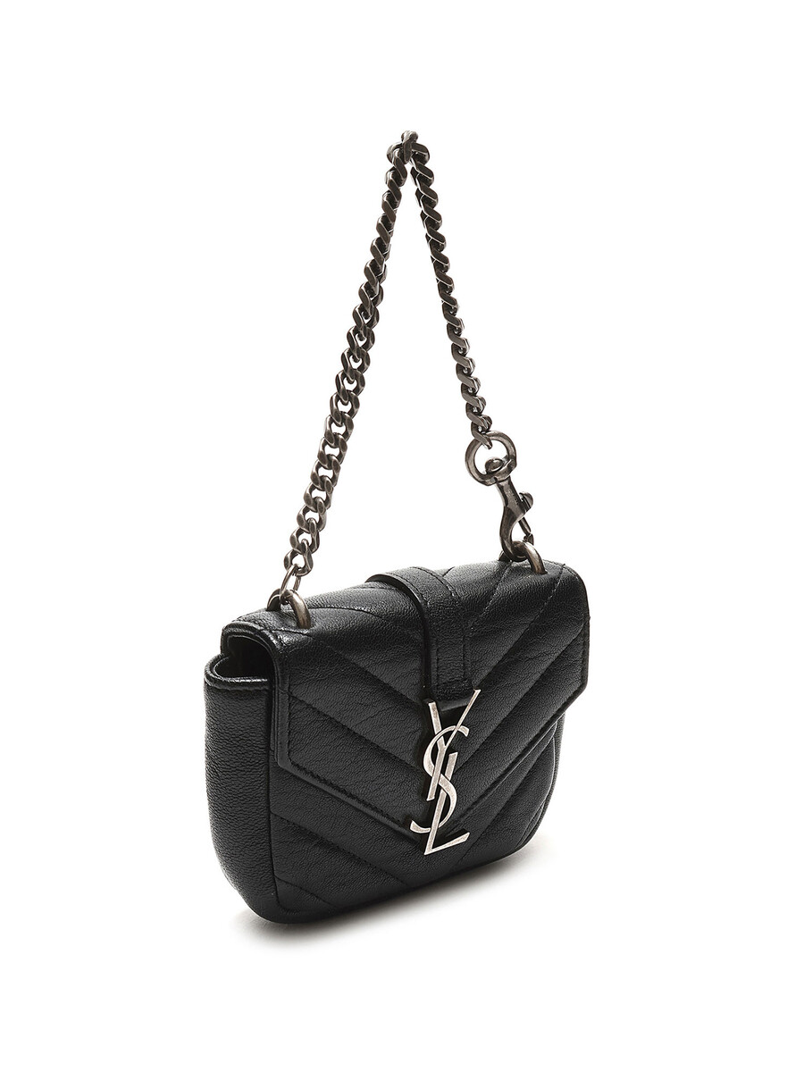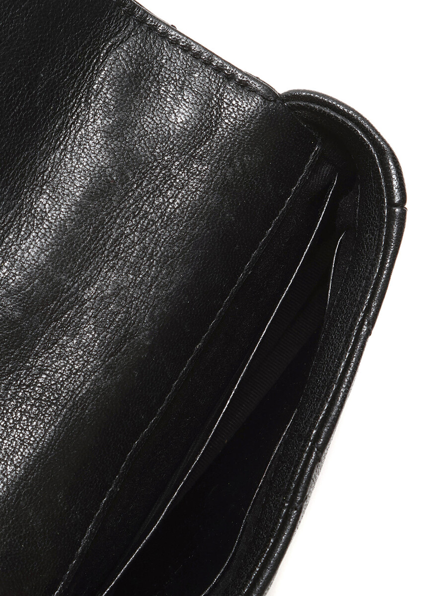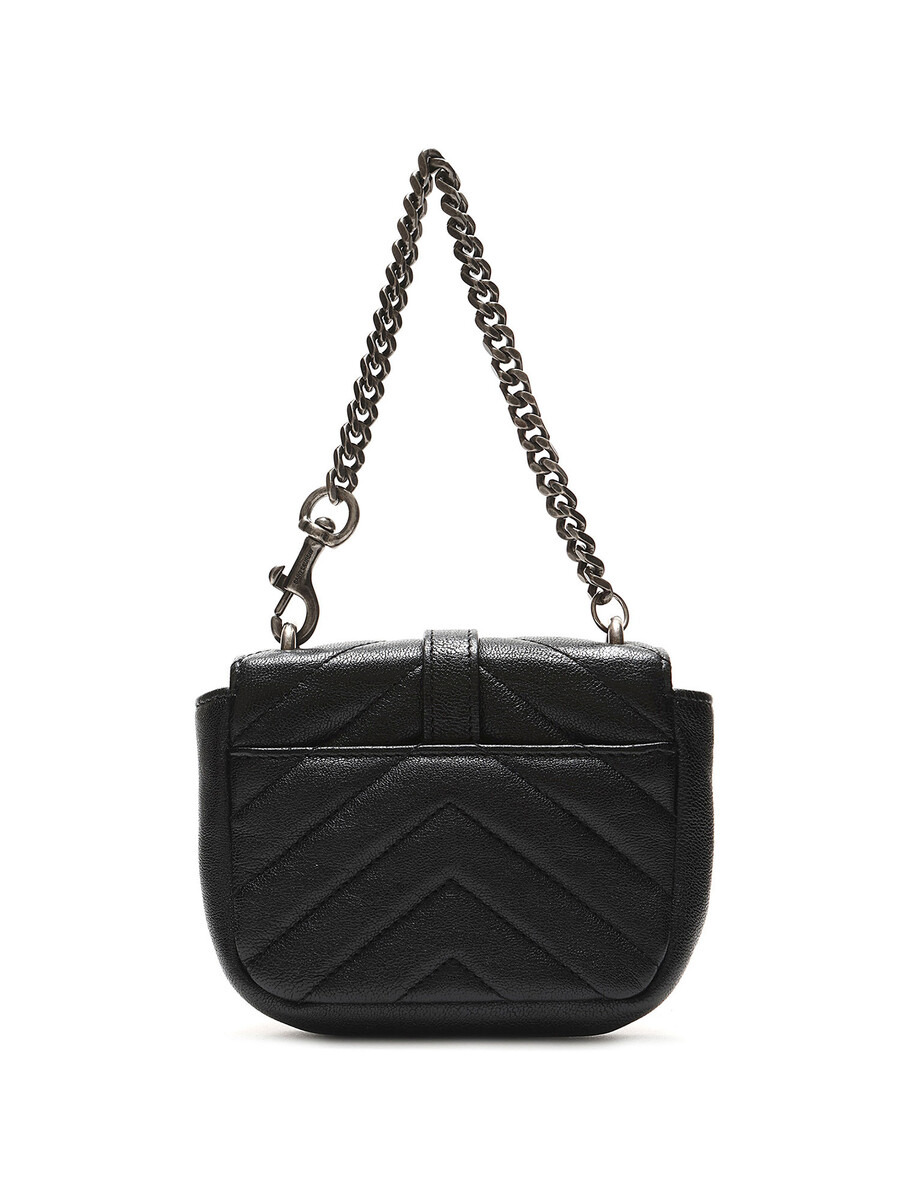 Chevron quilted leather mini bag in black. Flap with magnetic snap closure. Silver-tone hardware. Chain strap. Compact size. Comes with dust bag.