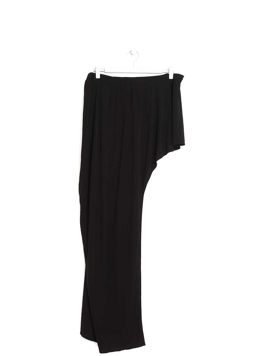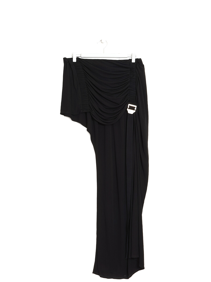 Asymmetrical ruched mini skirt in black. Features a bicolor metal buckle on the front, adding a touch of edgy sophistication. Comes with tags.