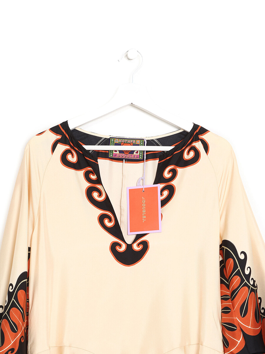 Long sleeve tunic dress with a geometric pattern in shades of orange, black, and beige. Features a V-neckline.