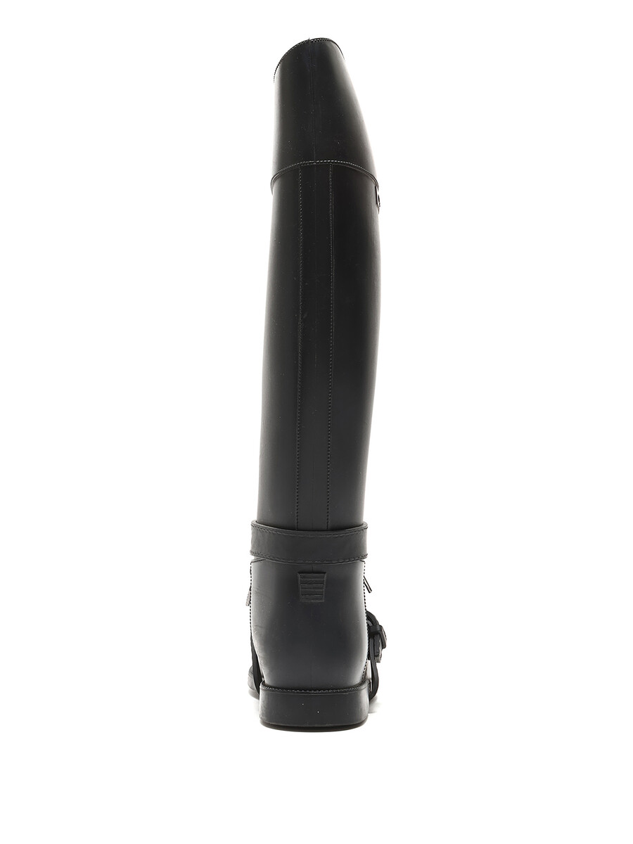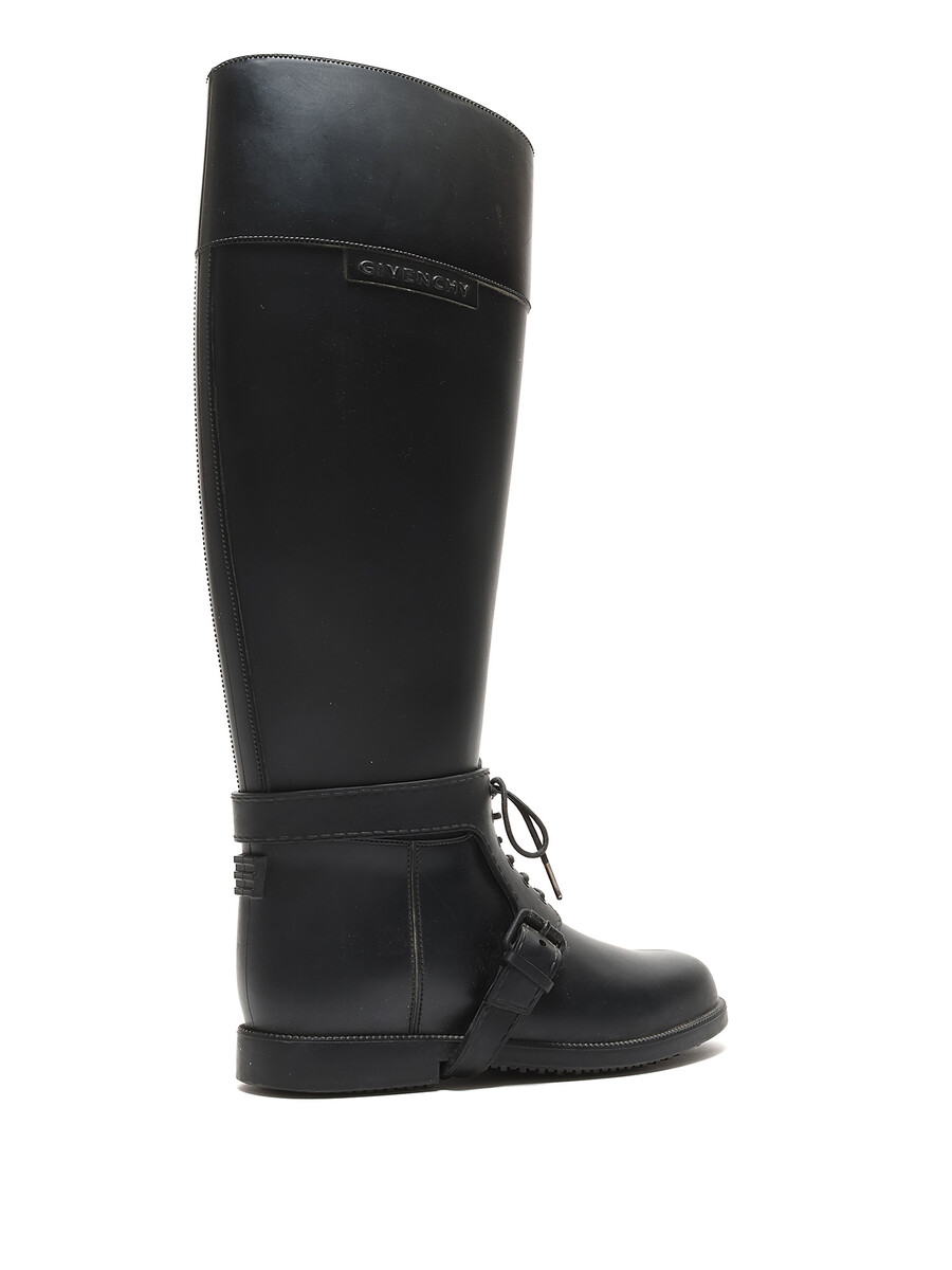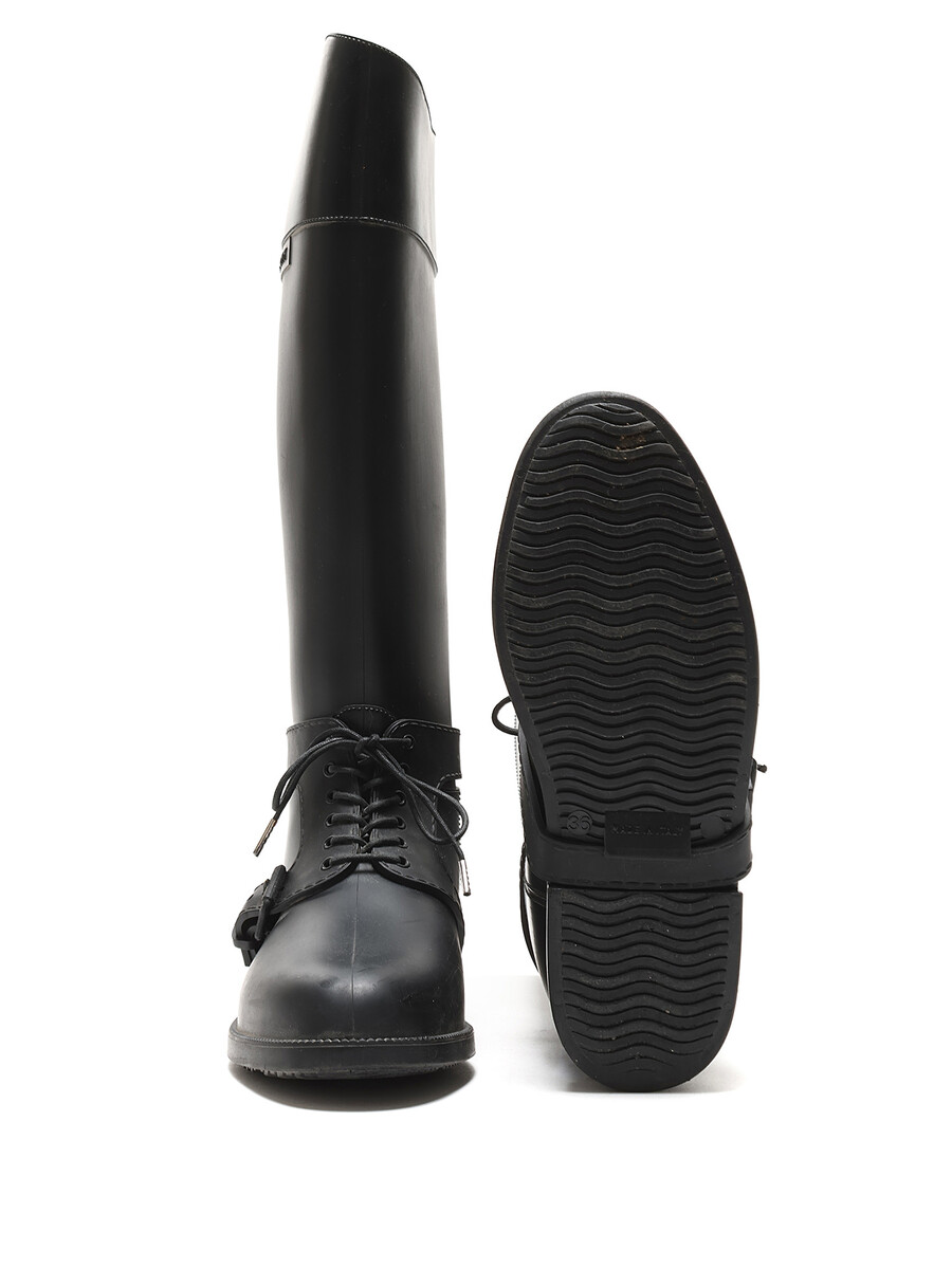 Black knee-high rubber boots with lace-up and decorative buckle. Round toe. Durable rubber sole.