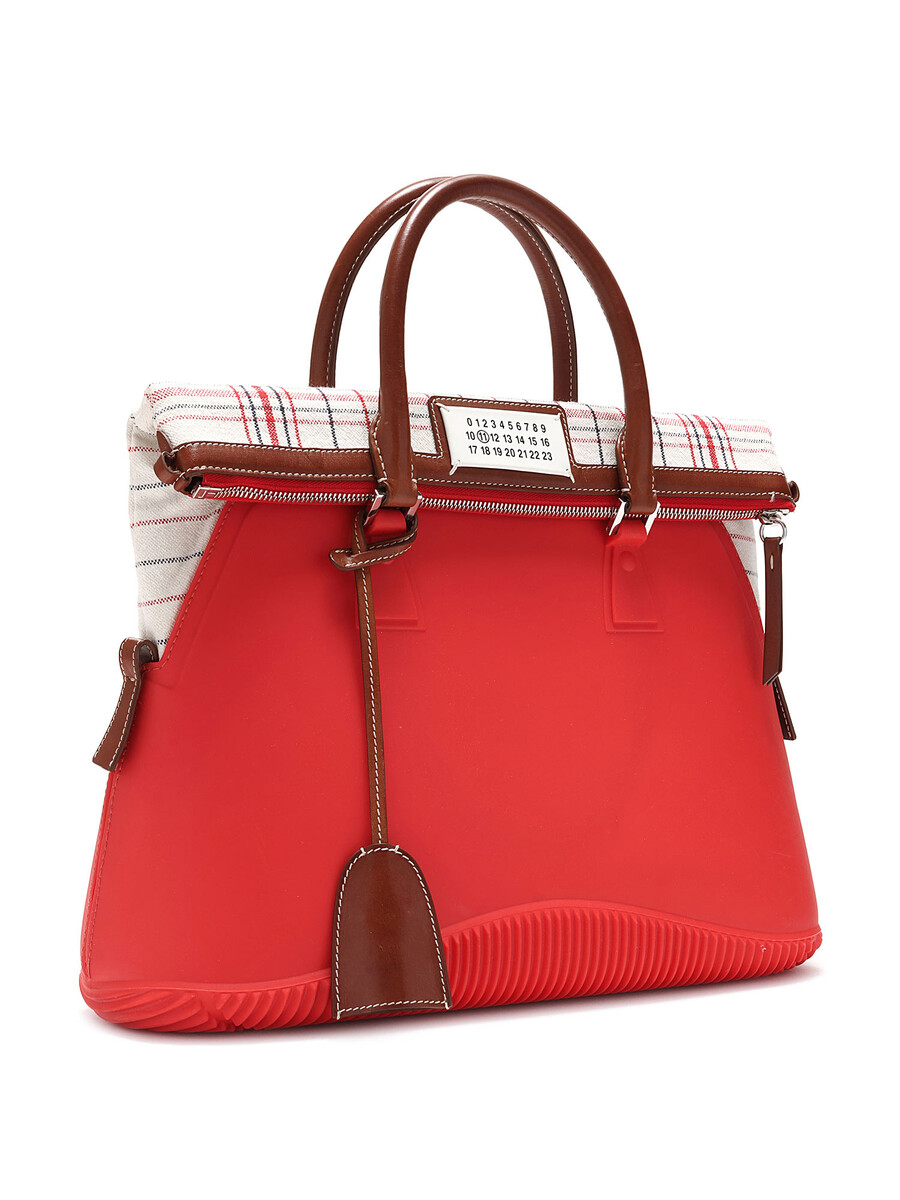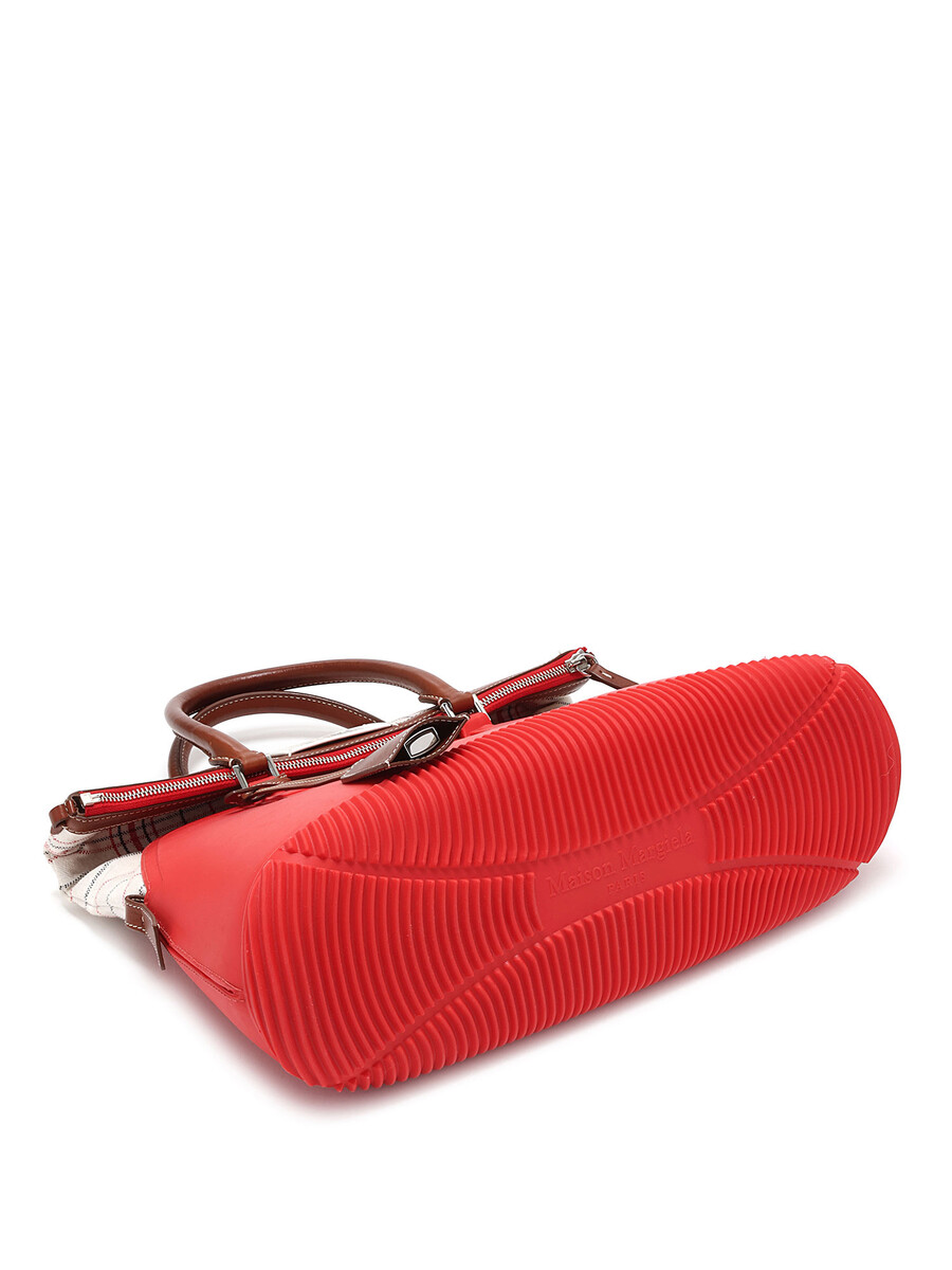 Red rubber and white, blue, and red plaid fabric handbag. Brown leather trim with white topstitching. Dual rolled leather handles. Silver-tone metal hardware. Signature logo patch at front and four-stitch detail at back. Top zip closure with flap. Includes lock and shoulder strap.