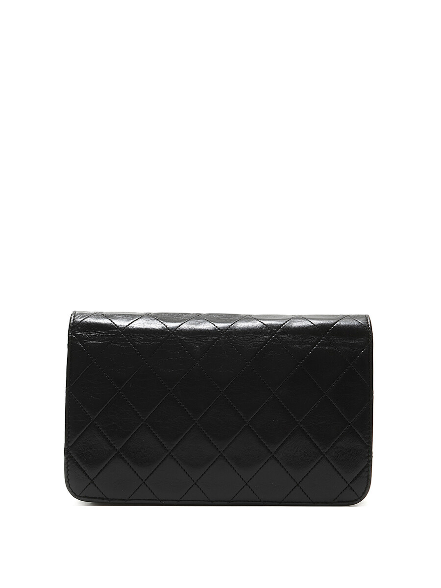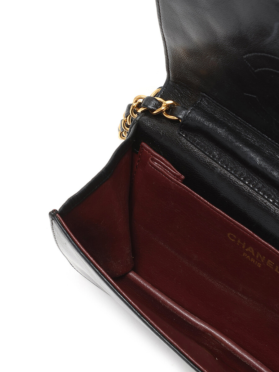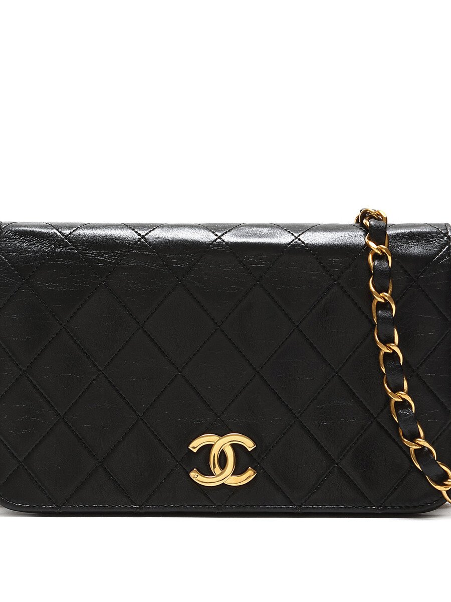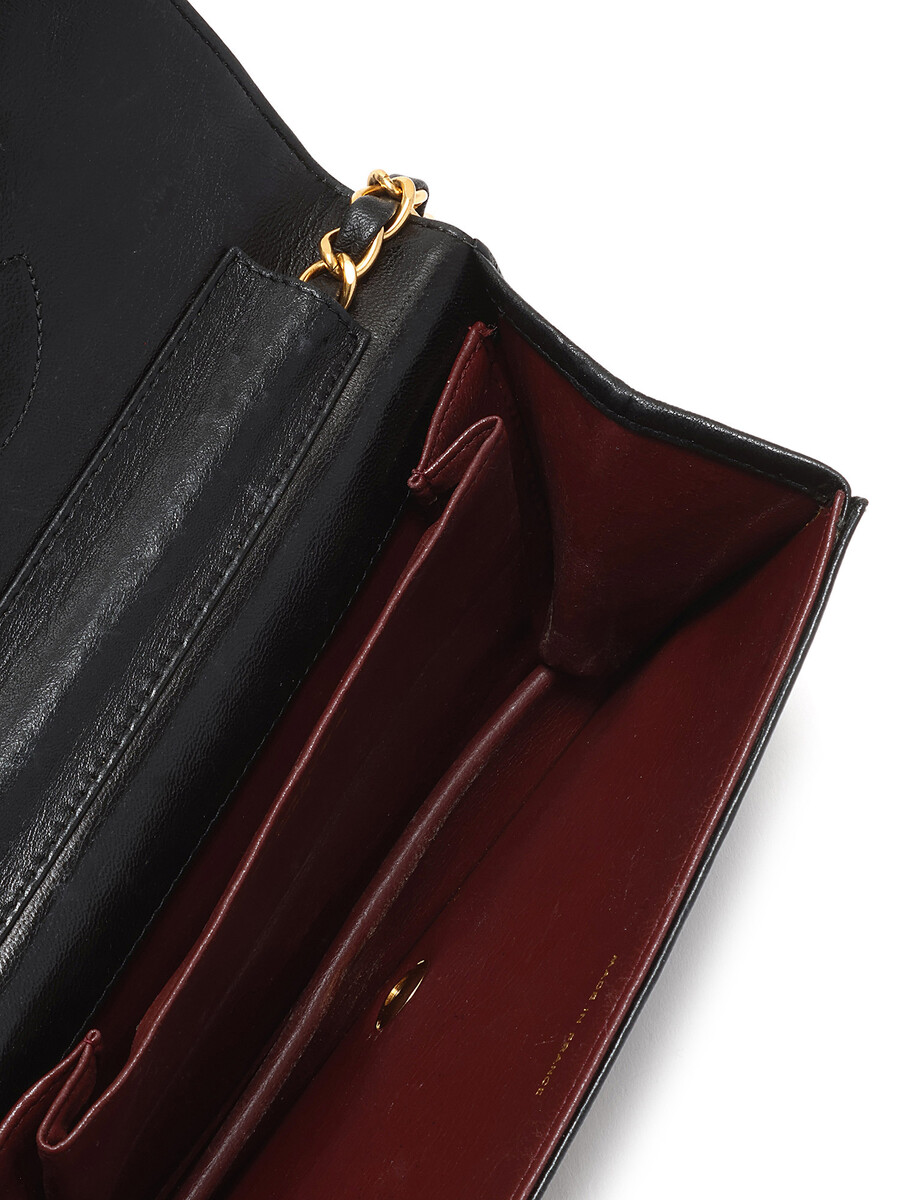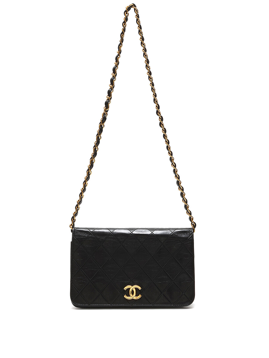 Classic quilted flap bag in black leather. Interwoven leather and chain shoulder strap. Gold-tone hardware. Push-lock closure.