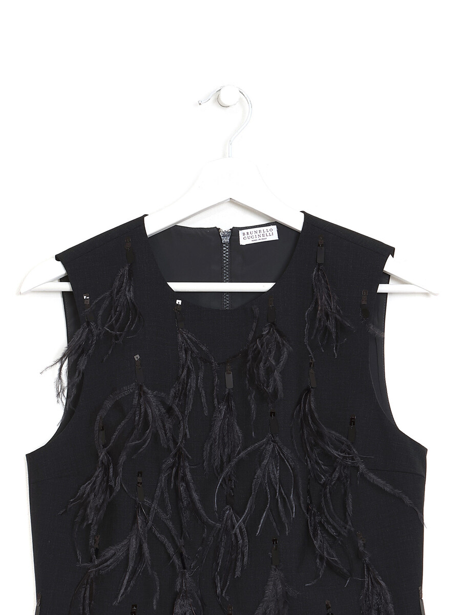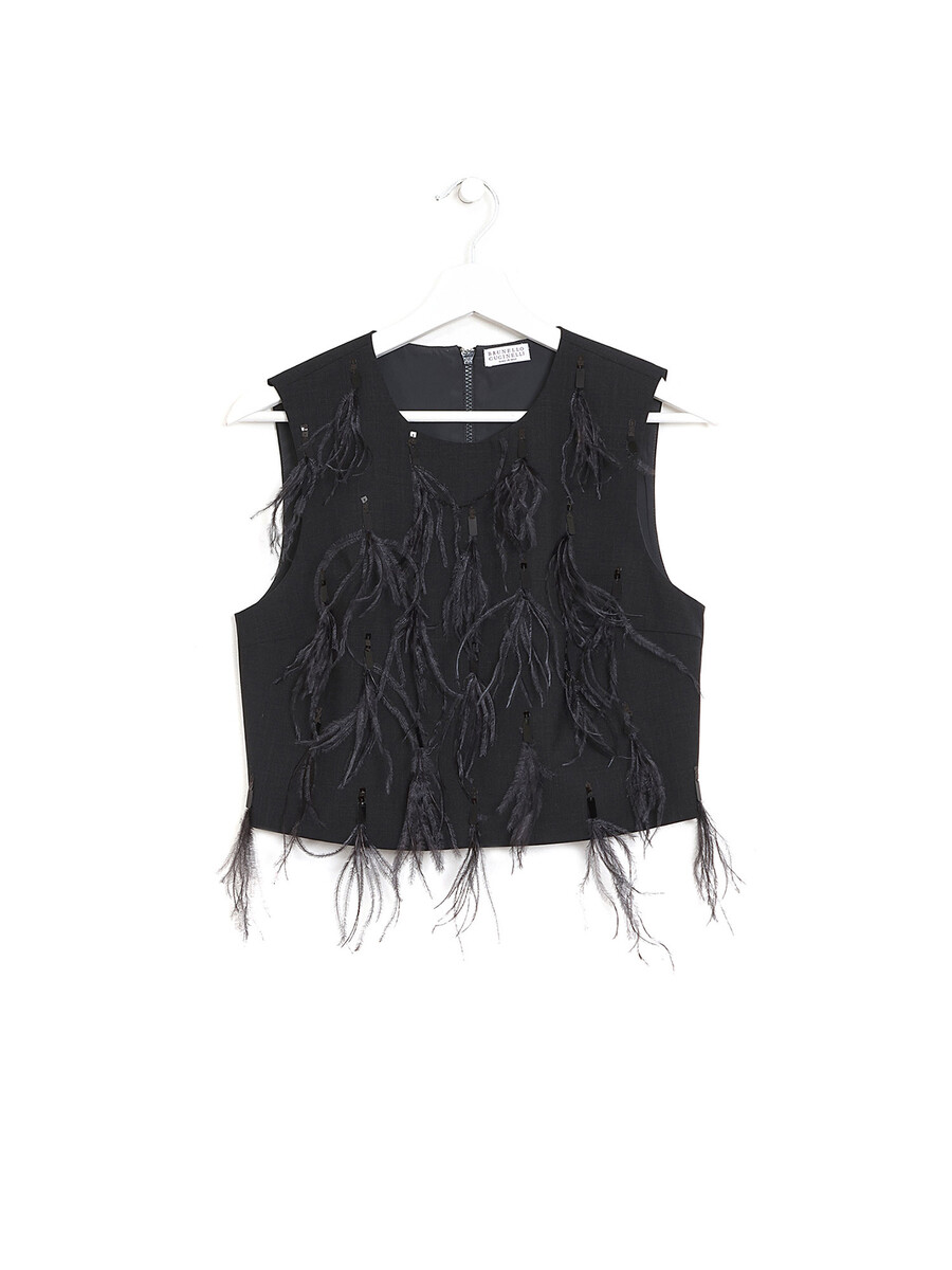 Sleeveless black top with feather details. Round collar. Zipper closure.
