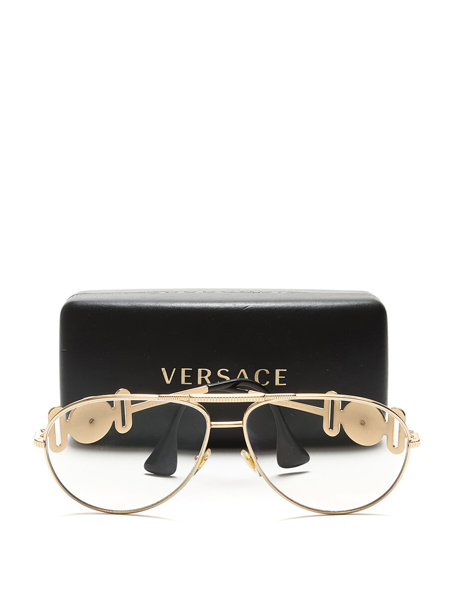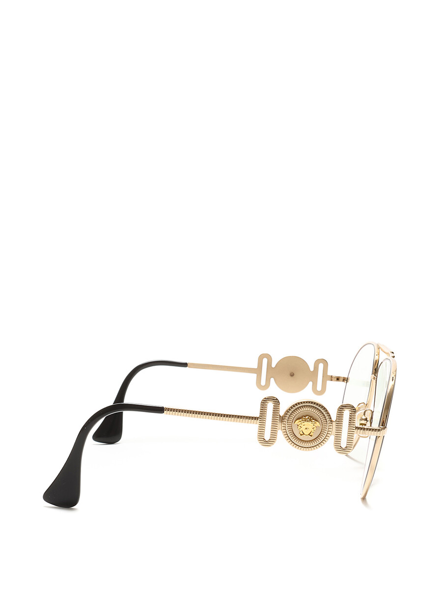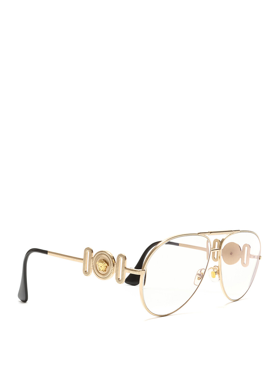 Gold-tone metal eyeglasses featuring the iconic Medusa emblem. Engraved logo detail at temples. With case.