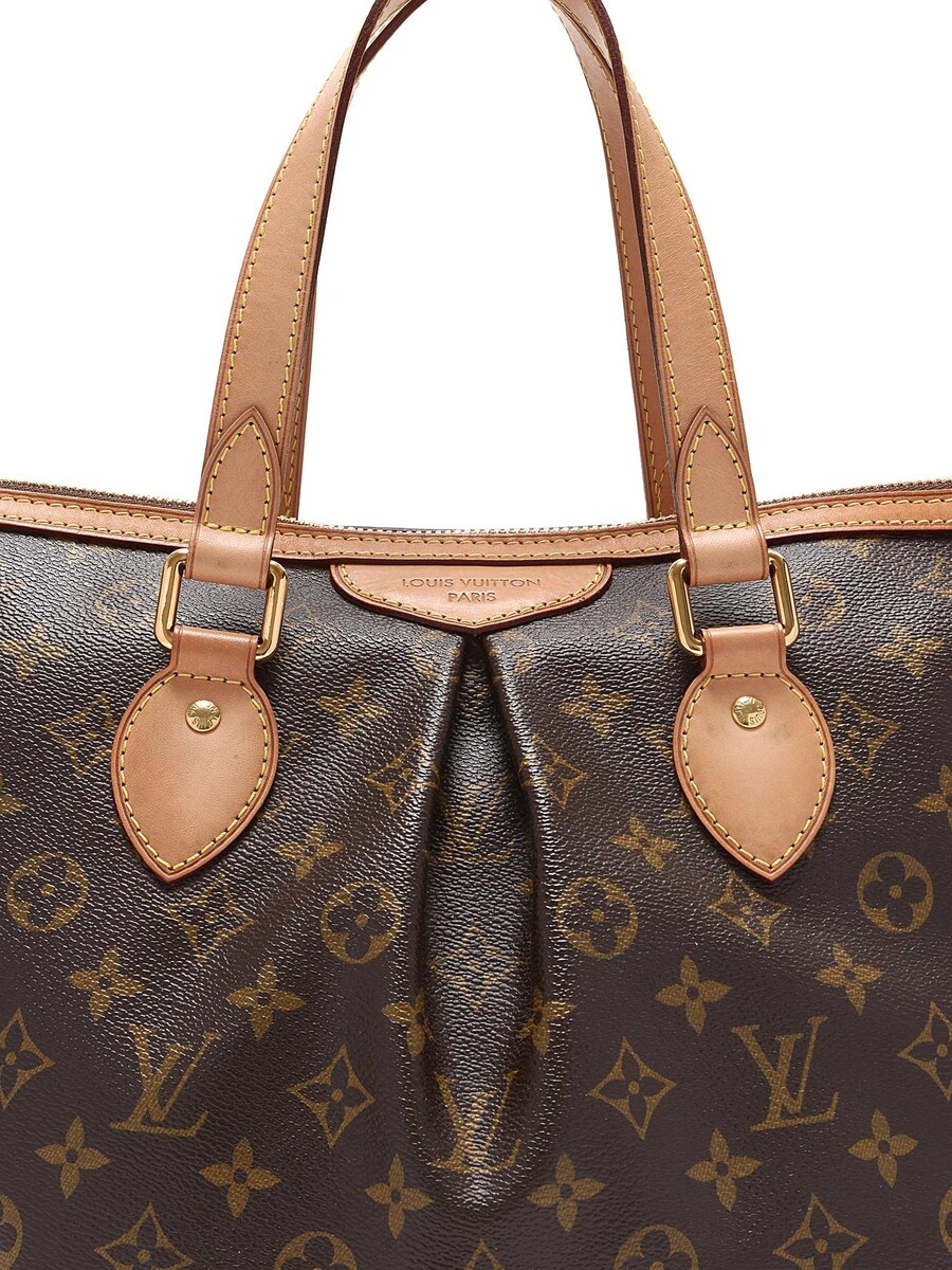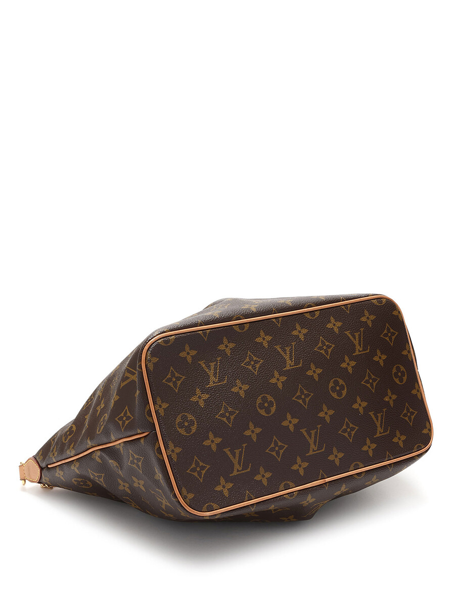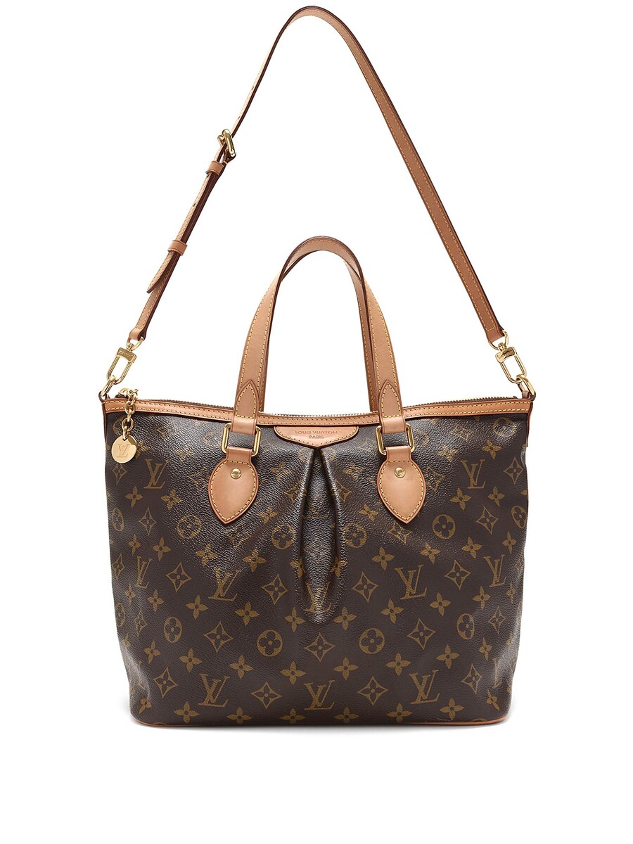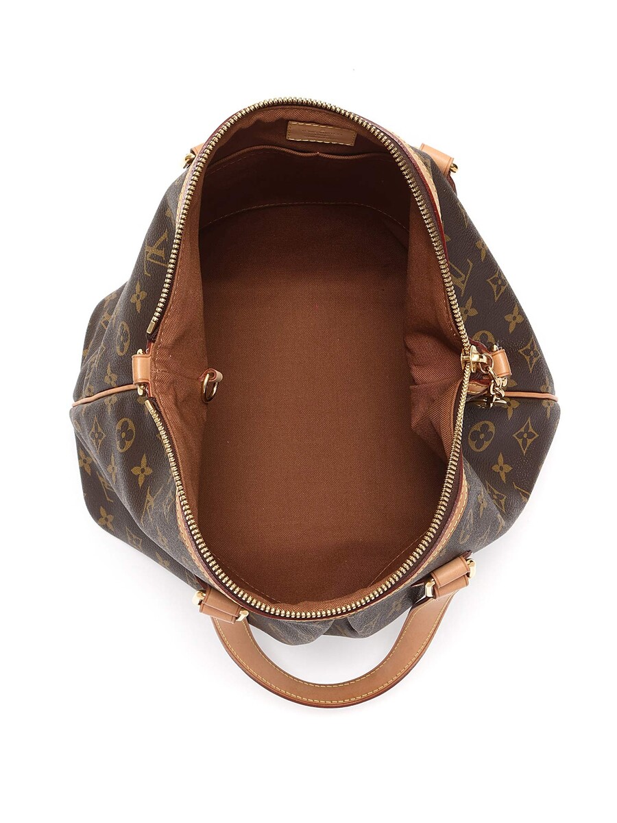 Monogram coated canvas handbag with tan leather accents. Zipper closure. Leather handles and detachable strap. Gold-tone hardware.