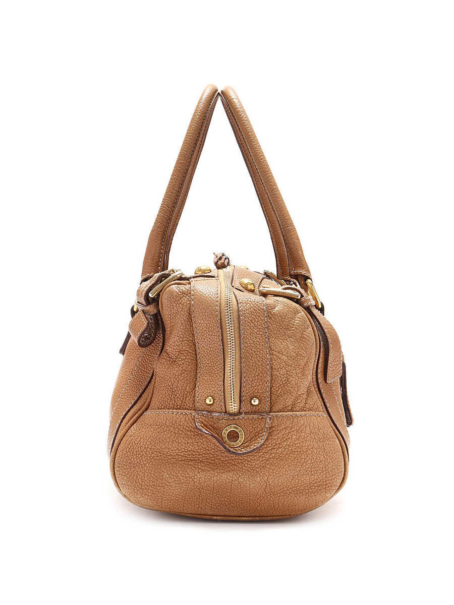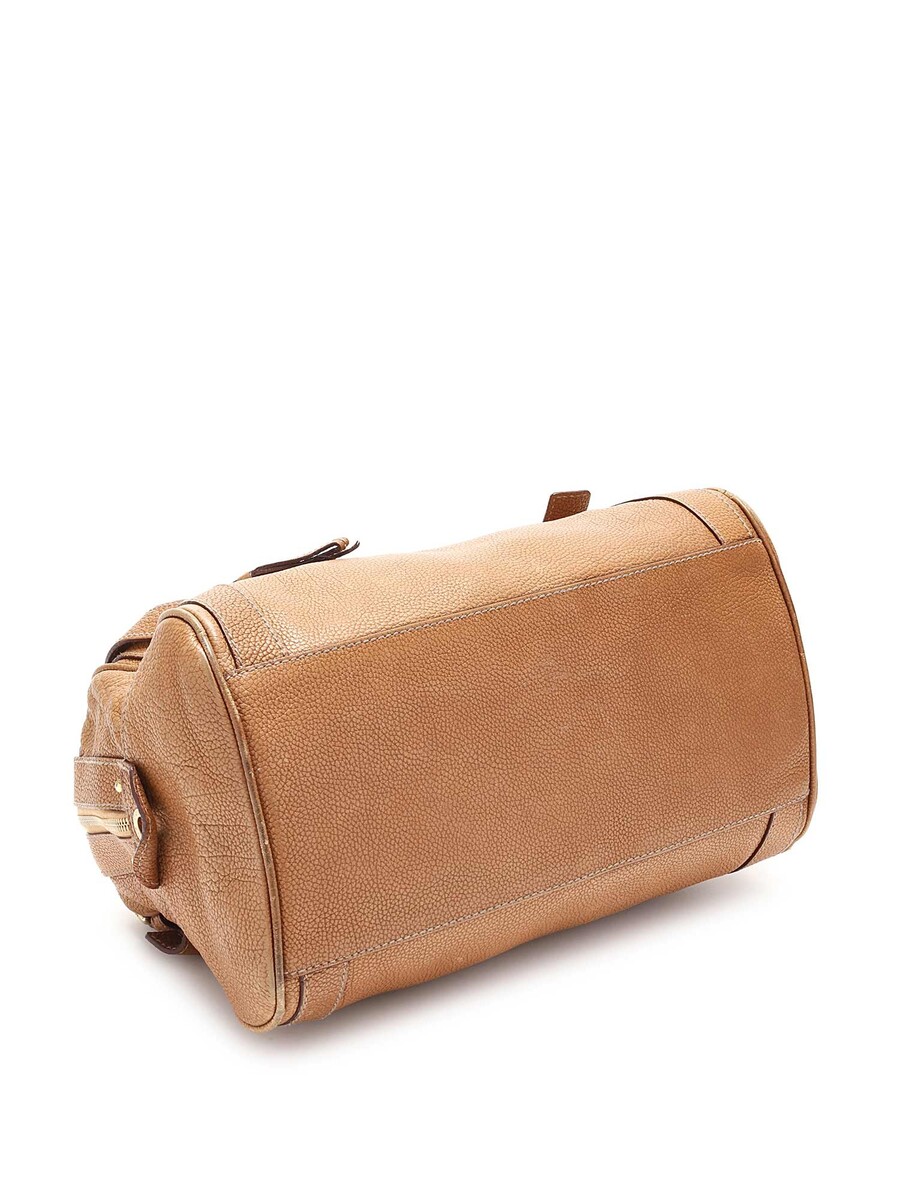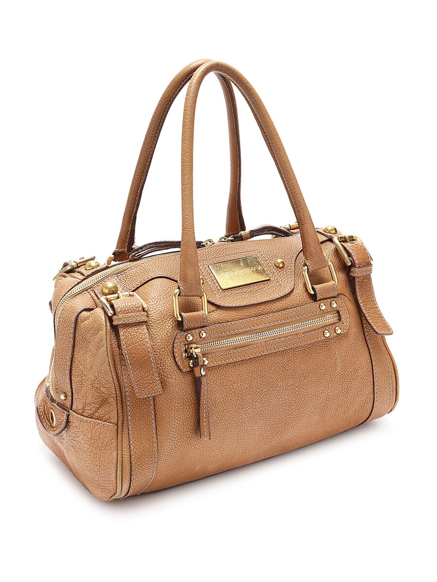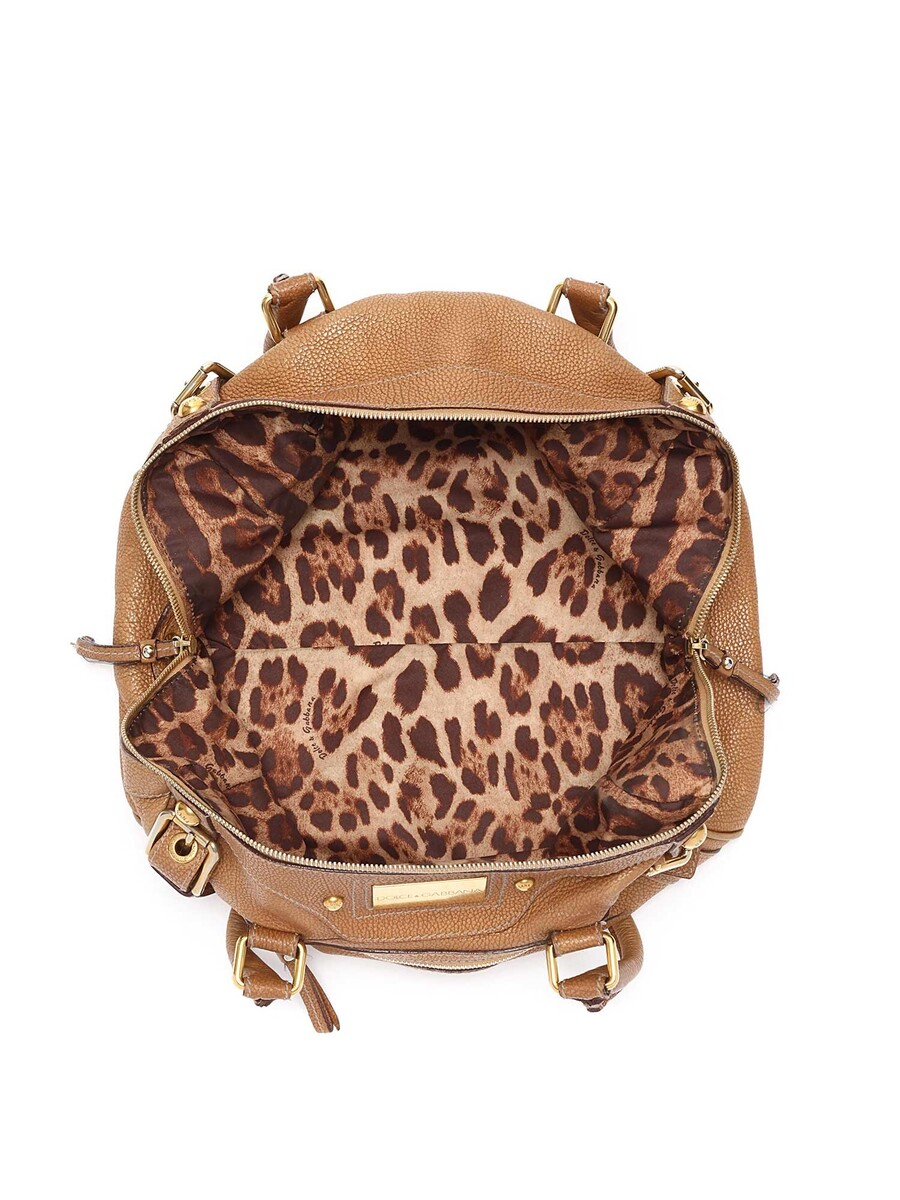 Grained leather satchel bag in tan with gold-toned hardware and logo plate. Zipper closure. Double rolled leather handles. Leopard print interior lining.
