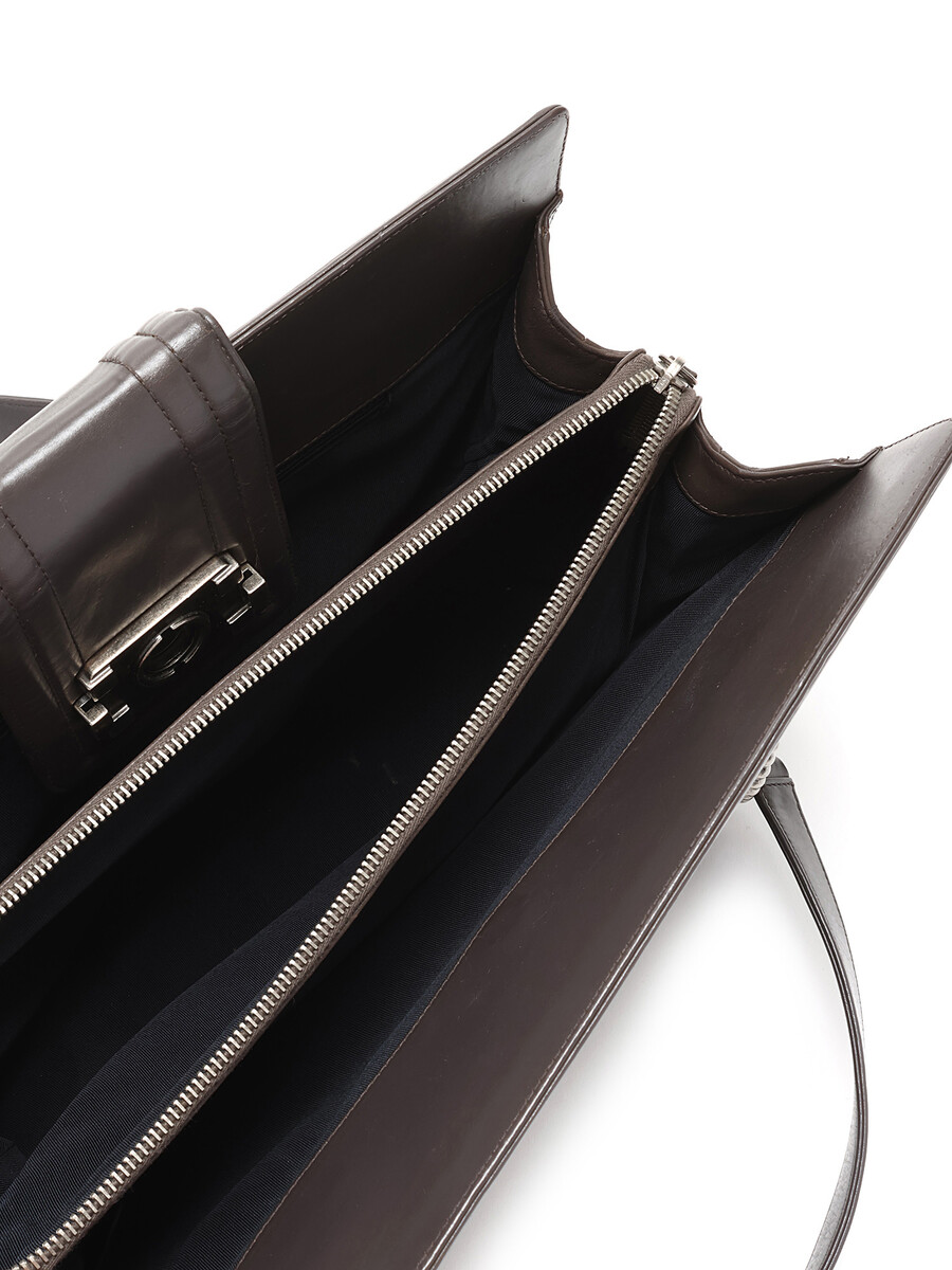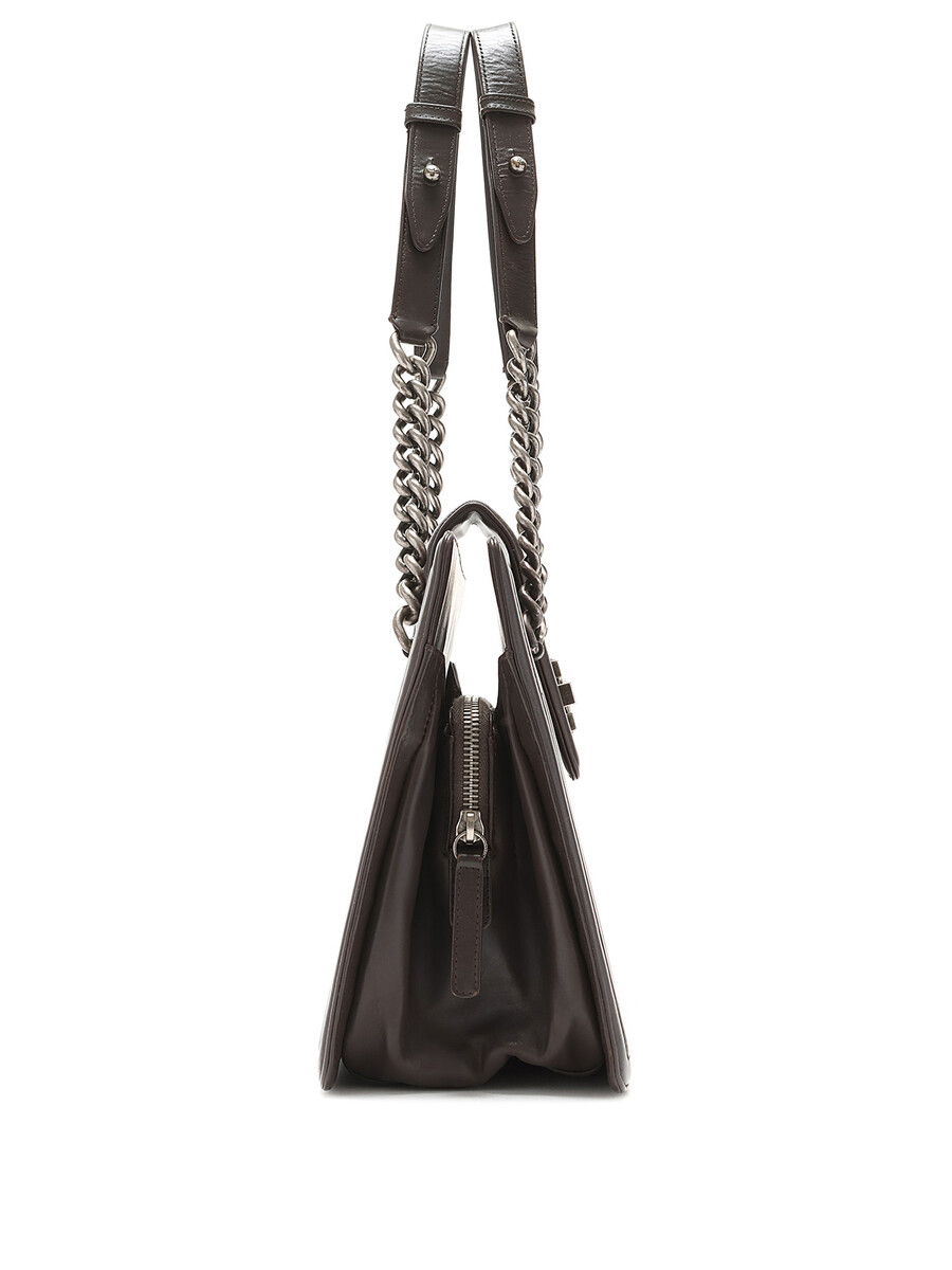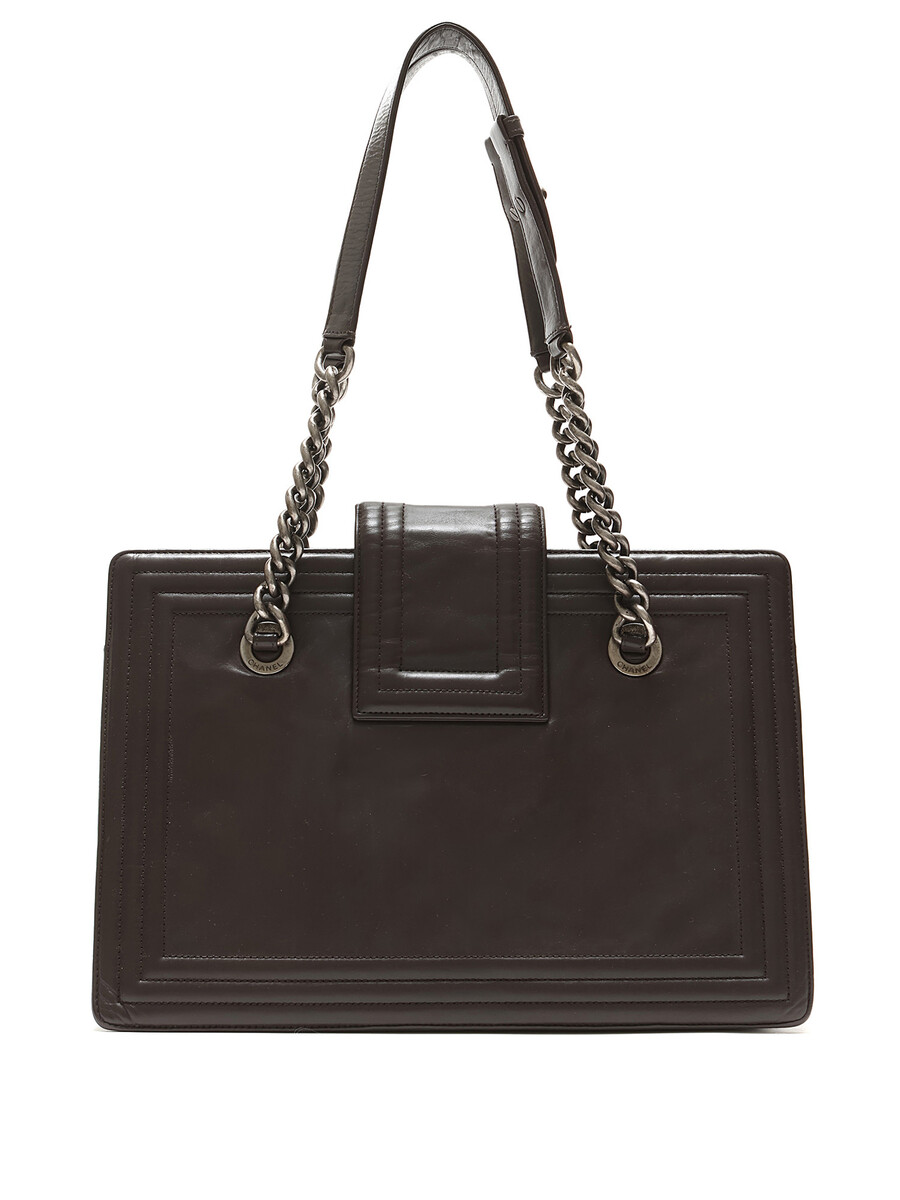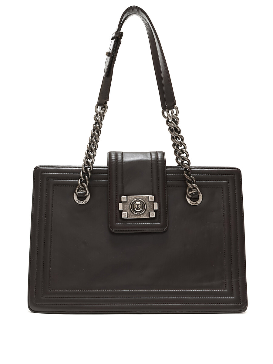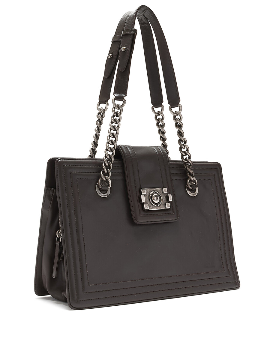Chanel taupe Boy Tote bag featuring a turn-lock closure. Leather strap and signature chain. Gunmetal hardware.
