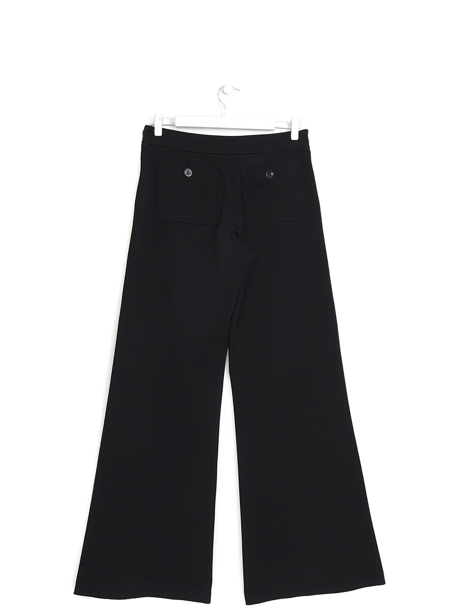 Straight-leg black trousers with nautical buttons in black and gold tones. Front button and side zip closure. Four pockets.