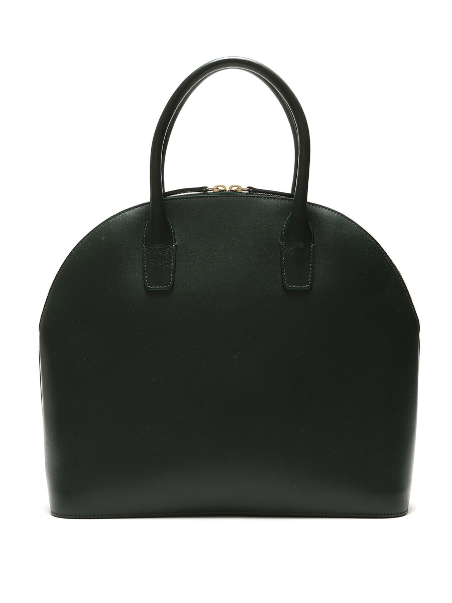 Top handle leather bag in a dark green hue. Features rolled leather handles and a zip-top closure. Gold-tone hardware. With dust bag.