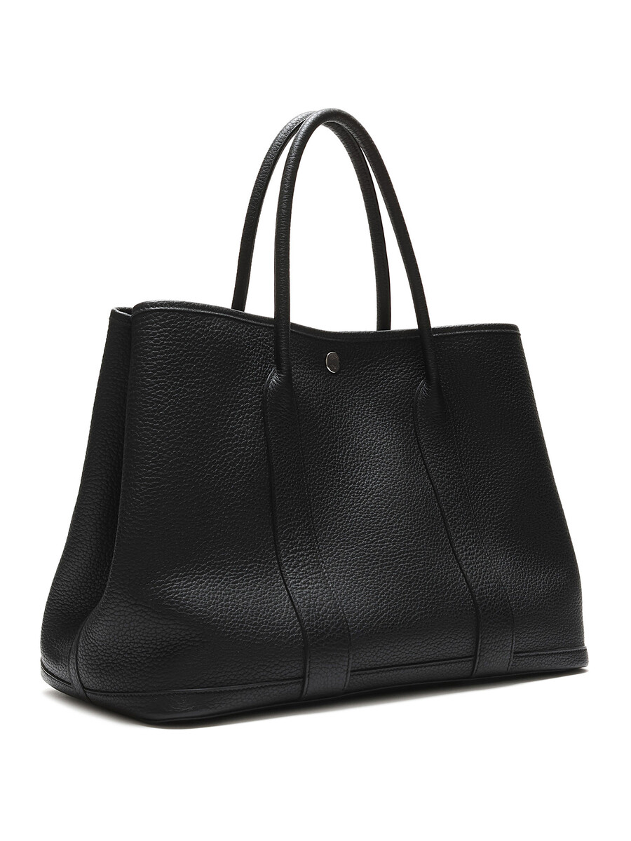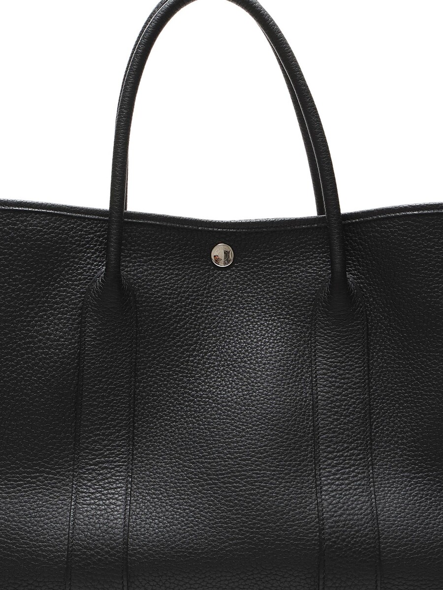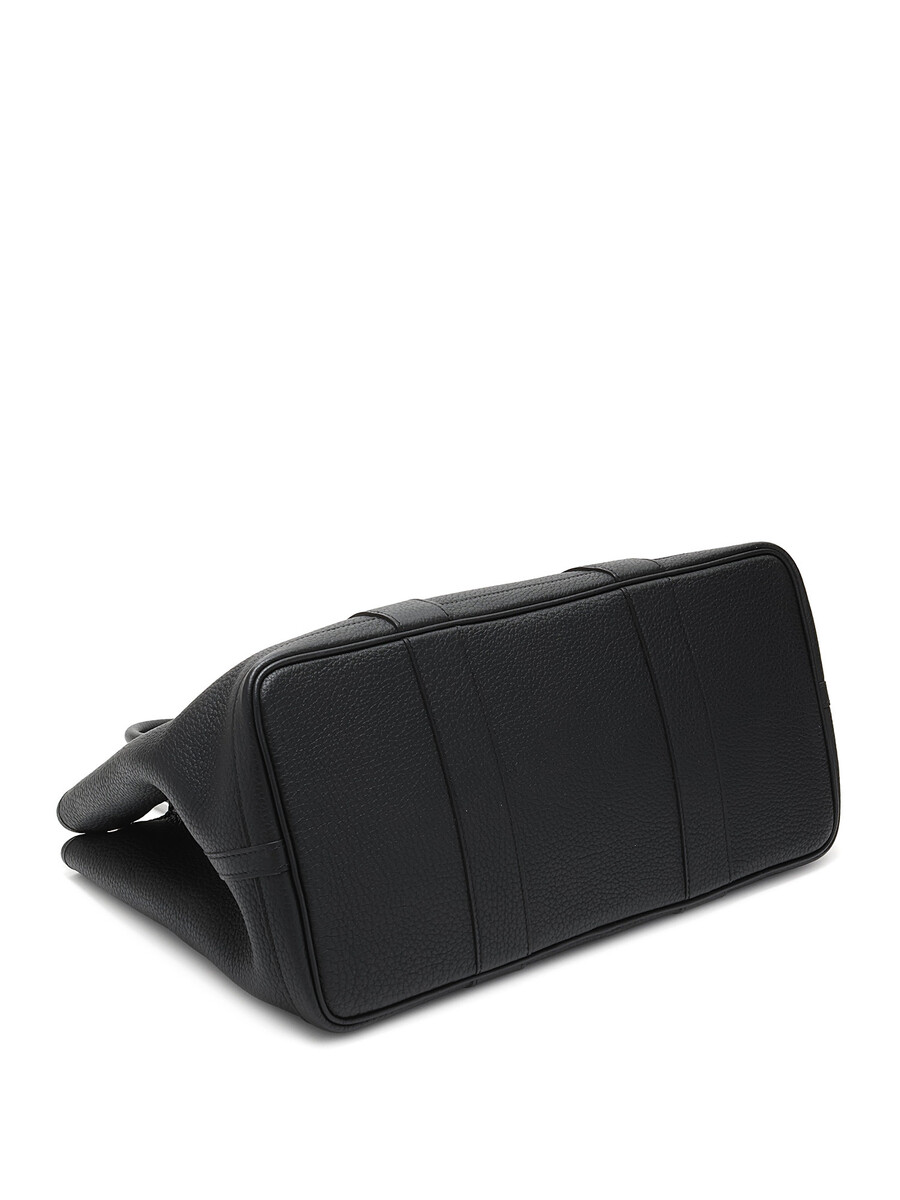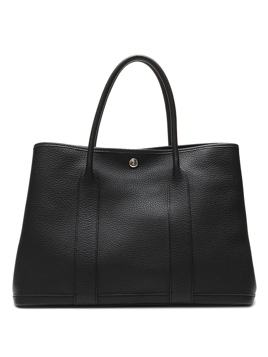 Tote bag in black grained leather featuring snap closure and double leather handles. Silver-tone hardware. With dust bag.