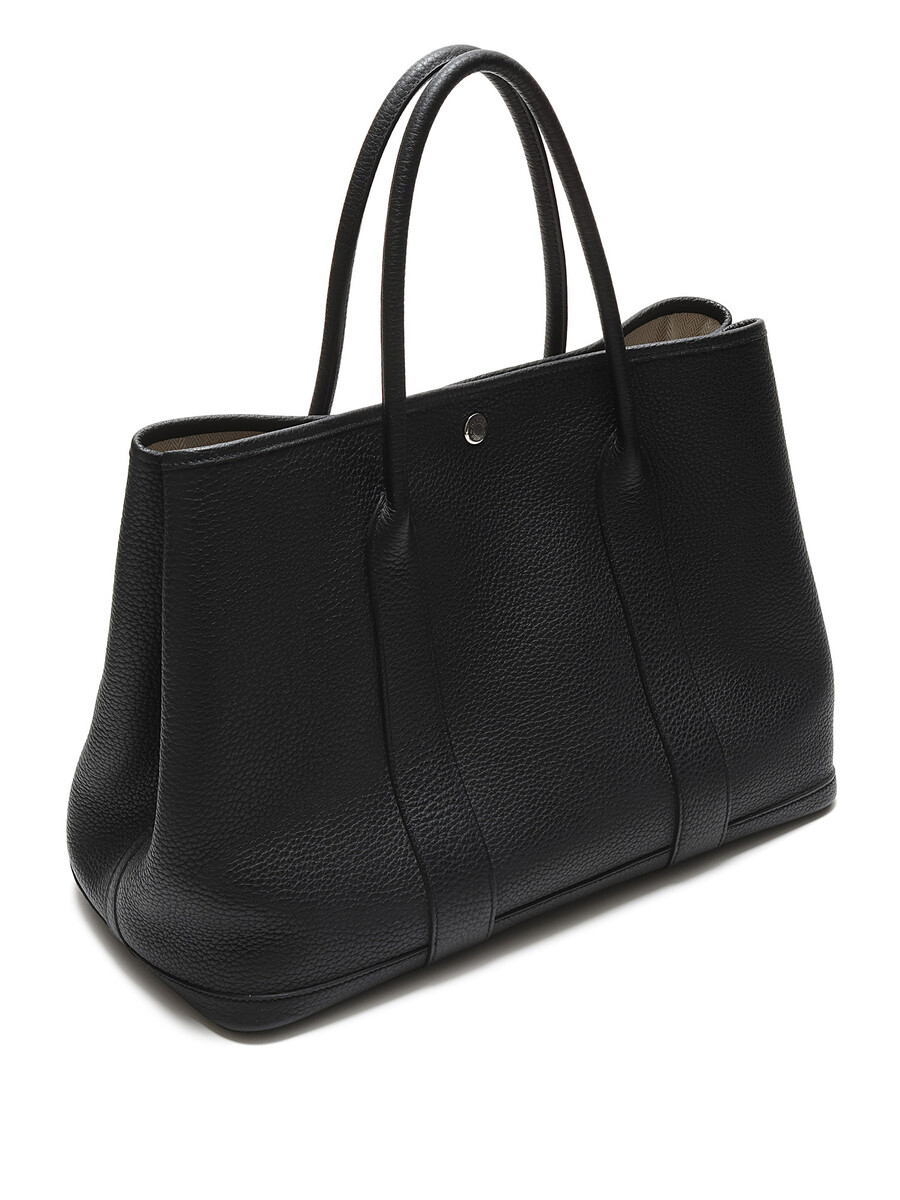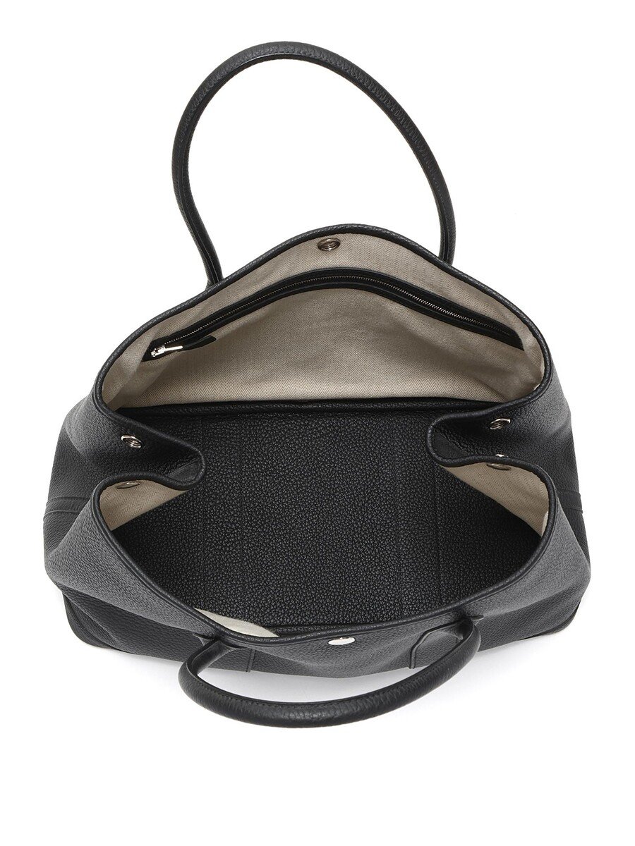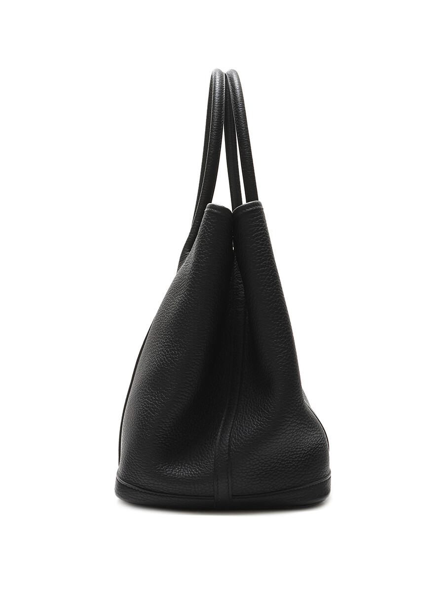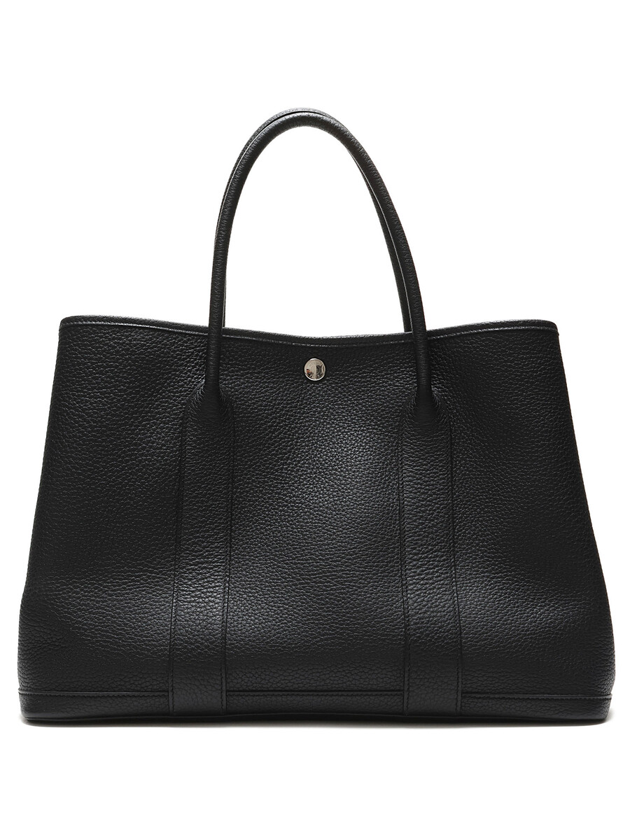 Tote bag in black grained leather featuring snap closure and double leather handles. Silver-tone hardware. With dust bag.