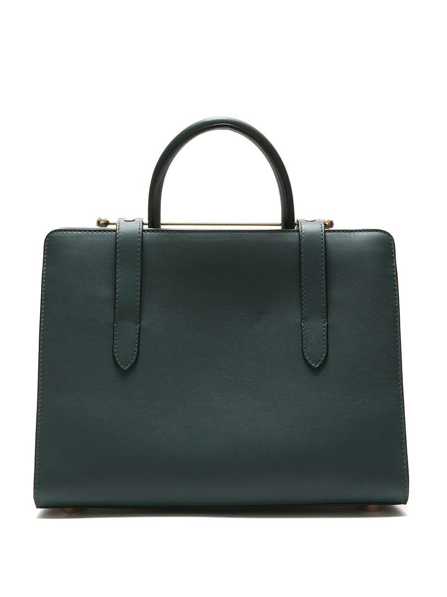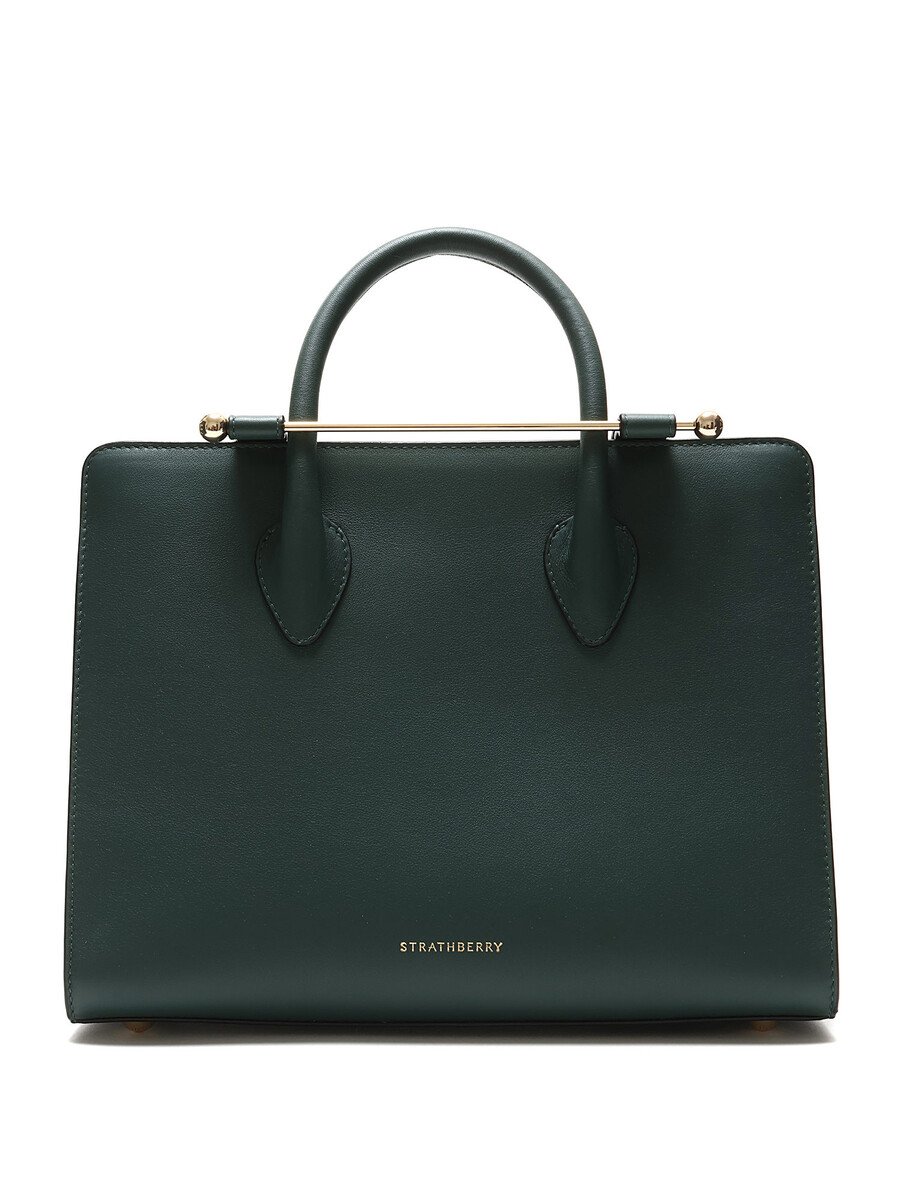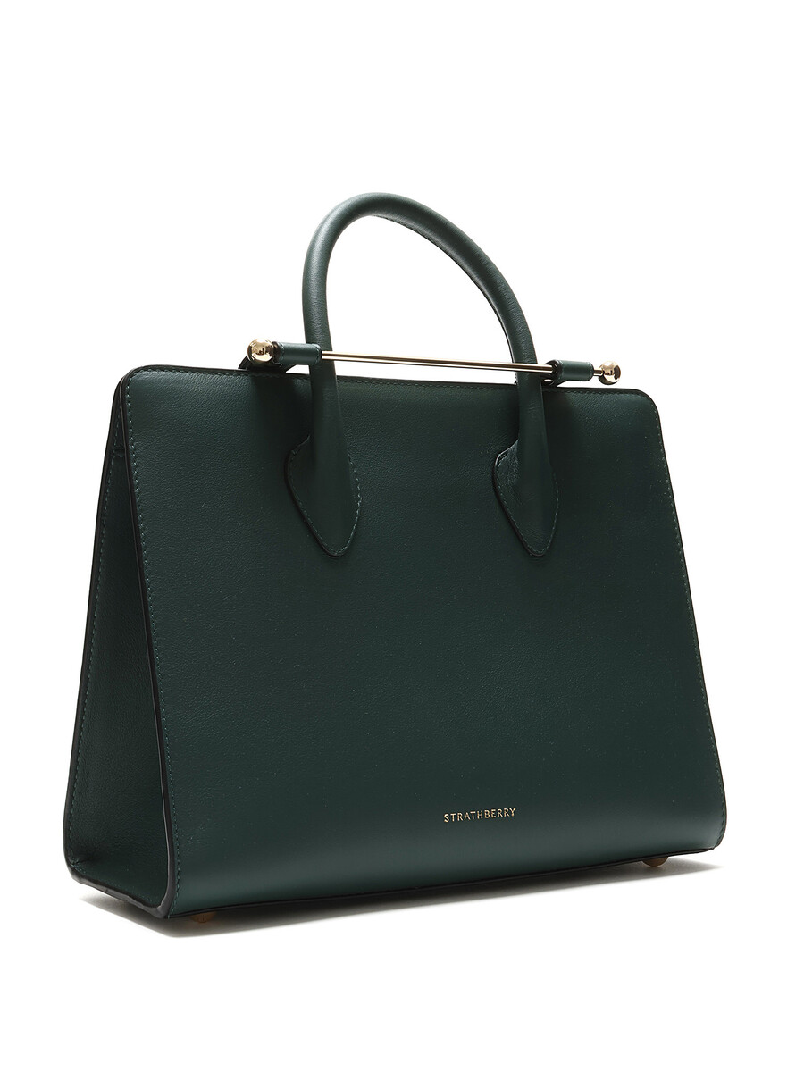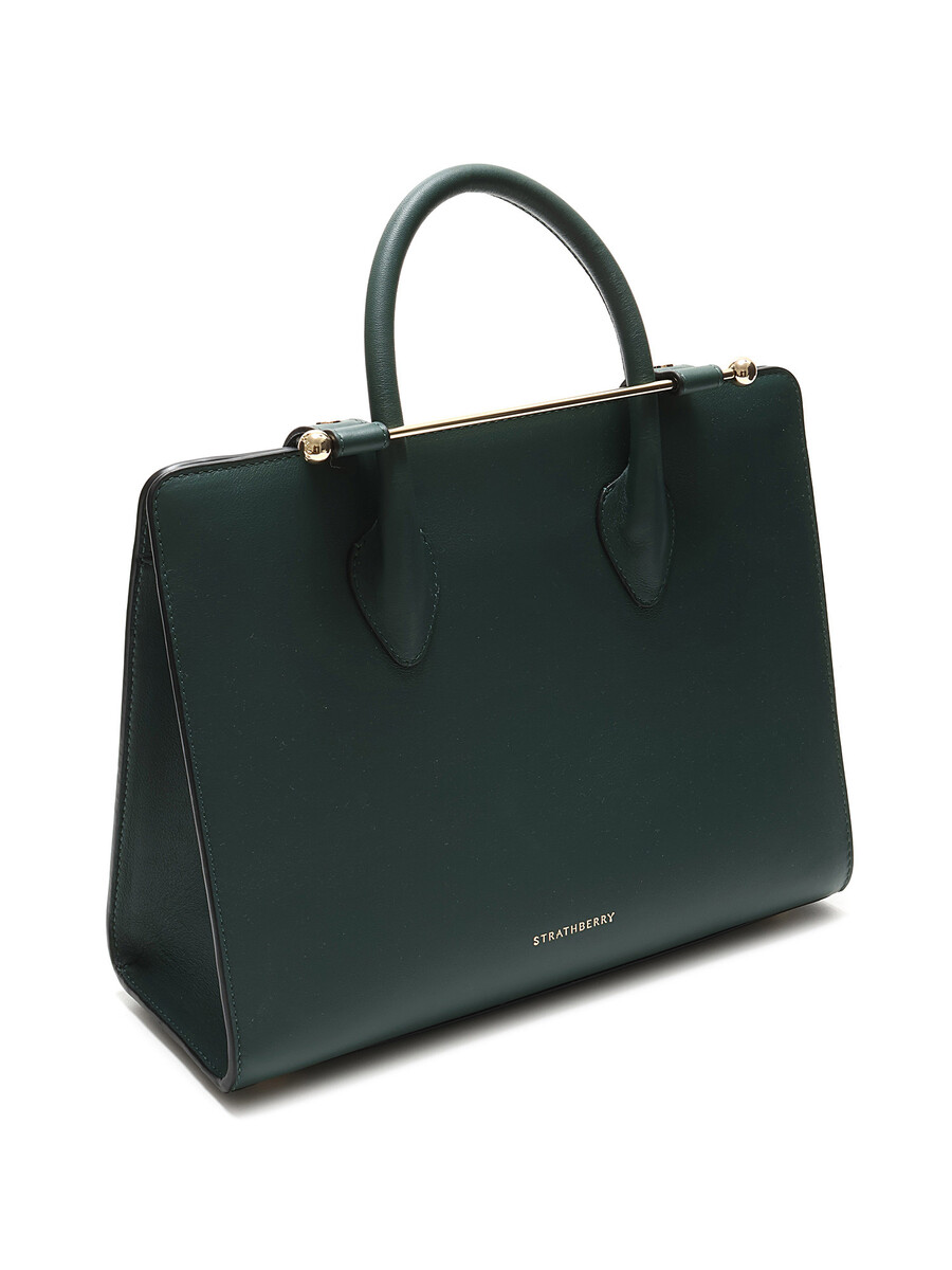 Teal leather tote bag with signature bar closure. Top handles with leather trims. Gold-tone hardware.